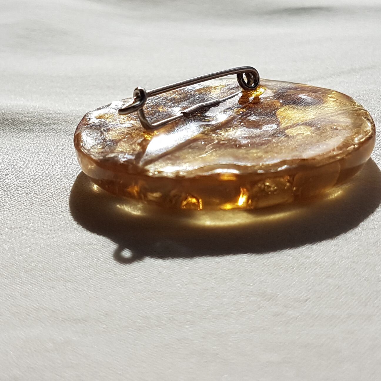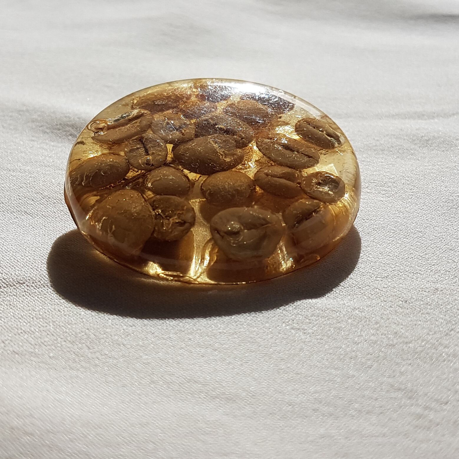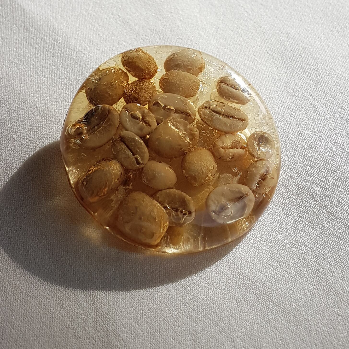 焙煎される前のコーヒーの生豆が閉じ込められたブローチです。
