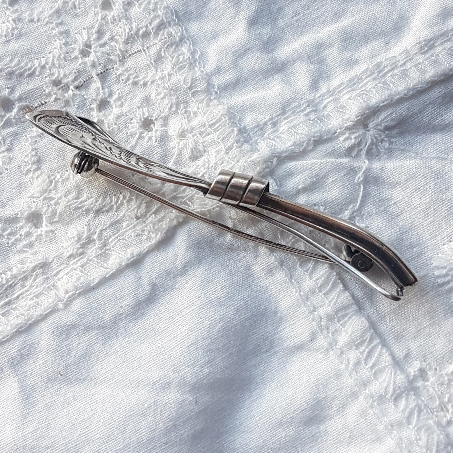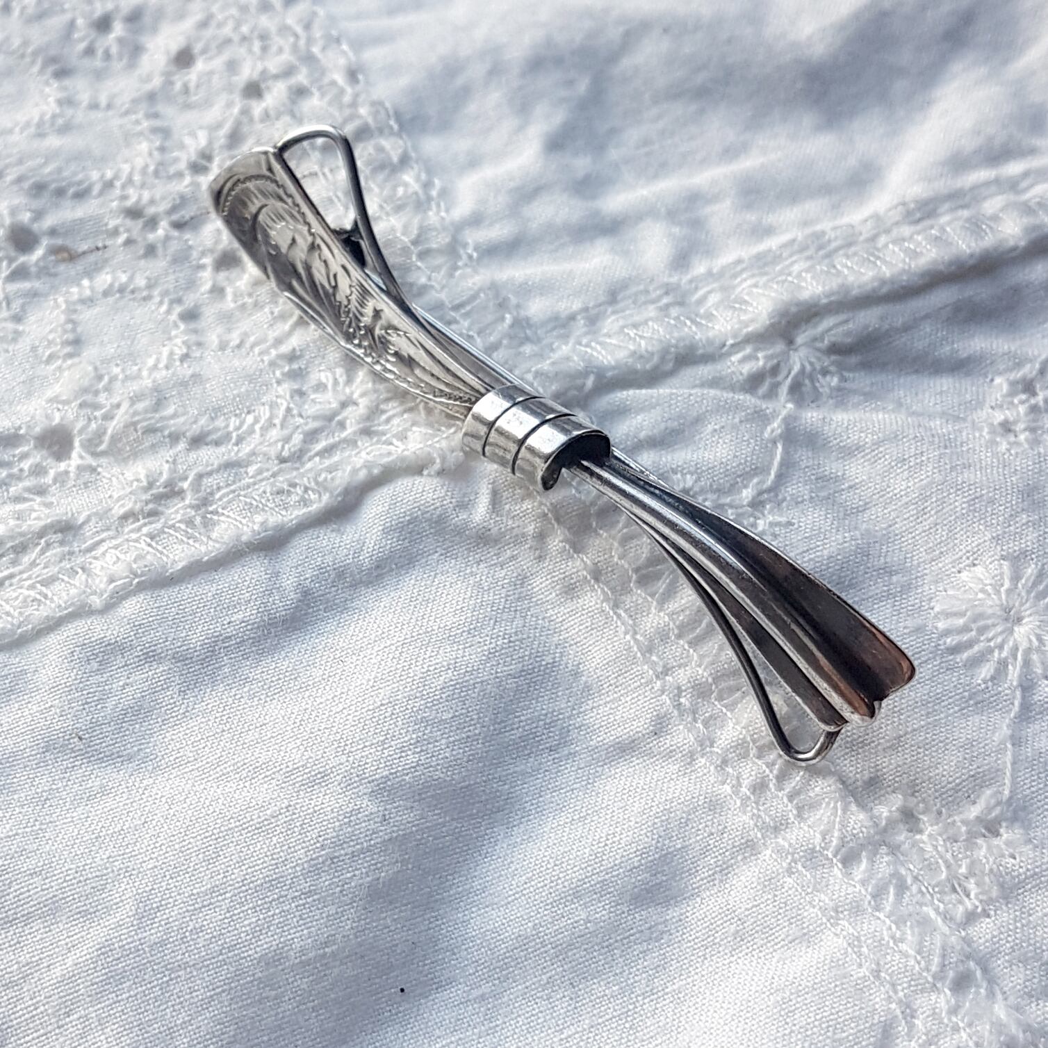 繊細な手彫り柄が素敵なリボンのブローチです。