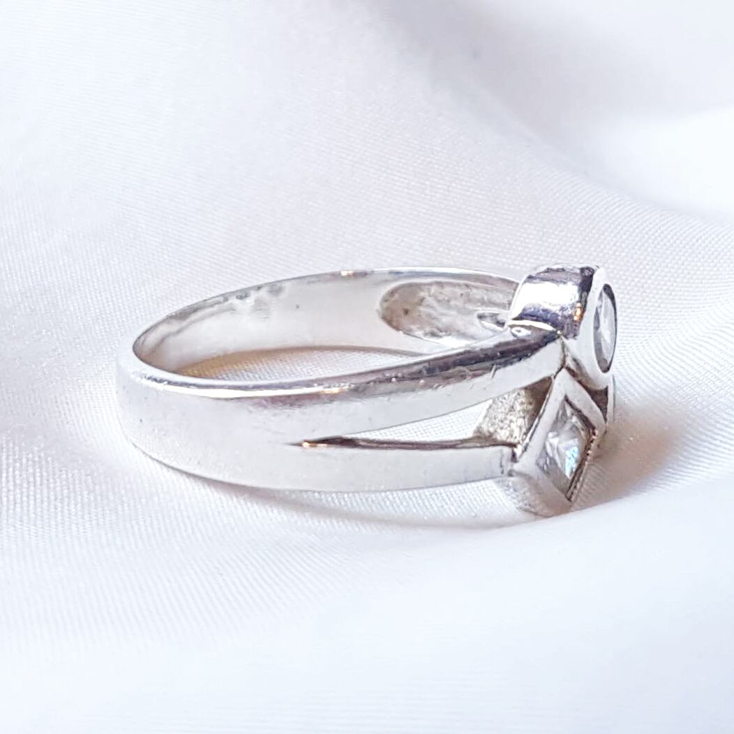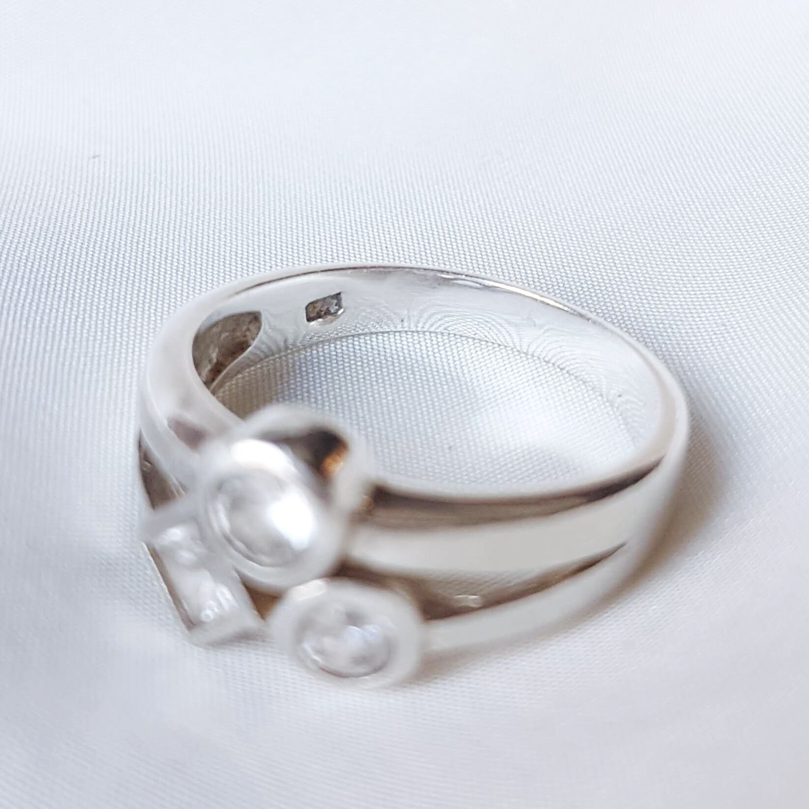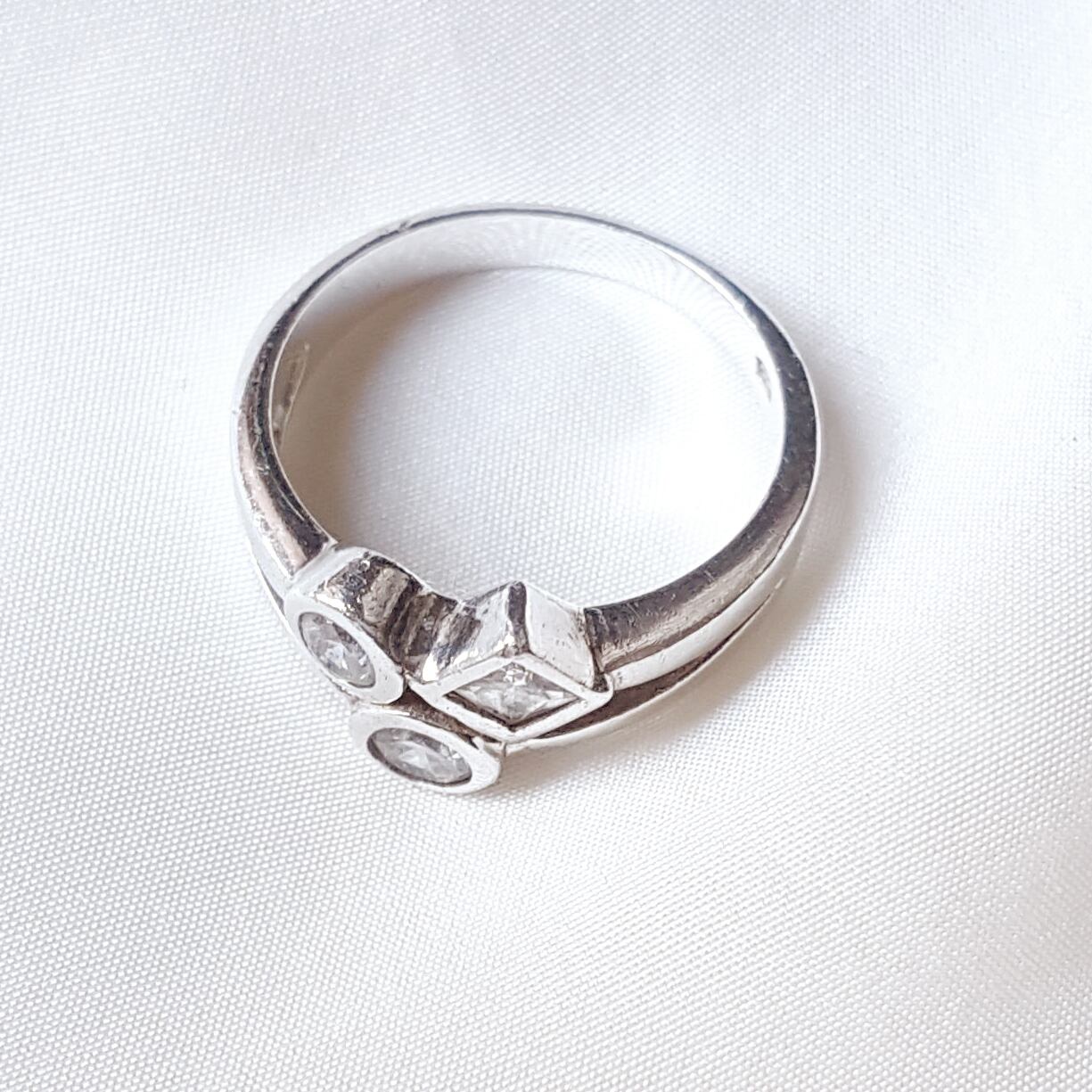 ジルコニアの充てがわれた図形が3つ隣合う、どこか楽しげな雰囲気の一品です。