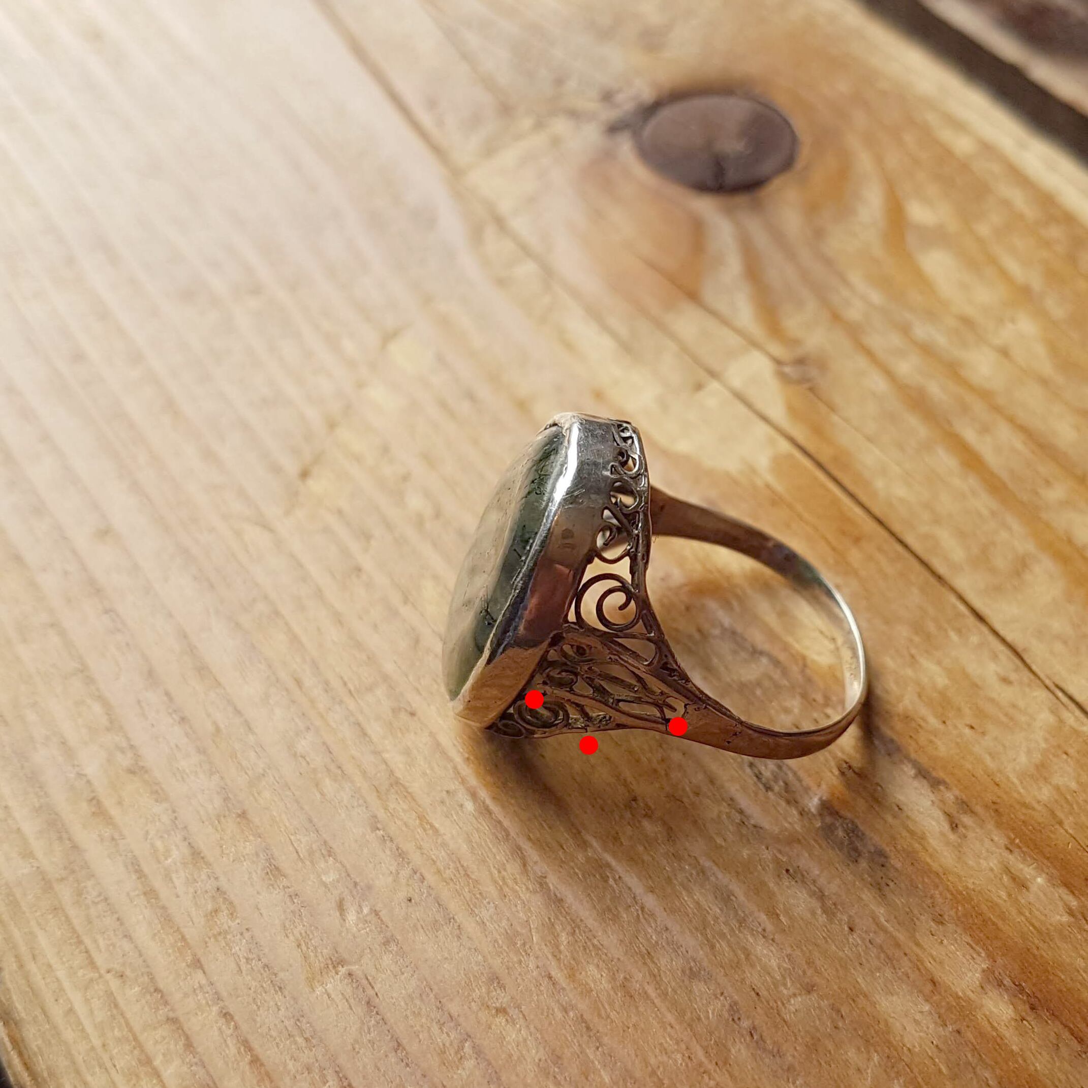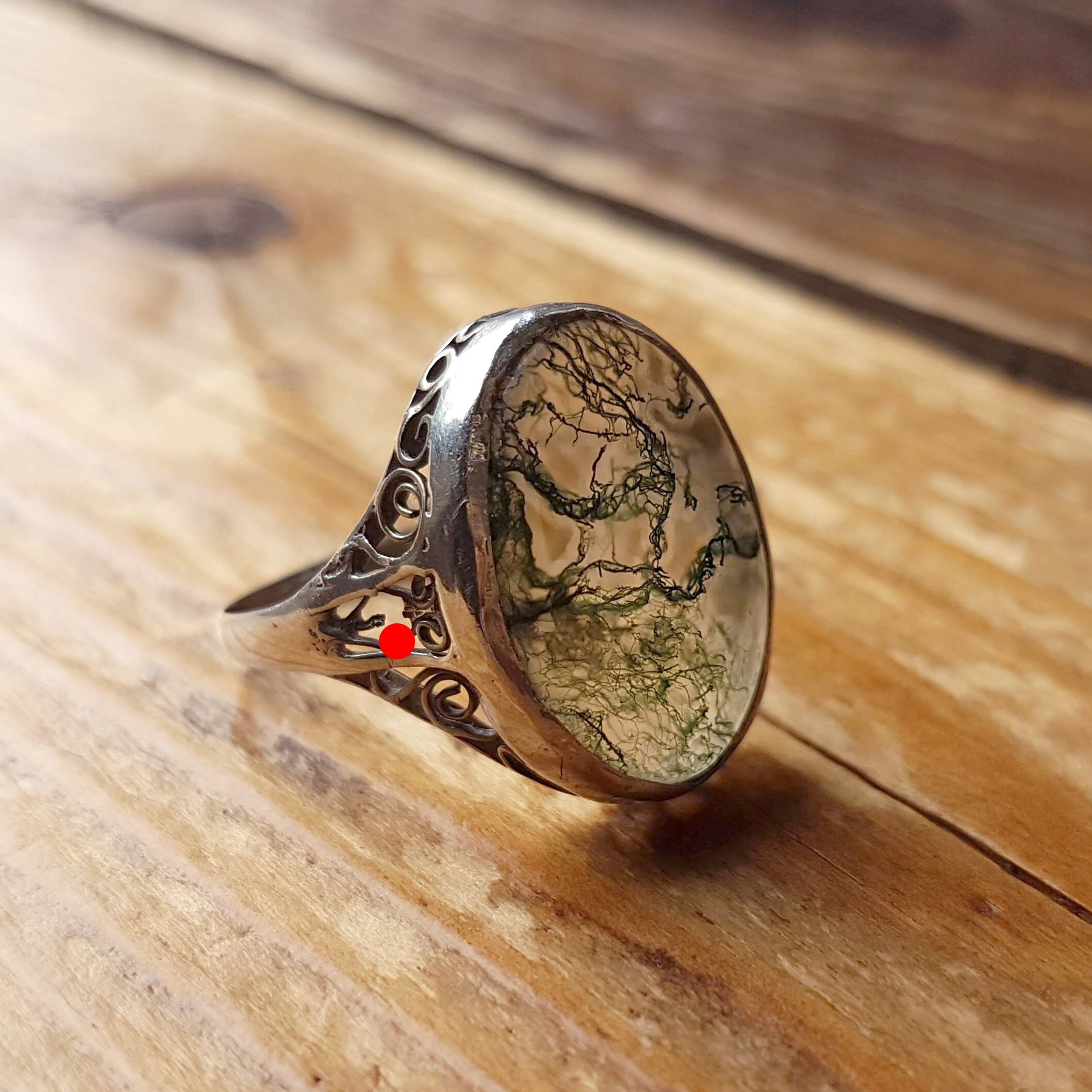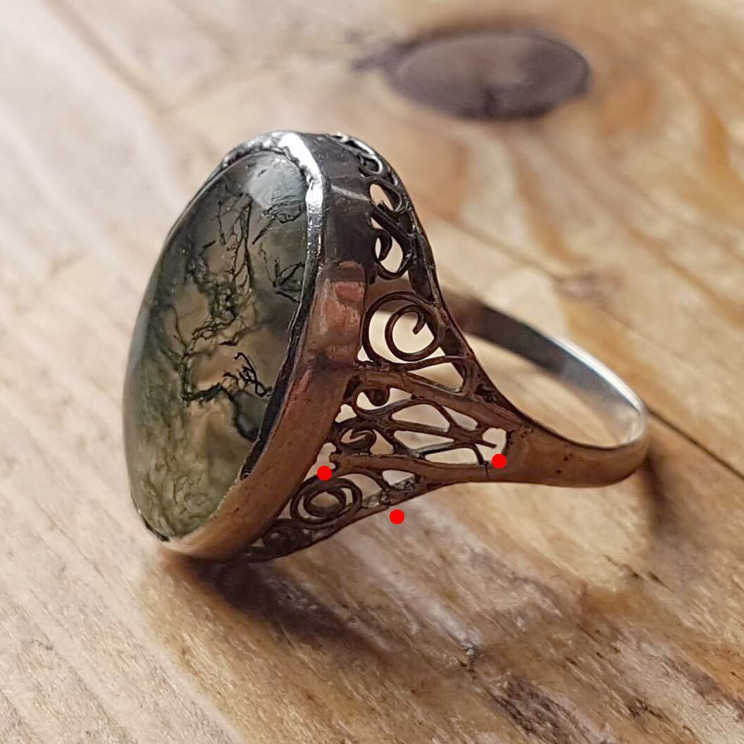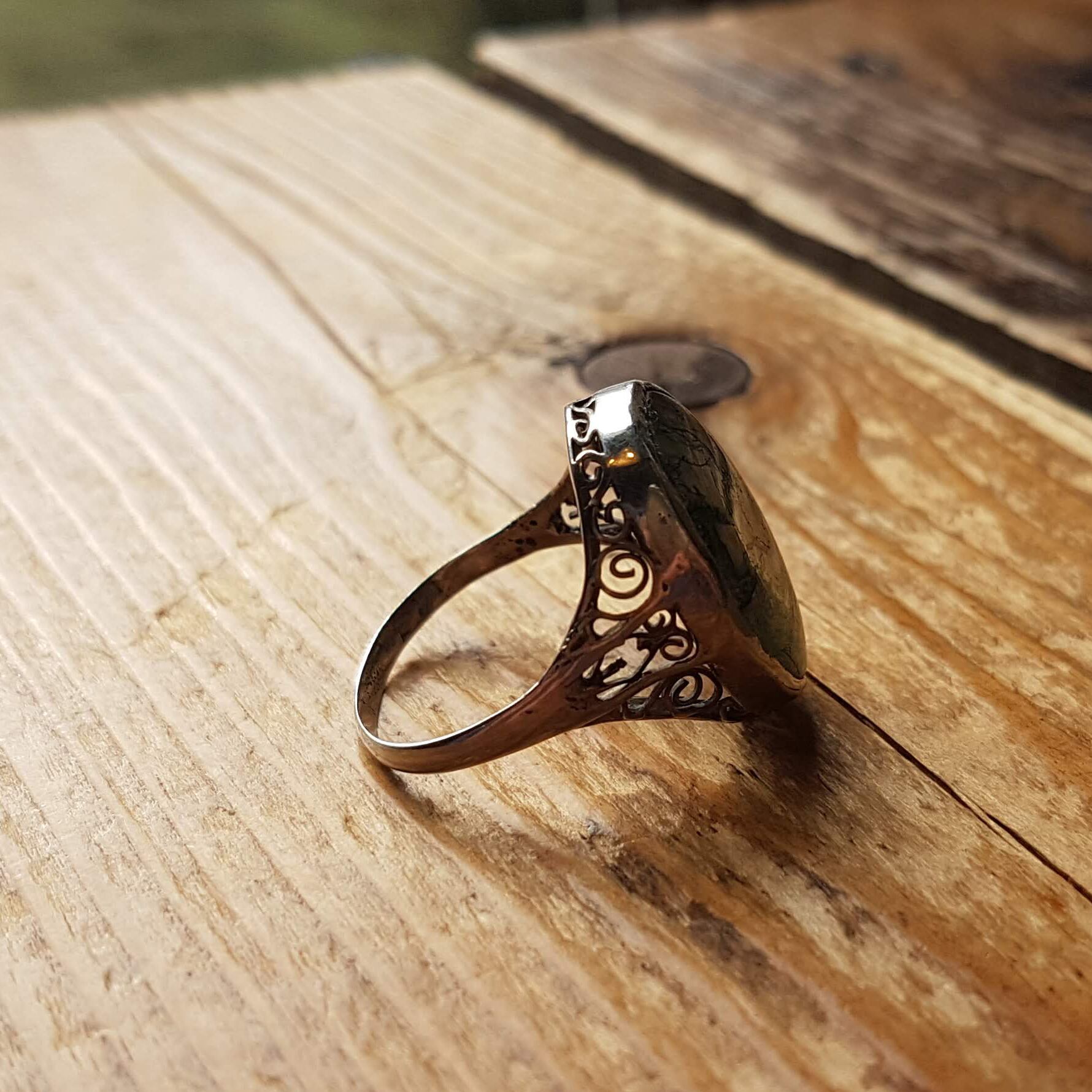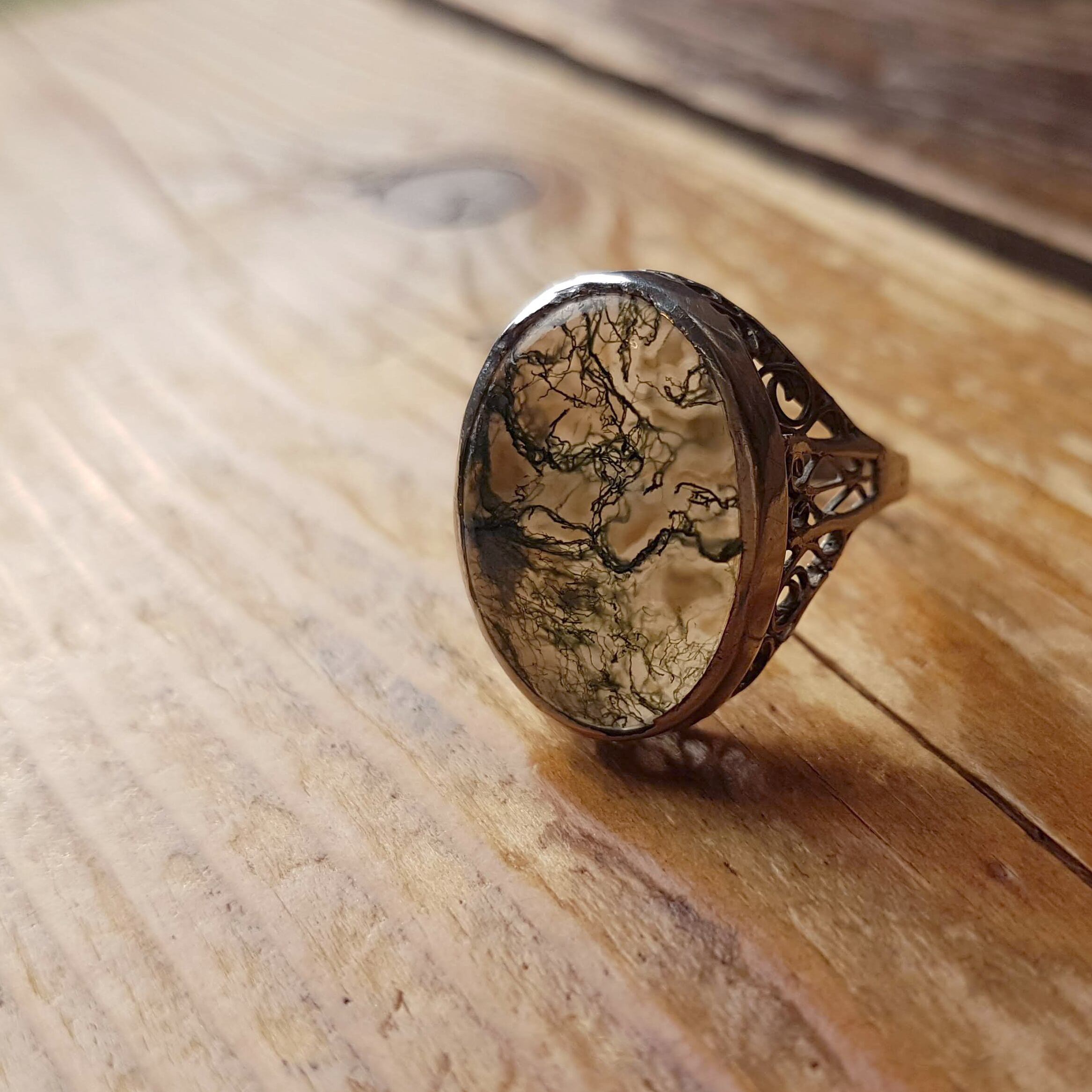 透き通ったタイプのモスアゲートの石がレース彫金の石台に施されたアンティーク製のシルバーリングです。