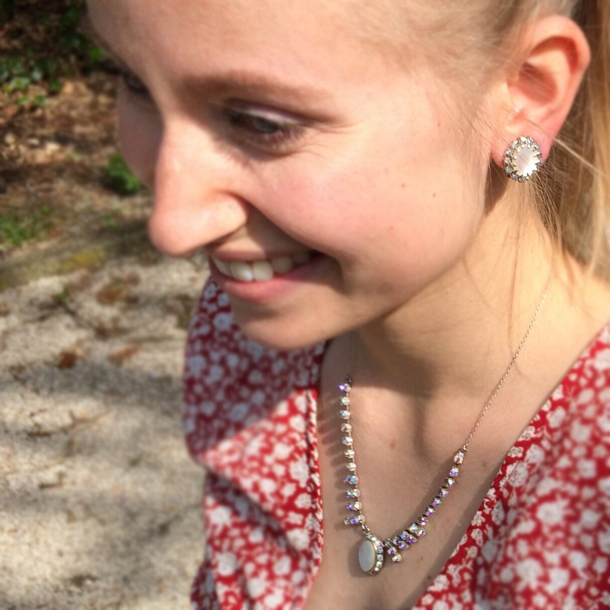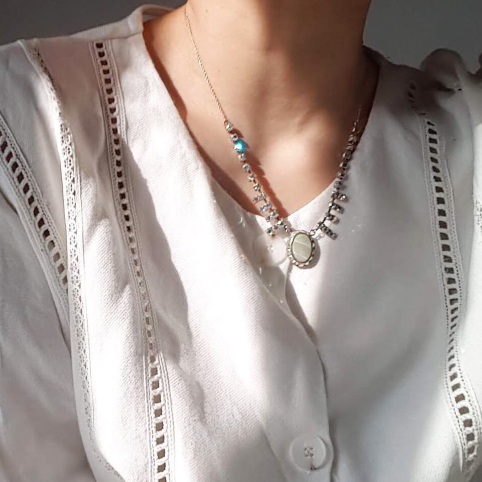 オーバル型の貝の周りをビジューが囲む、愛らしい雰囲気のアクセサリーです。