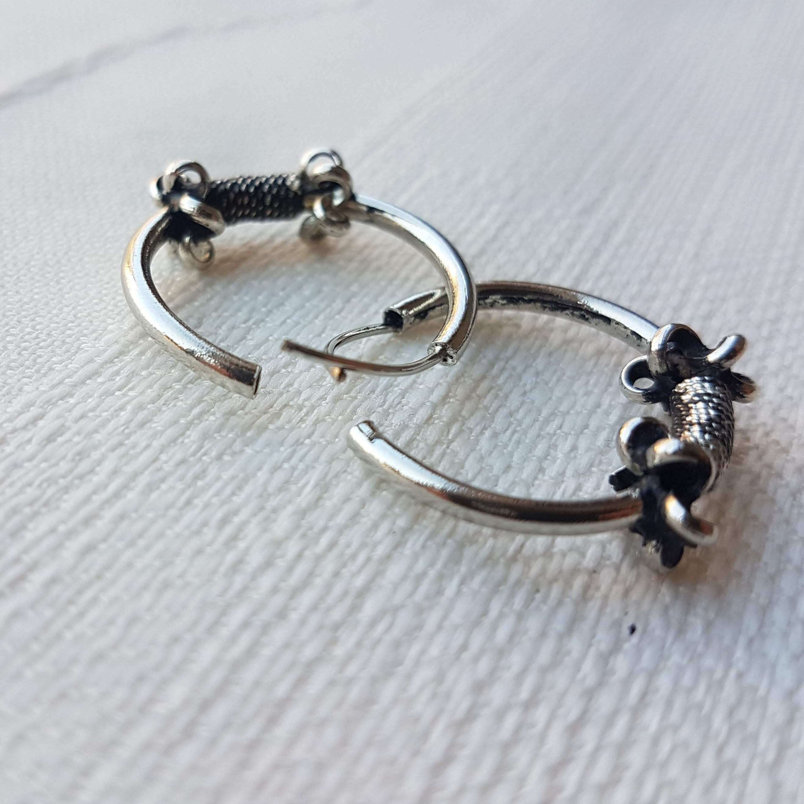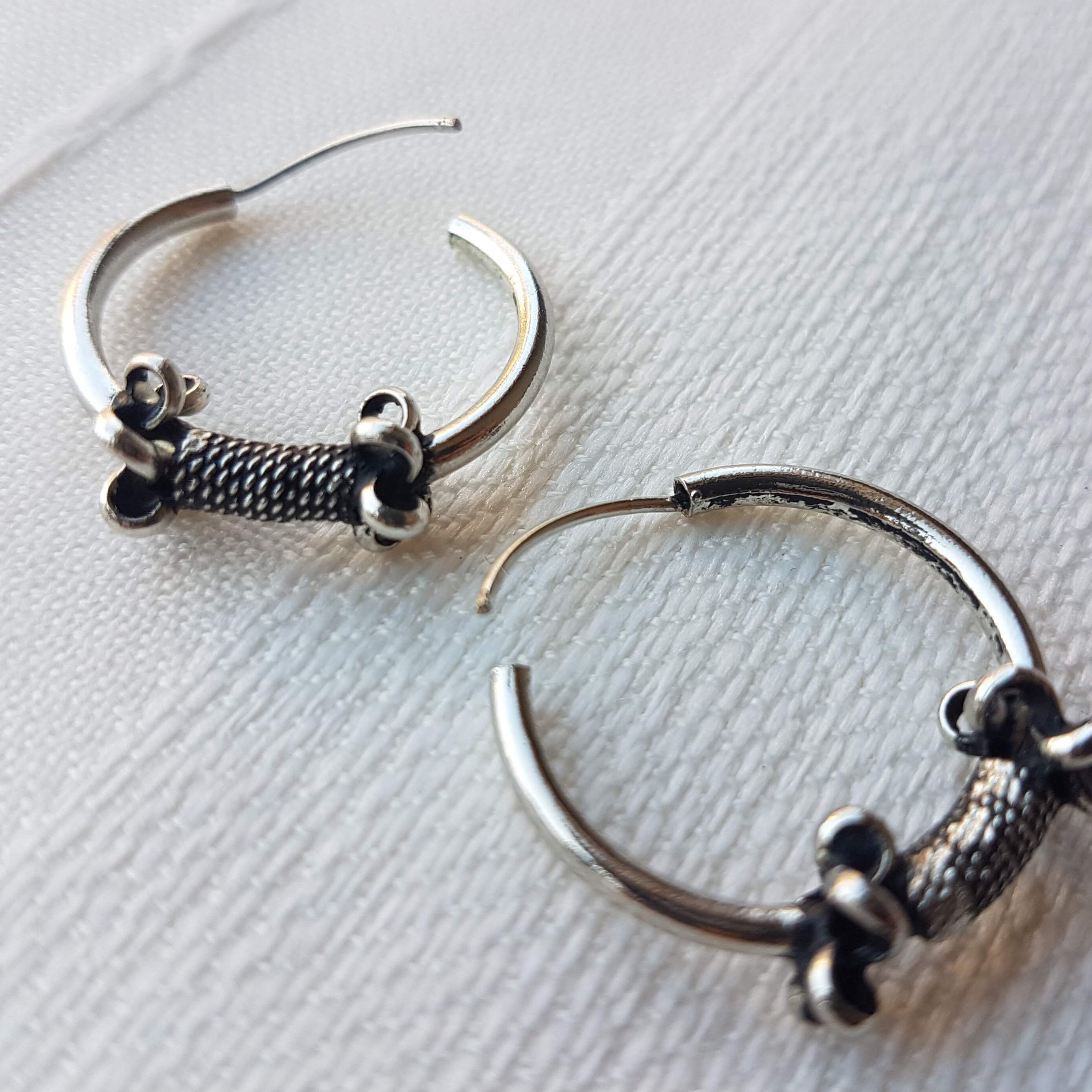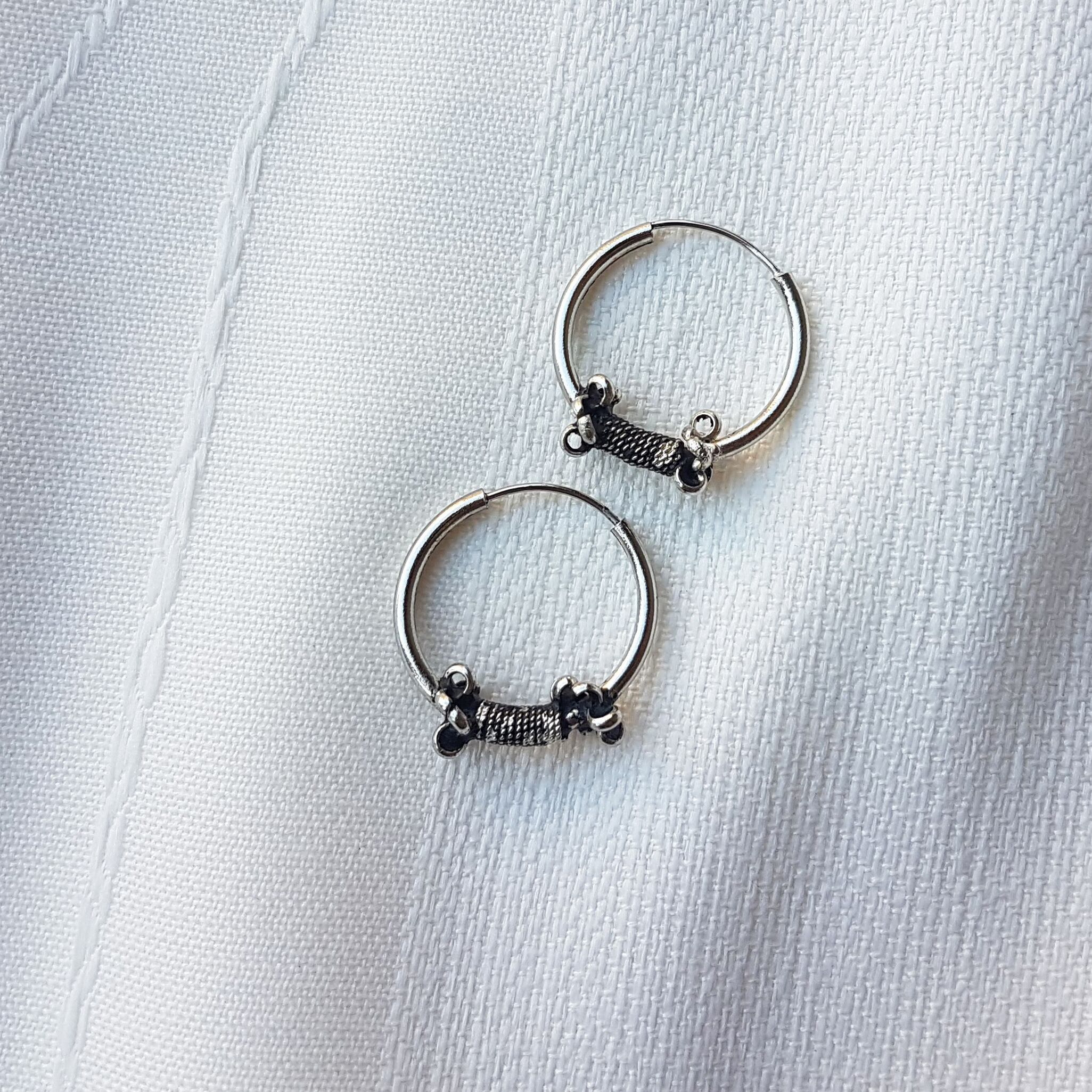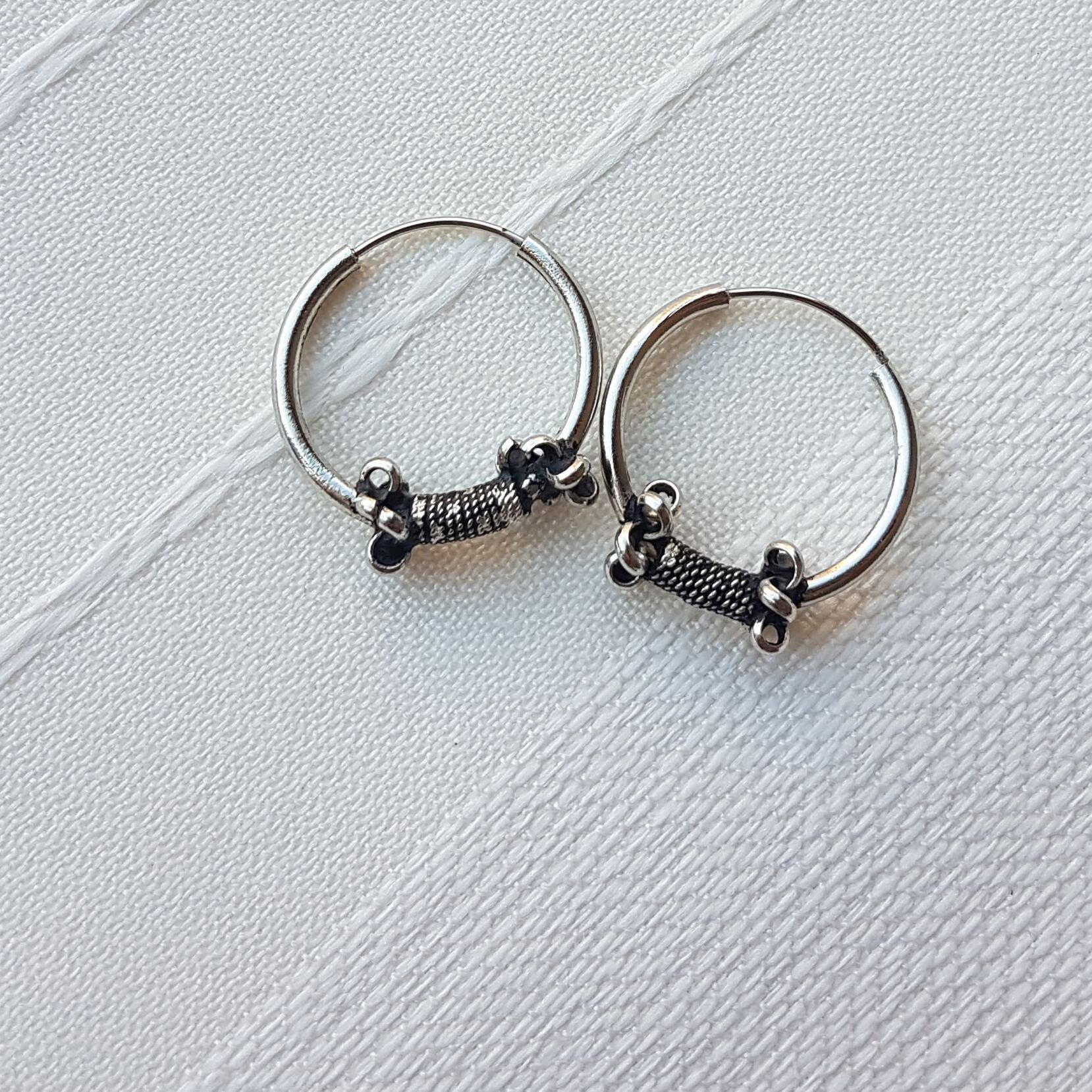 古い時代のピアスによく見られる、軸とフープ本体が繋がった留め具になっています。
