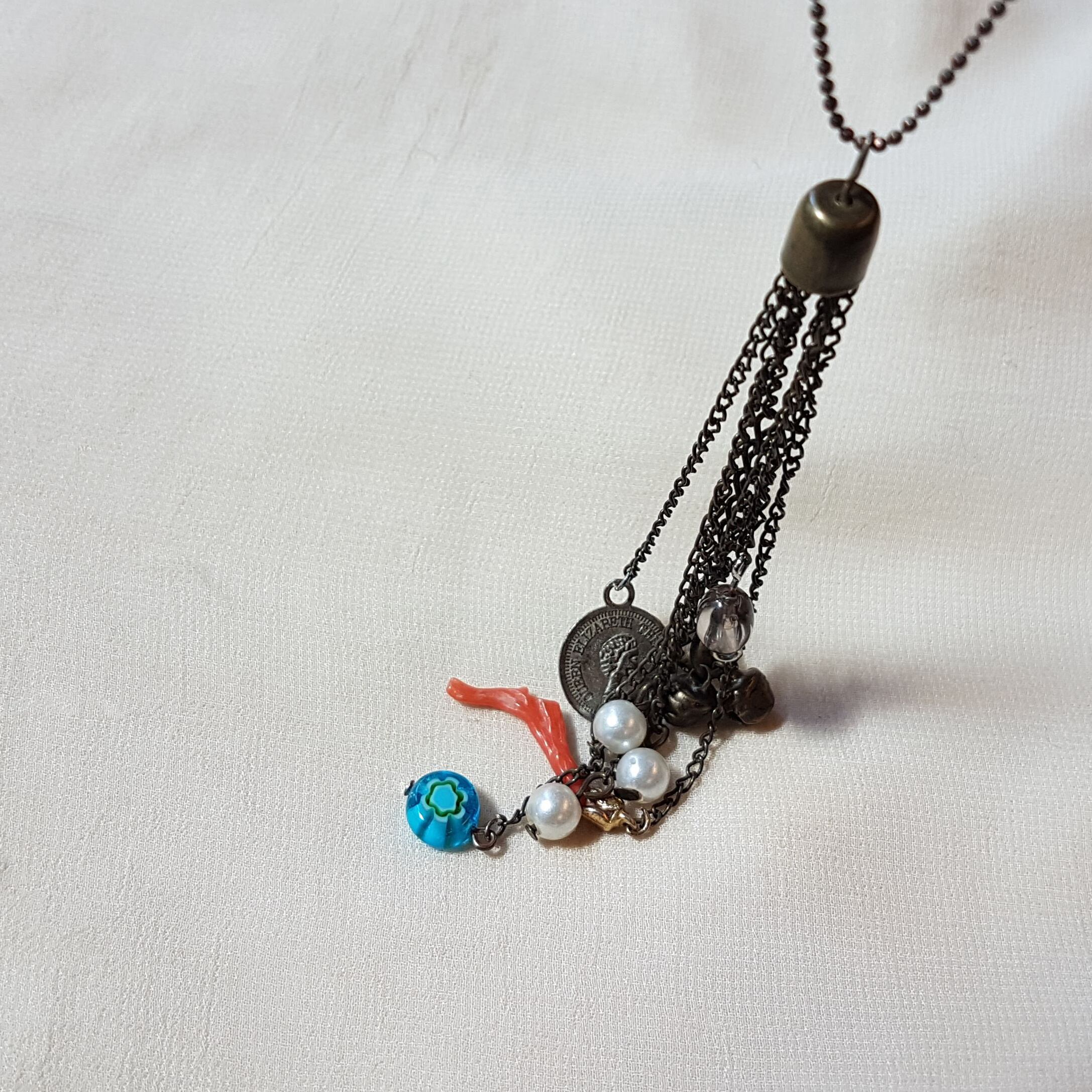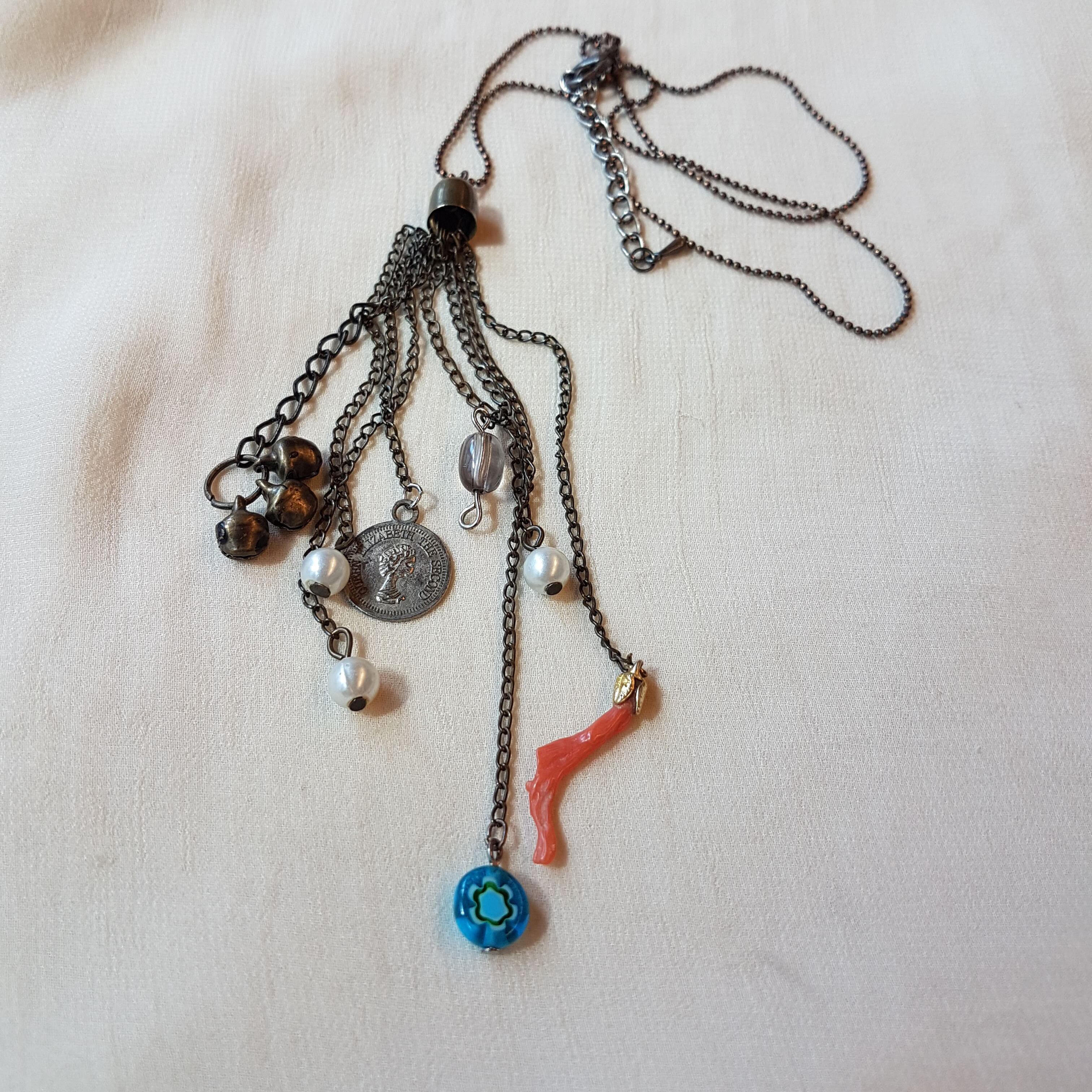 涼しげなお花のガラスビーズに、珊瑚のモチーフや鈴・パールビーズなどが揺れる真鍮製のネックレスです。