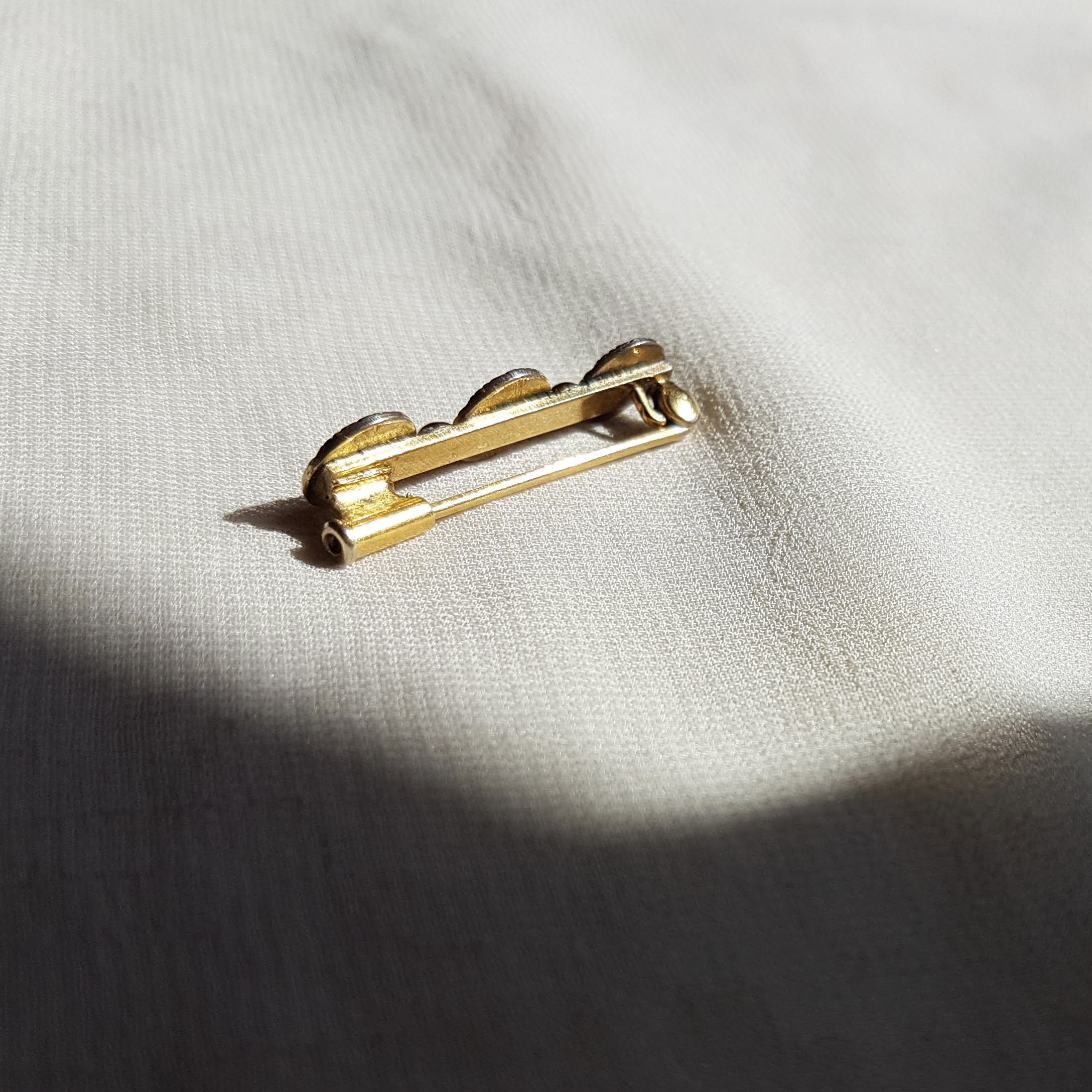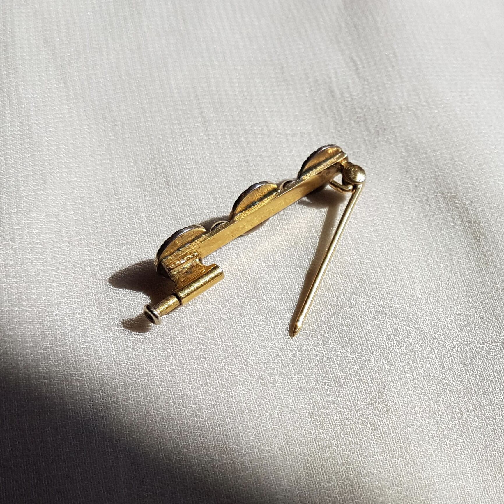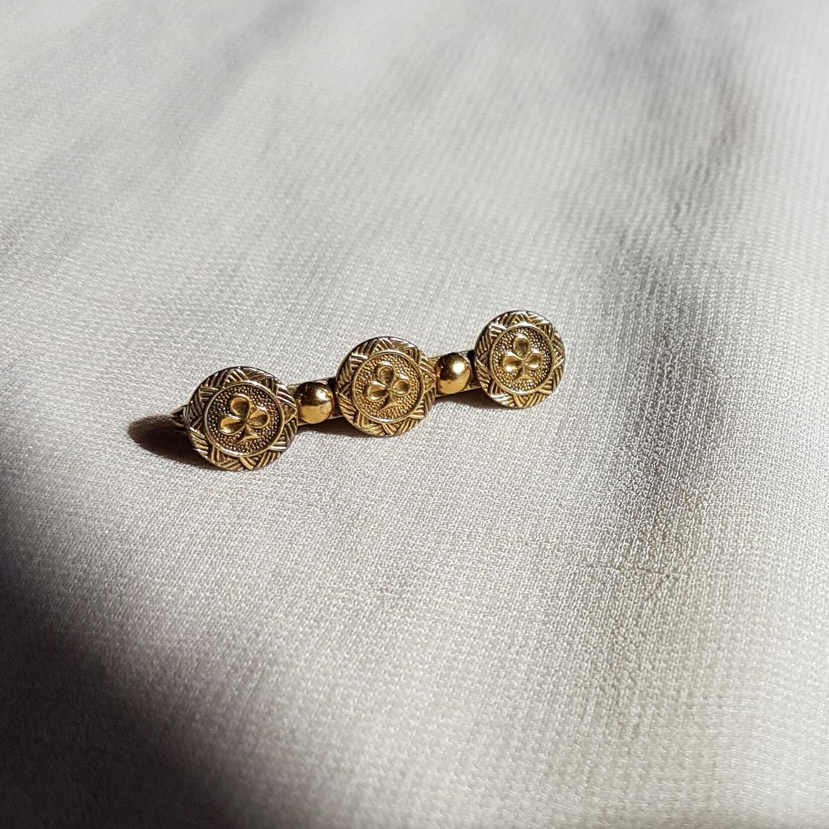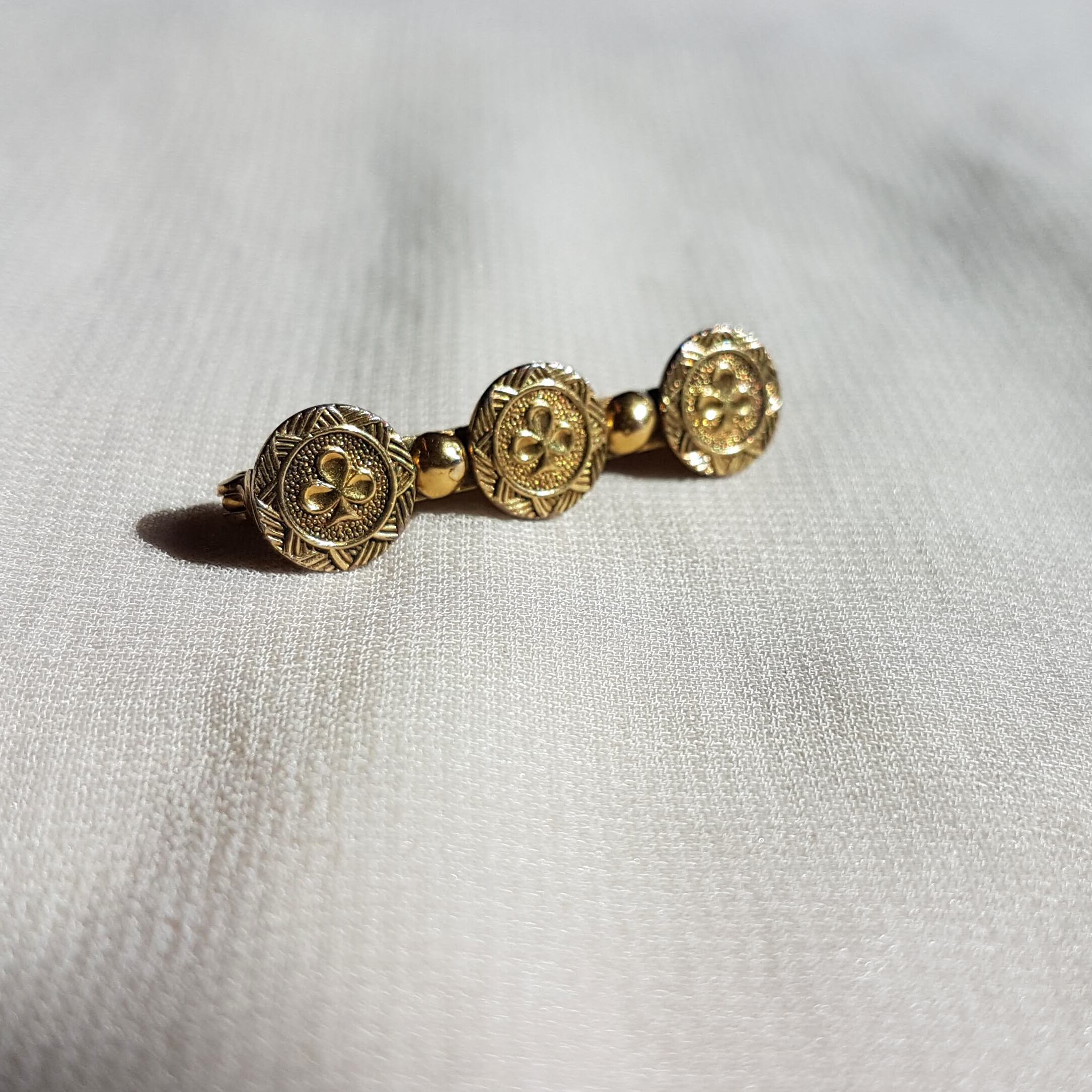 三つ葉のクローバーが描かれたゴールドトーンのブローチです。