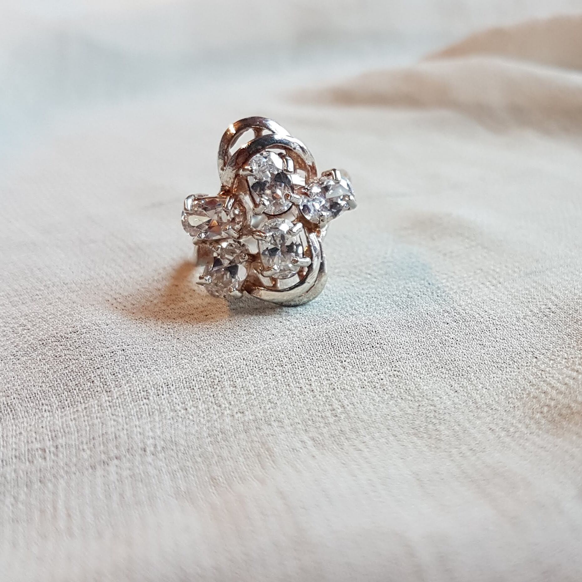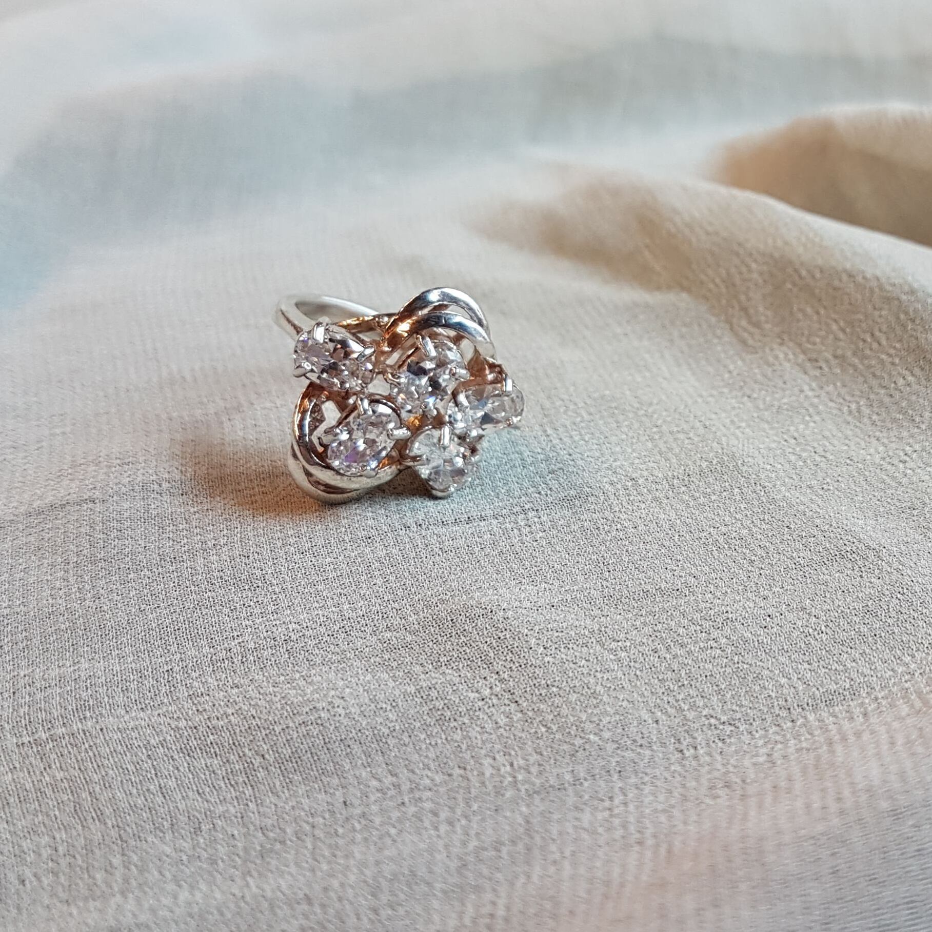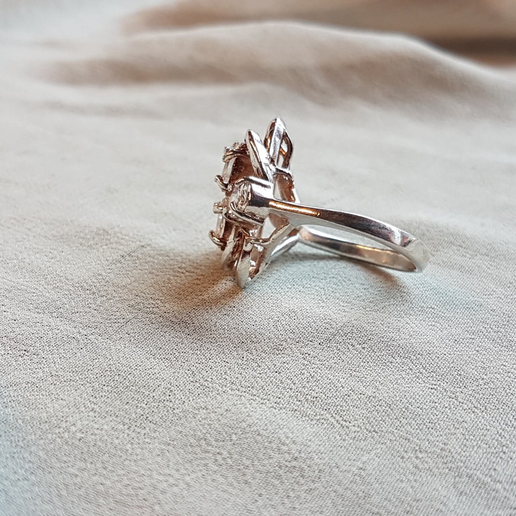 お花の様なモチーフに沿ってビジューが施されたスターリングシルバー製のデザインリングです。