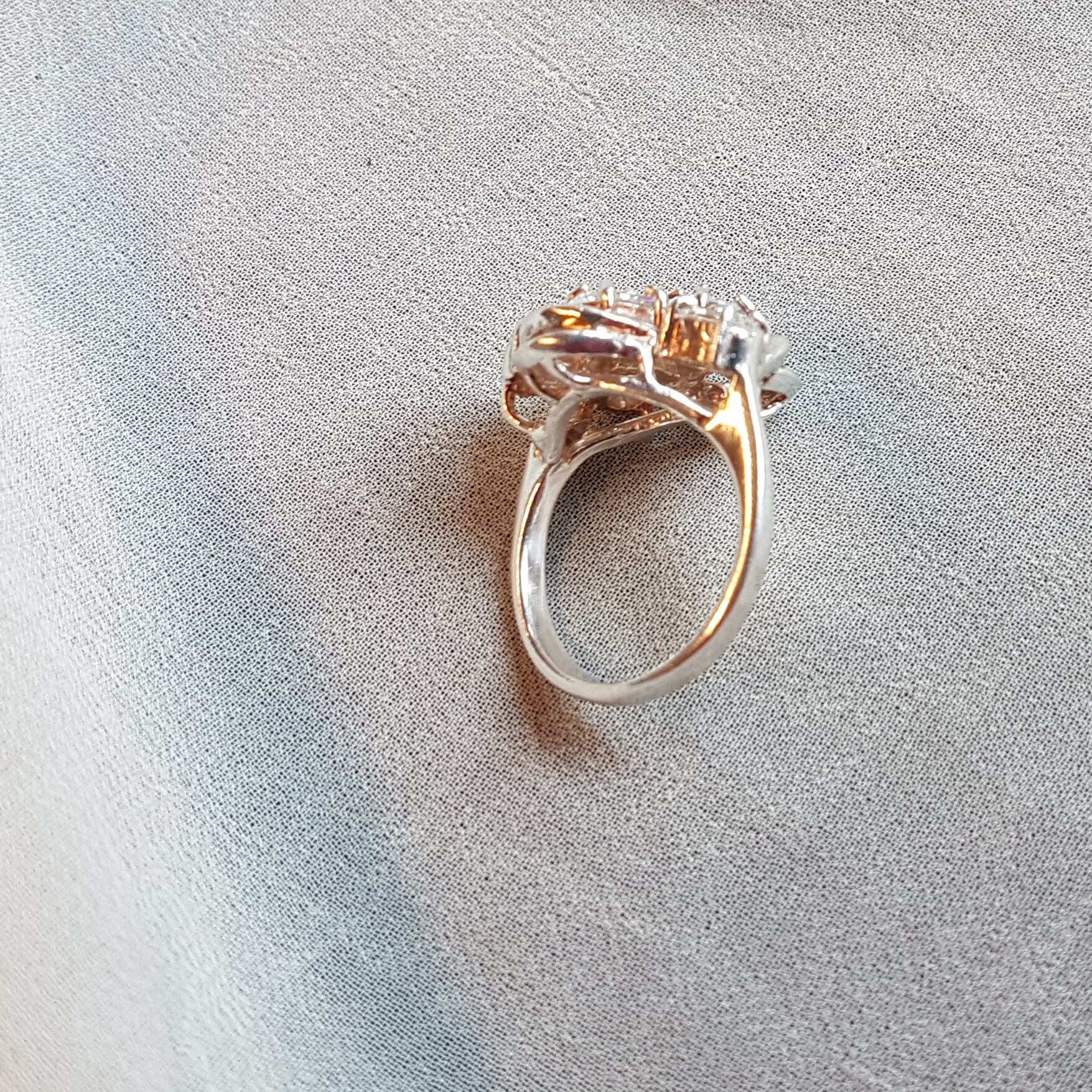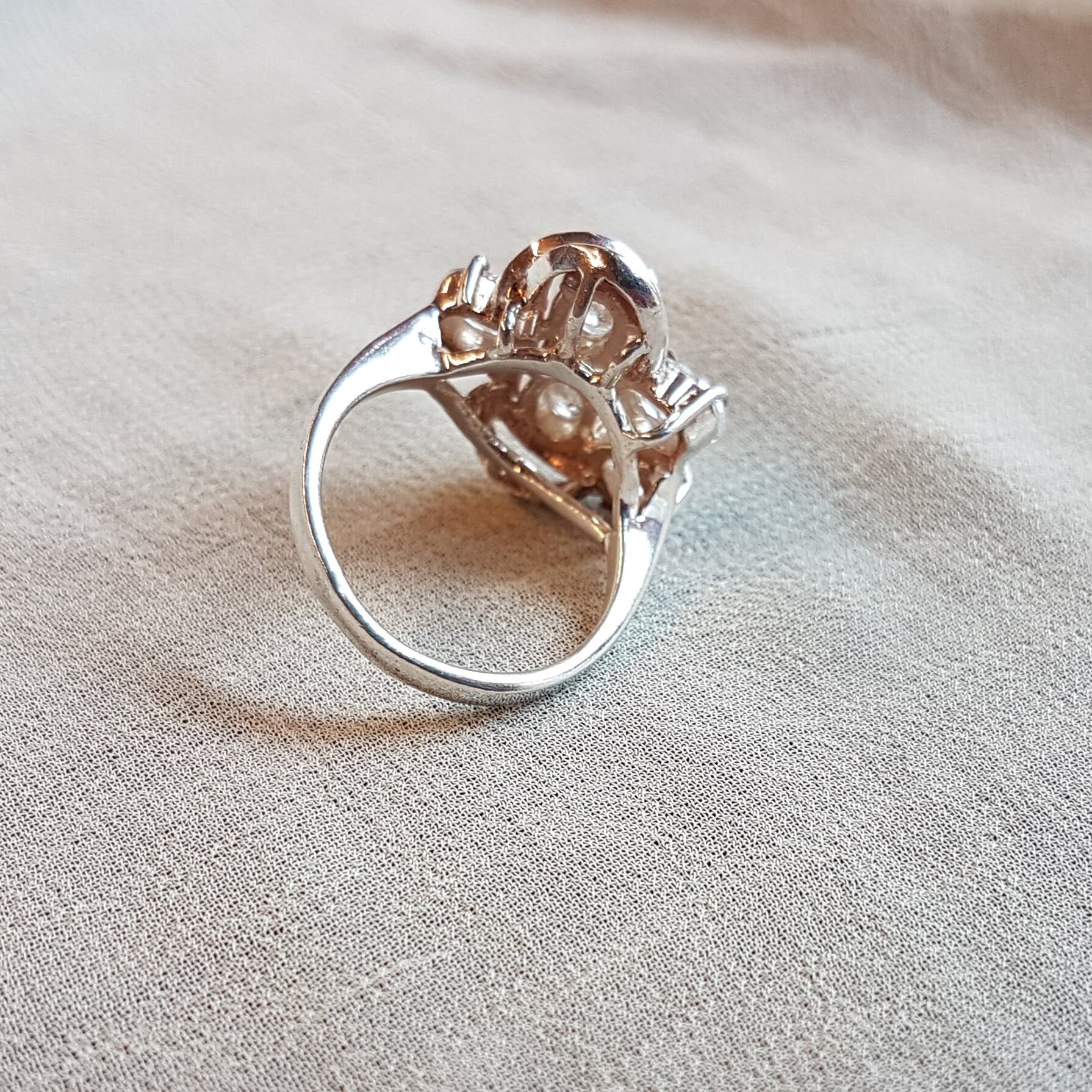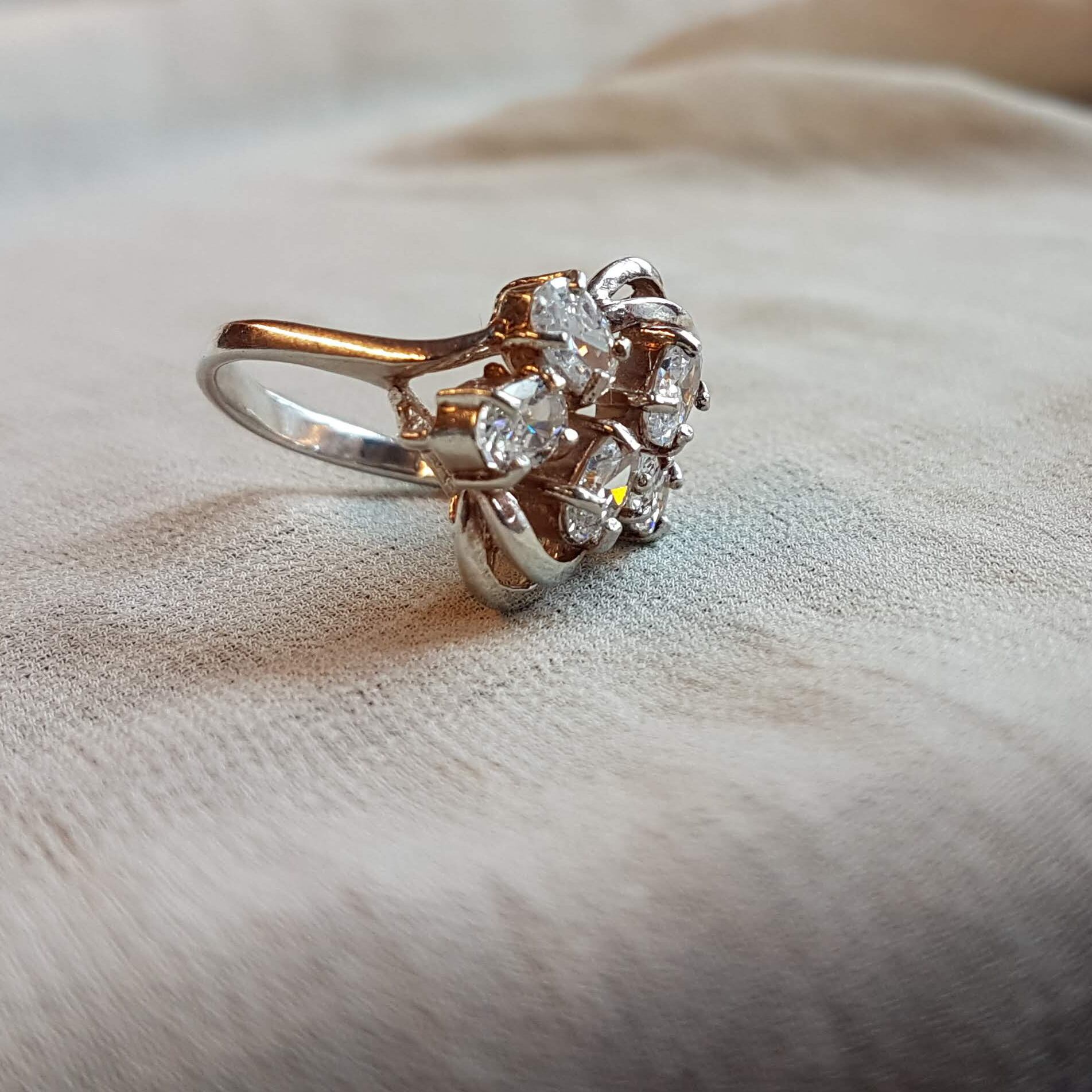 お花の様なモチーフに沿ってビジューが施されたスターリングシルバー製のデザインリングです。
