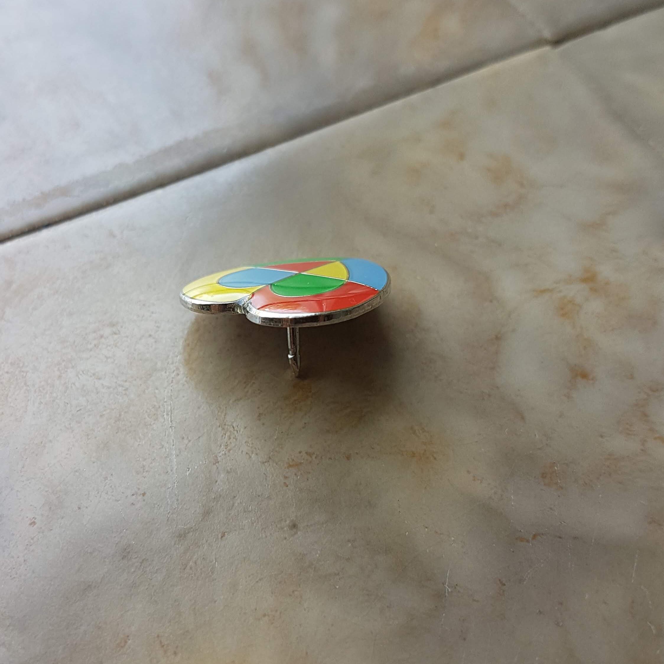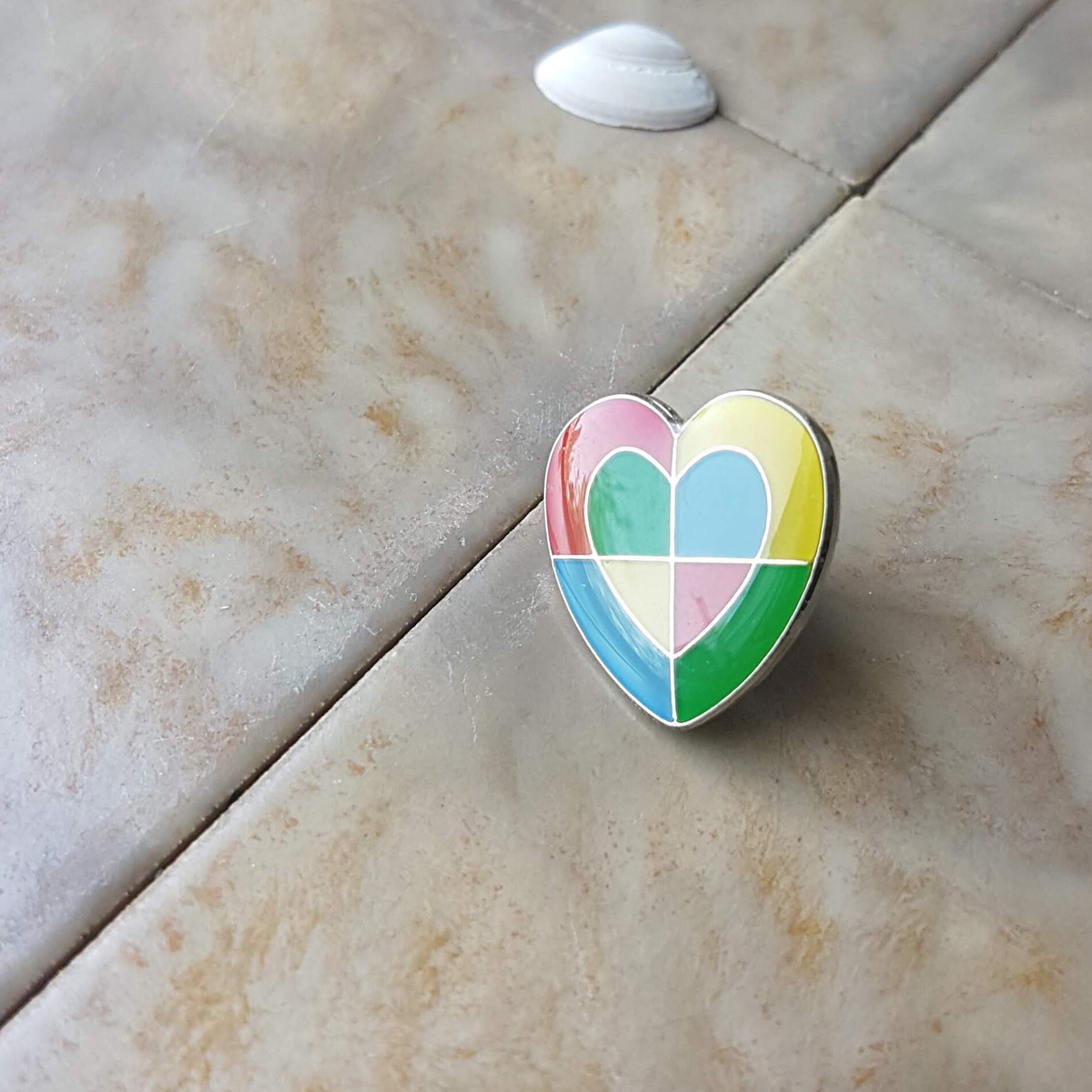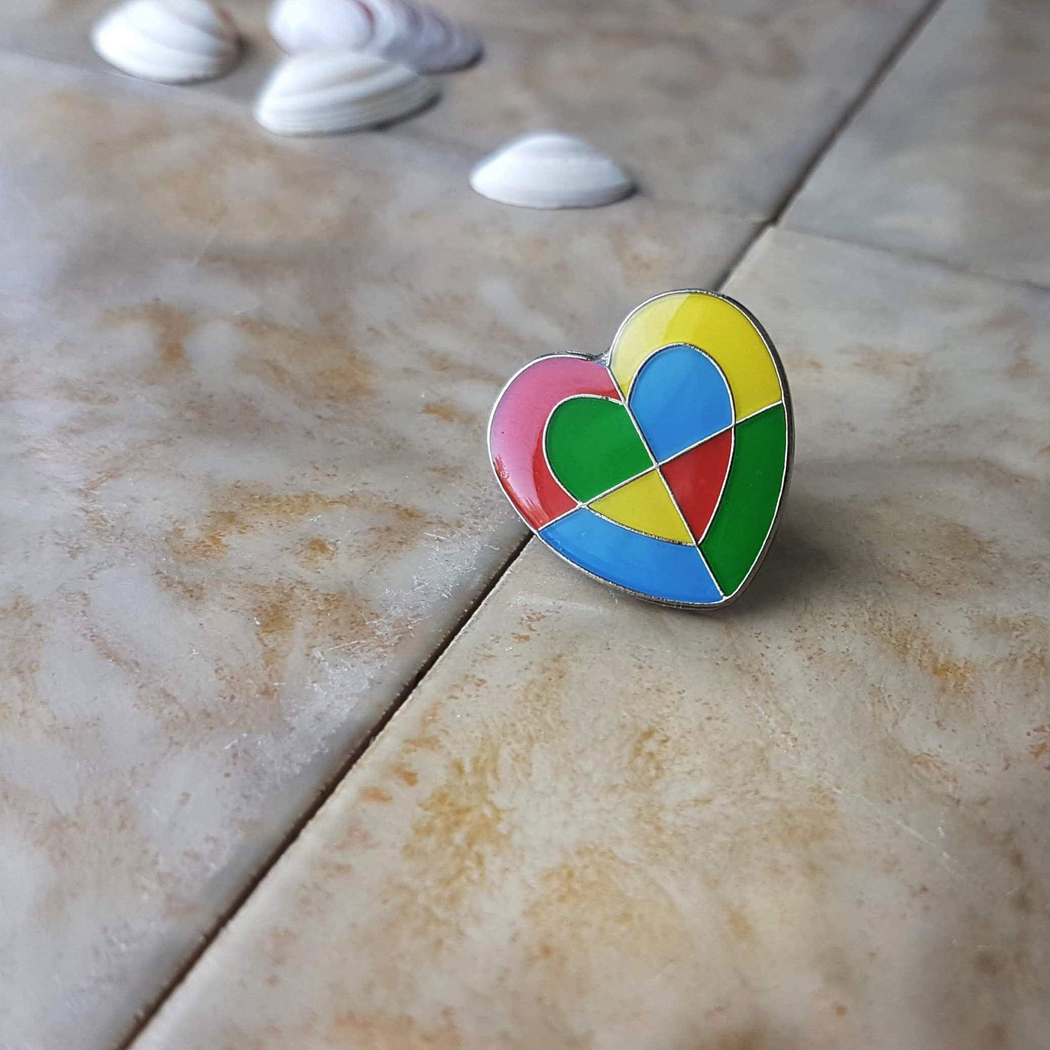 赤・青・黄・青の4色で構成されたハート形のピンバッチです。