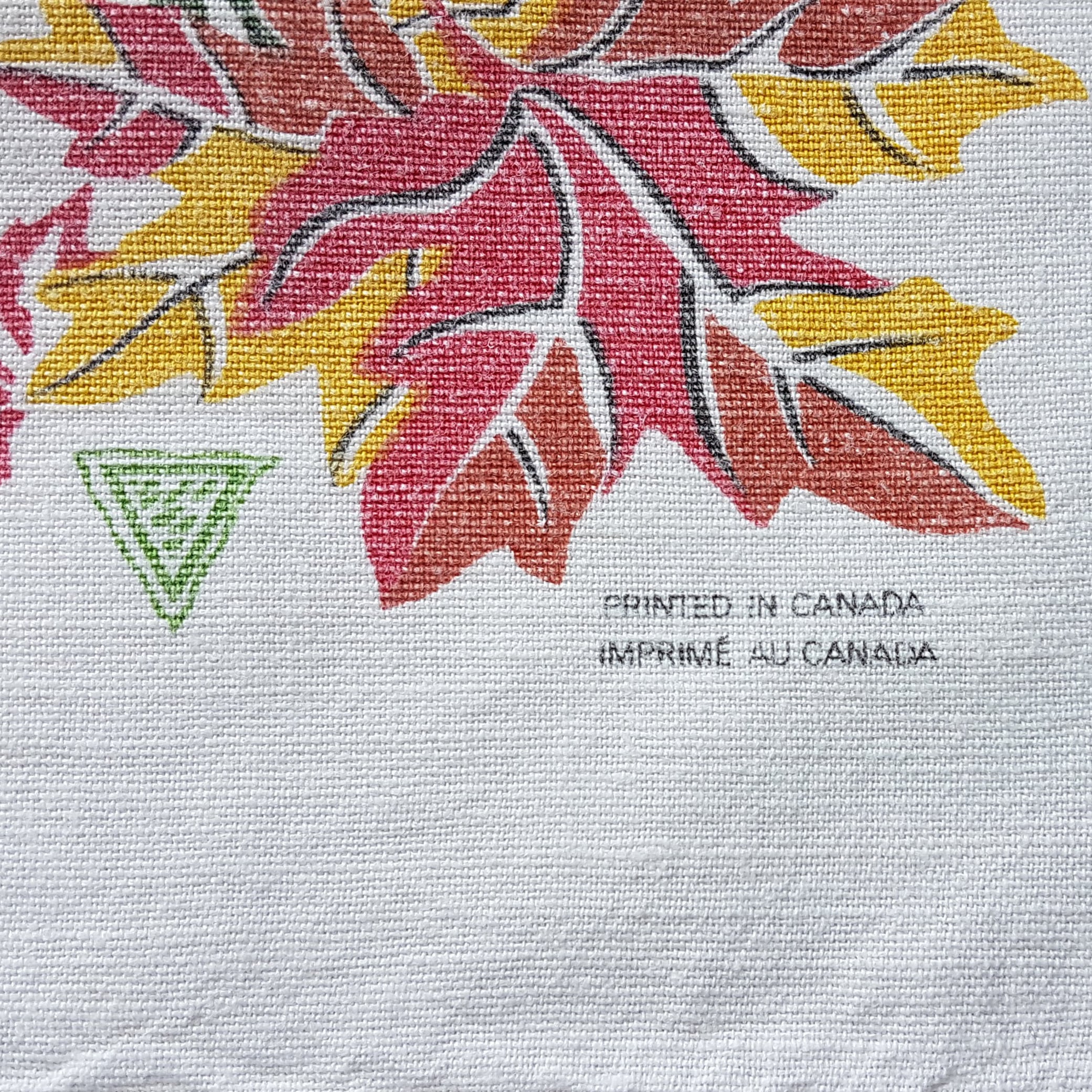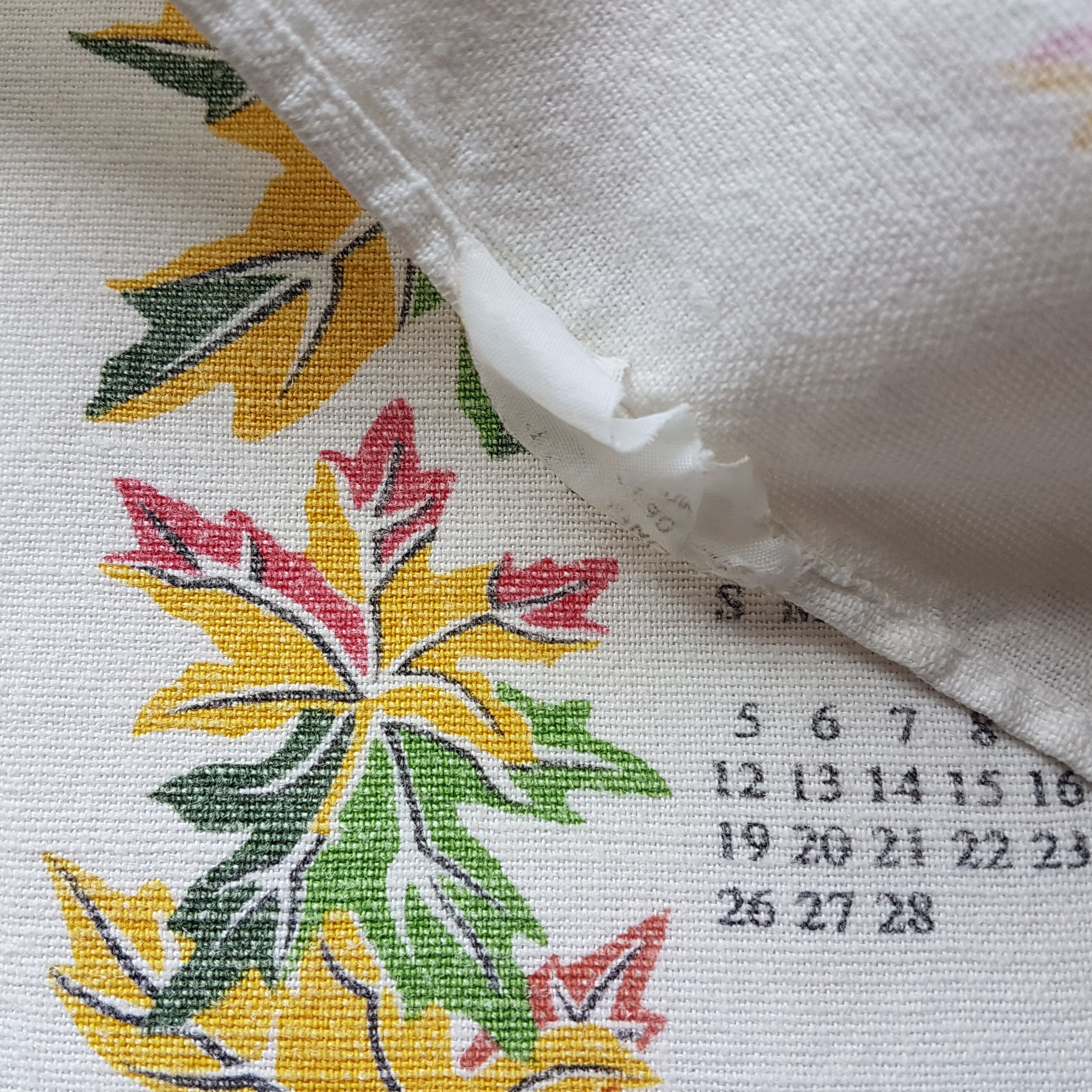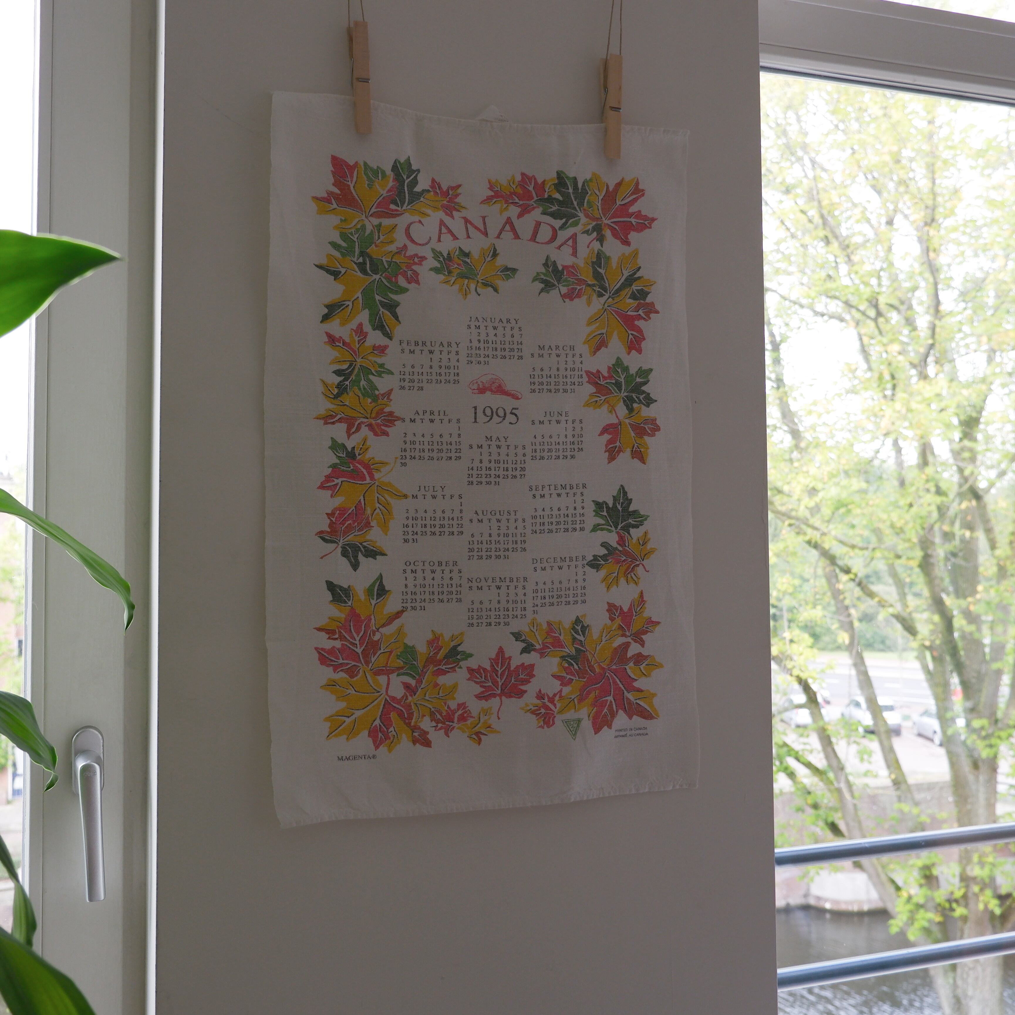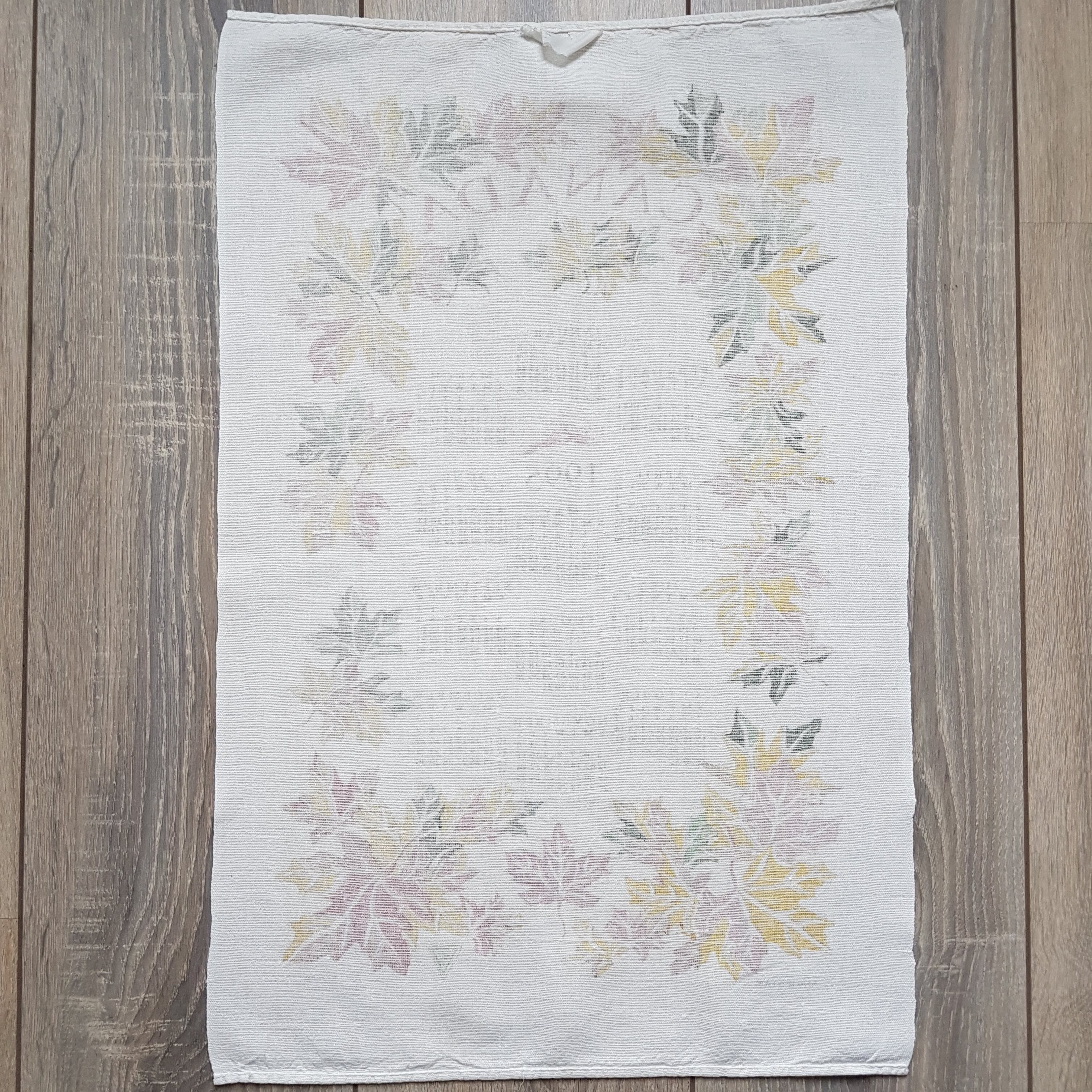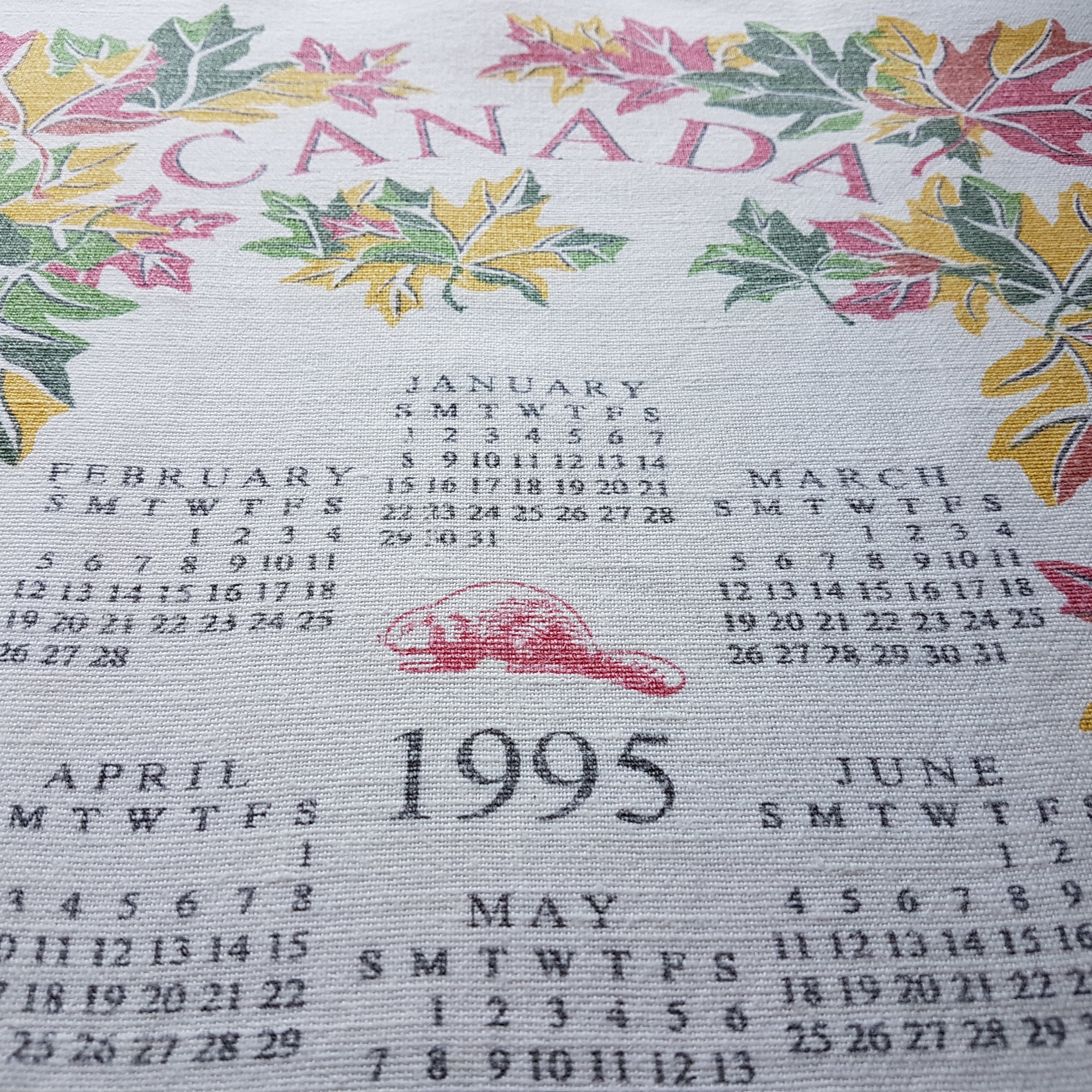 落ち着いた赤・黄色・緑の色でメープルの葉が描かれた、麻布製の1995年度カレンダーです。