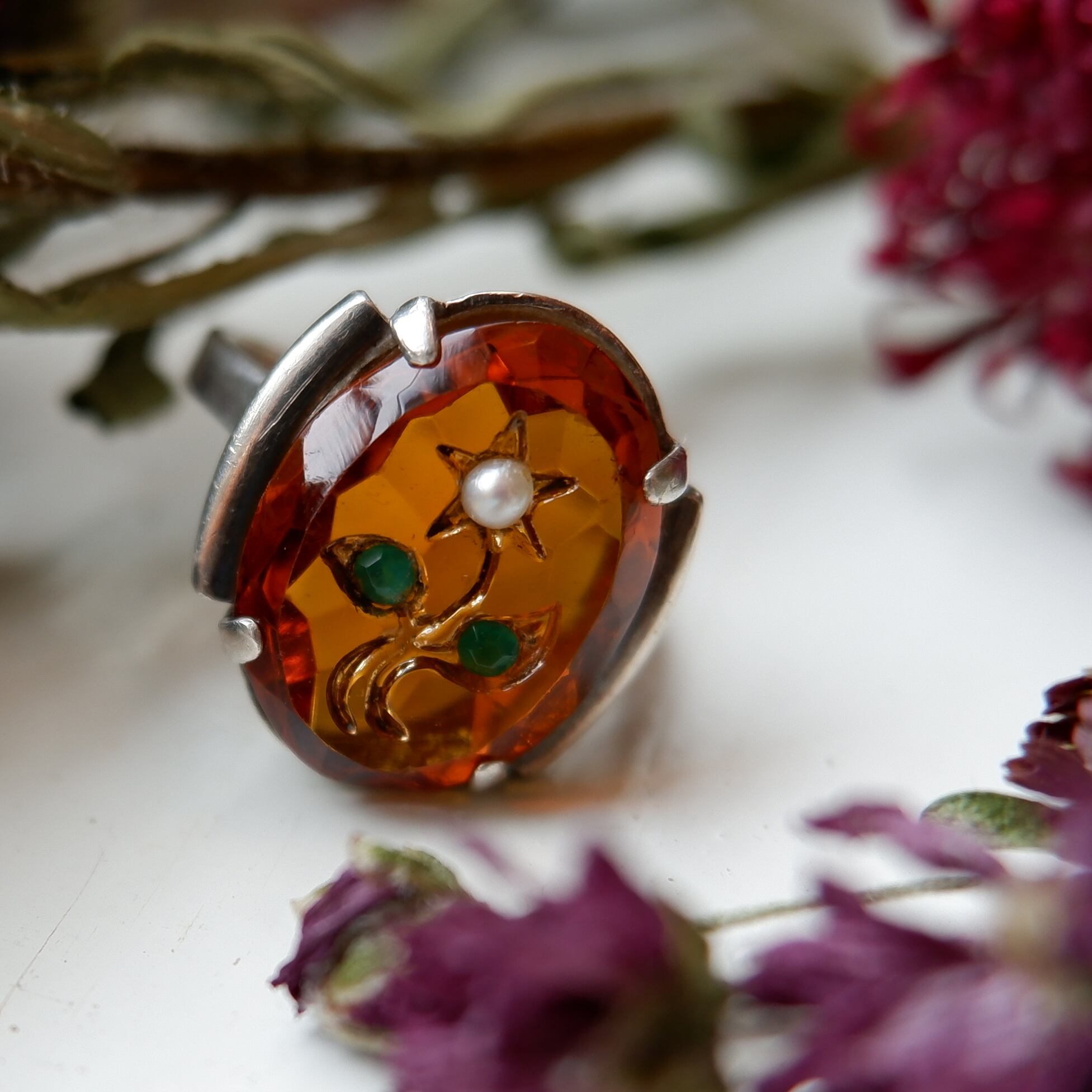 彫金とパールで描かれたお花は、オレンジ色に大地を照らす太陽の様にも映ります。