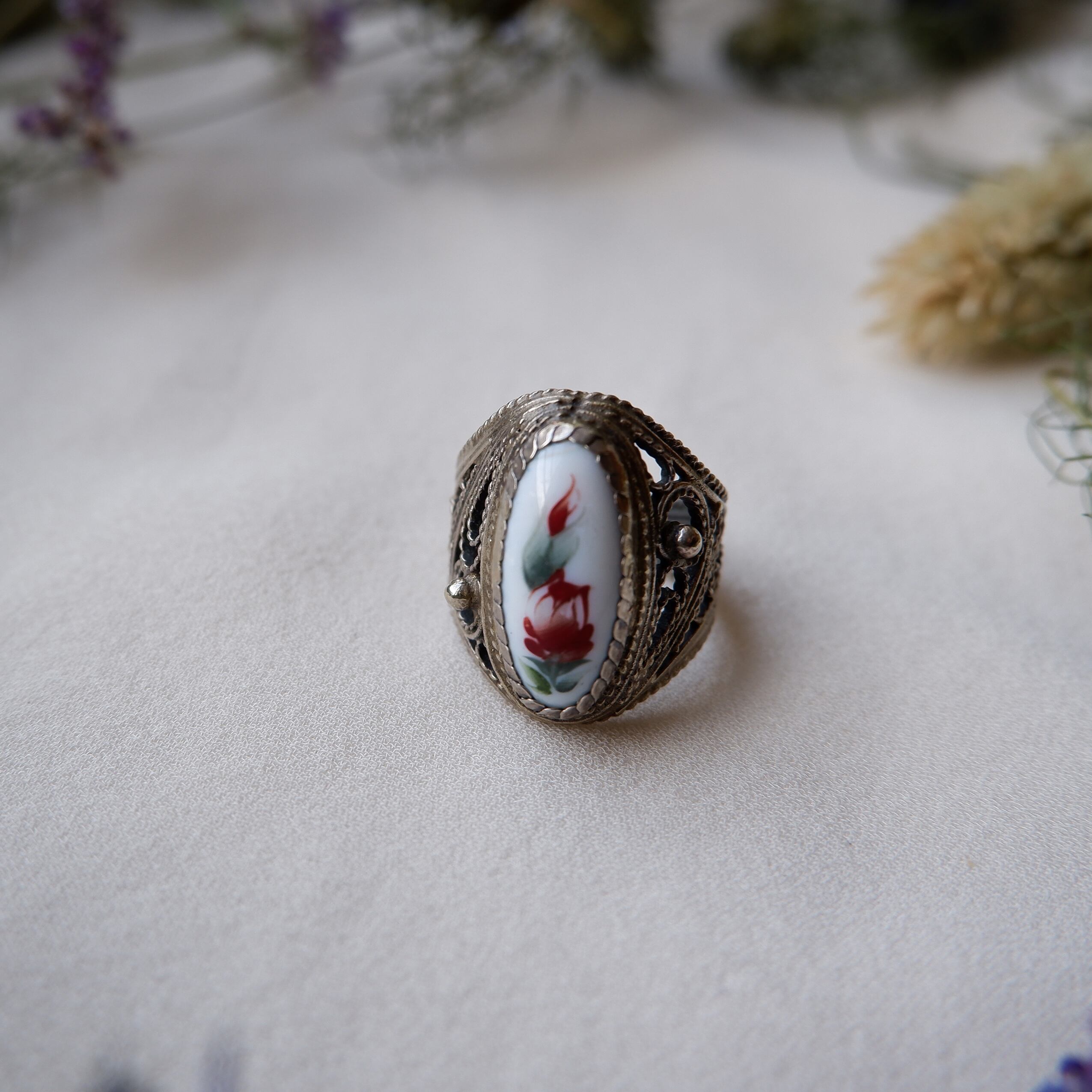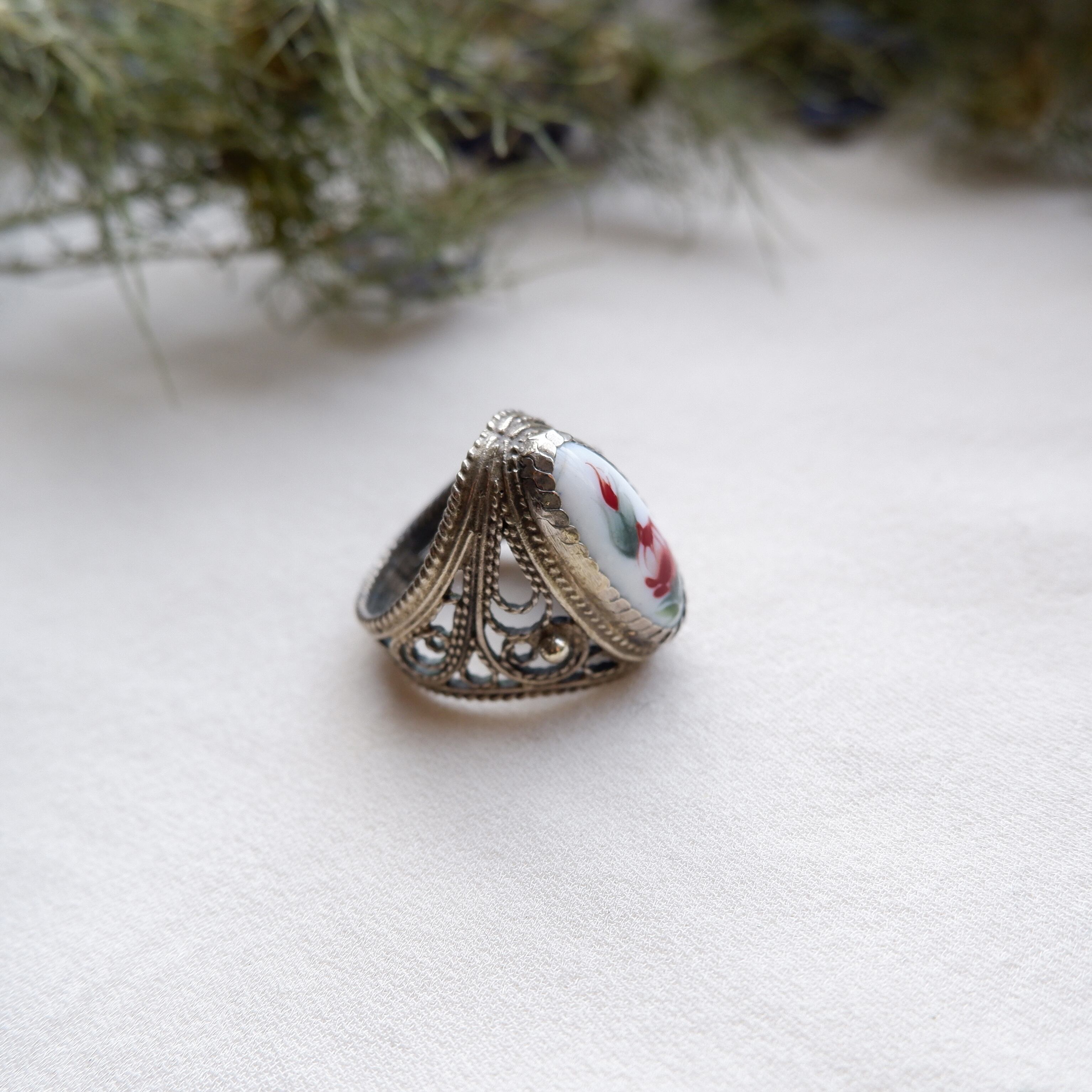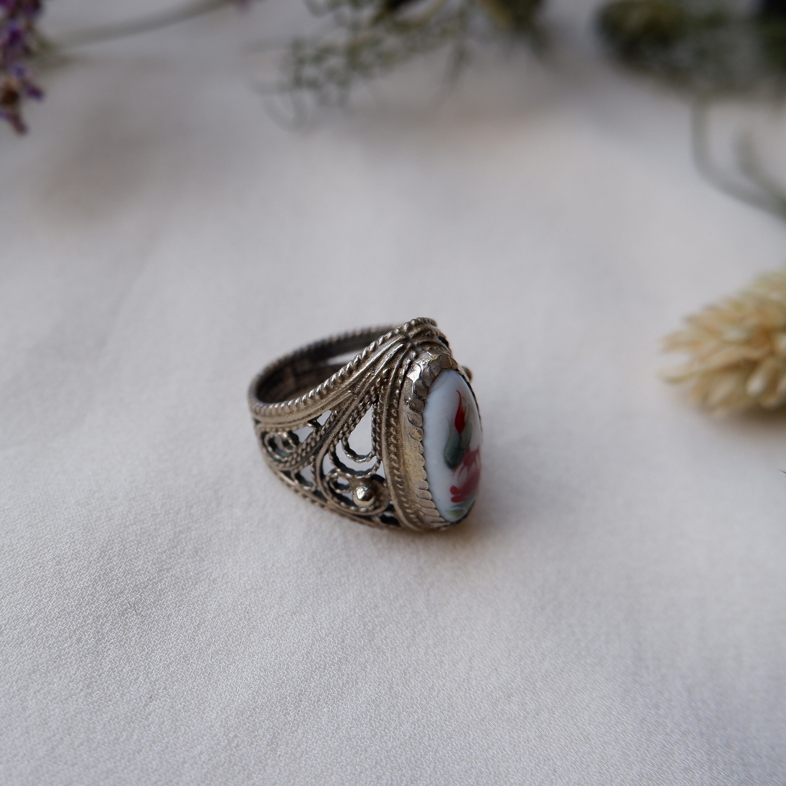 ハンドペイントでお花模様が描かれたシルバー製のヴィンテージリングです。