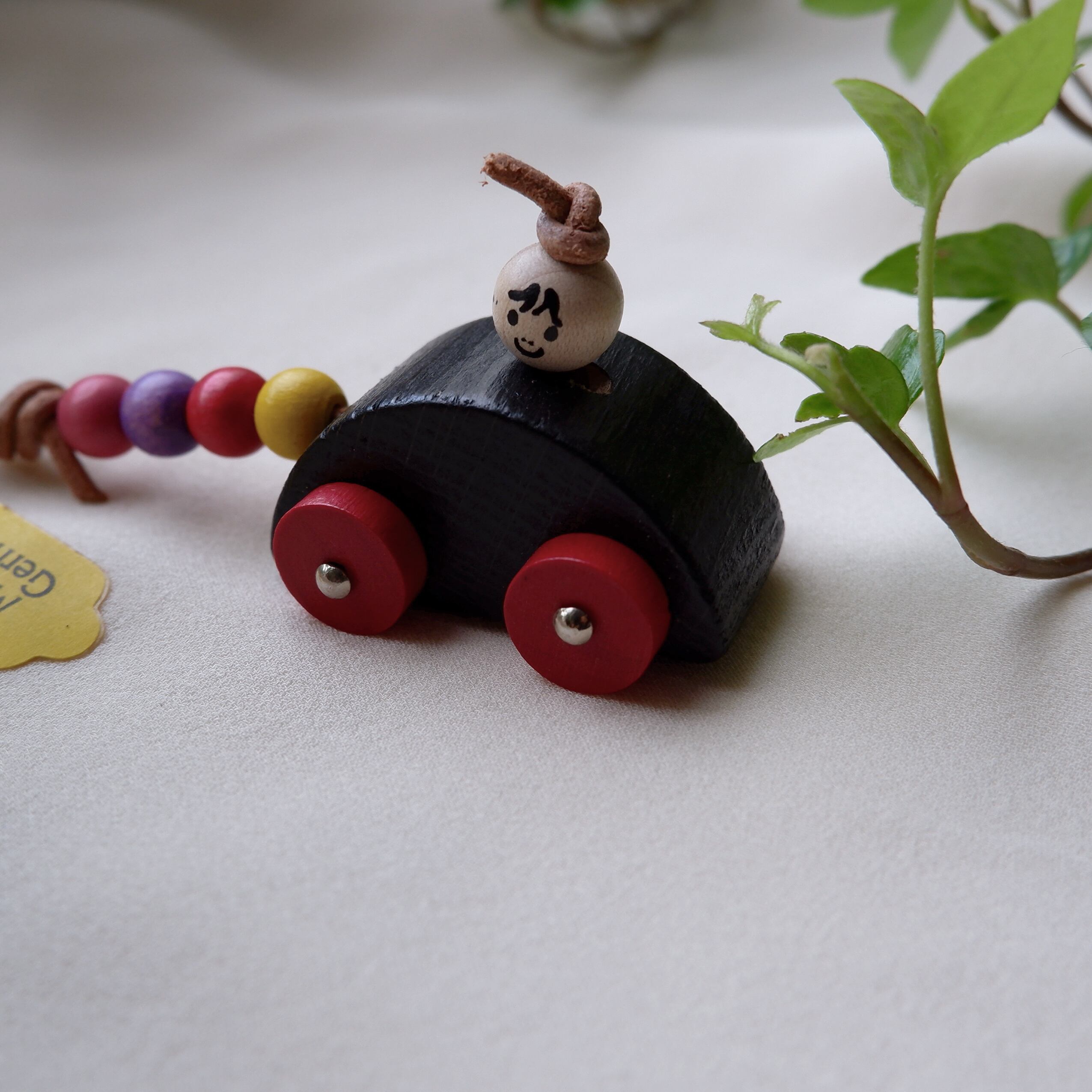 モチーフには、車に乗った小さな子が描かれています。後ろに続くカラフルなビーズは、車から出る煙に見立てられているようです。