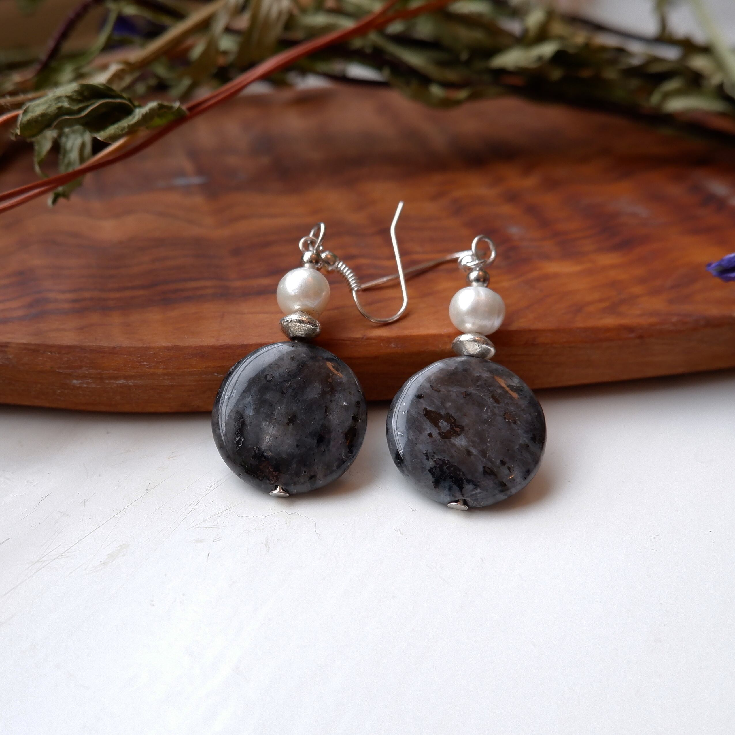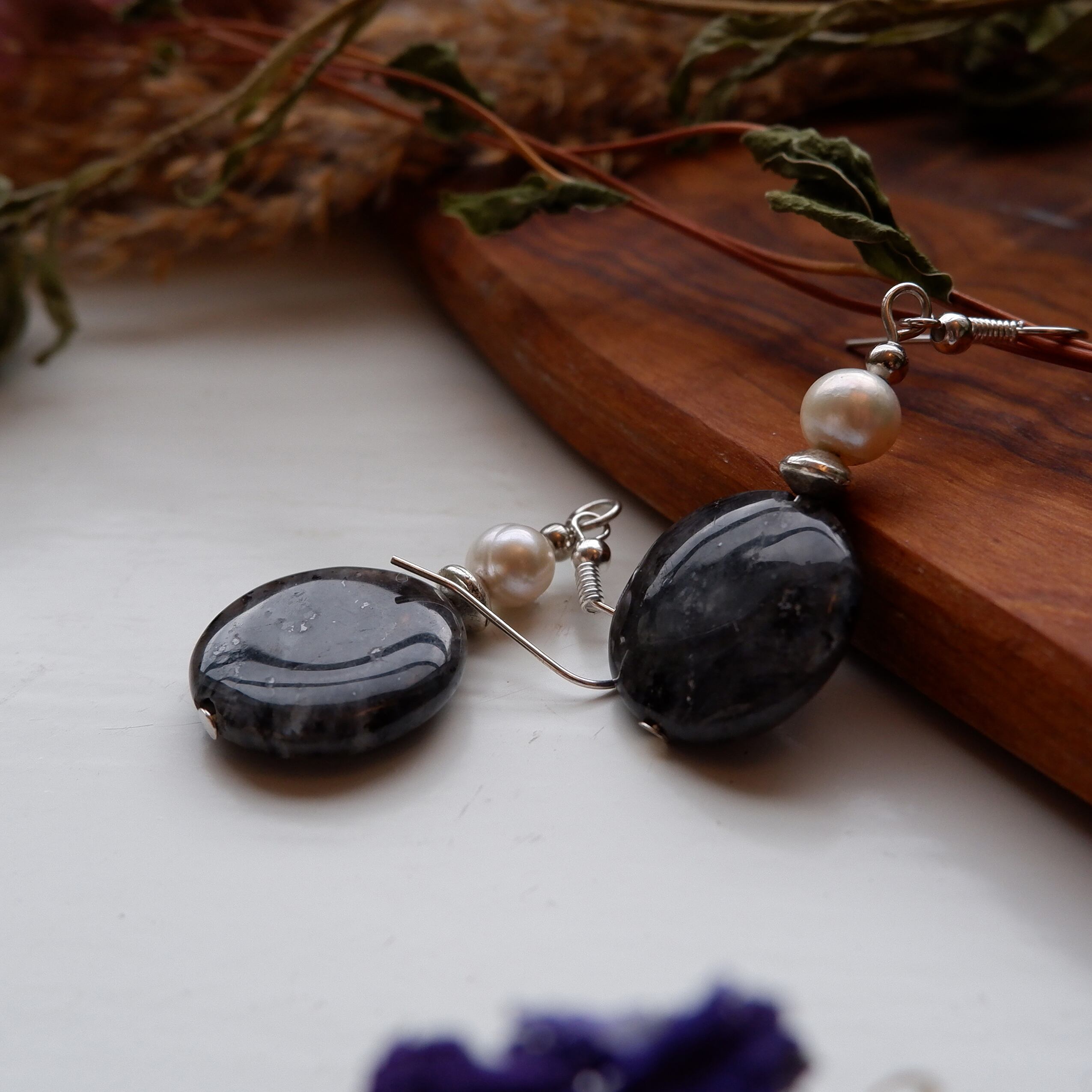 グレートーンの天然石とコットンパールがモチーフとなった揺れるデザインのピアスです。