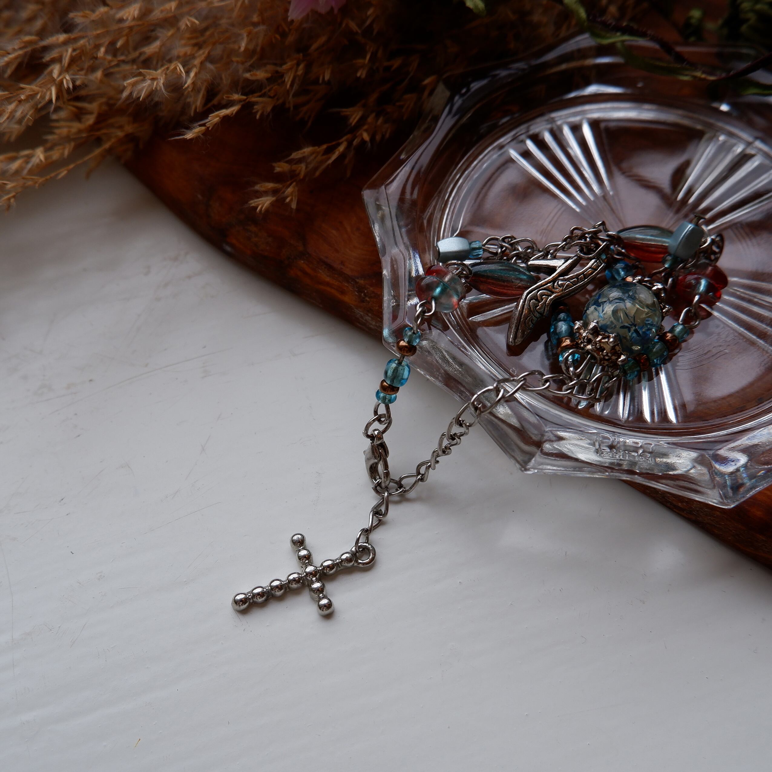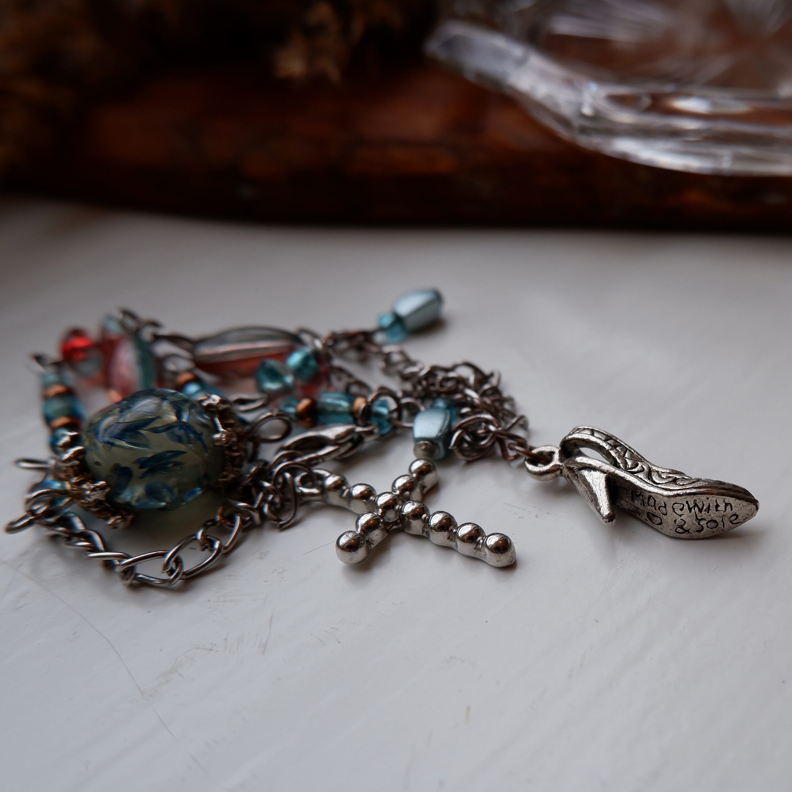 落ち着いた配色の中でハイヒールと十字架のチャームが揺れる素敵な一品です。