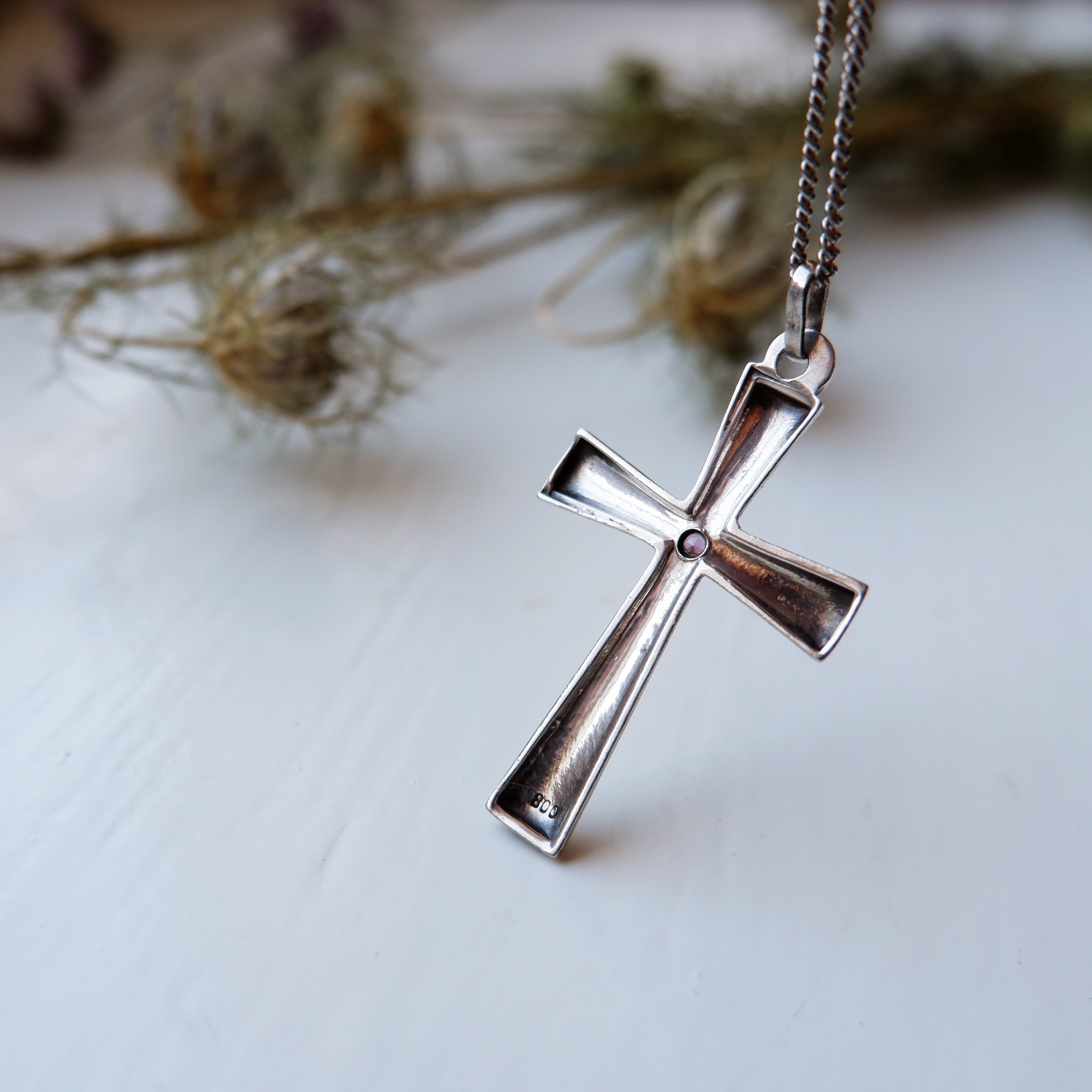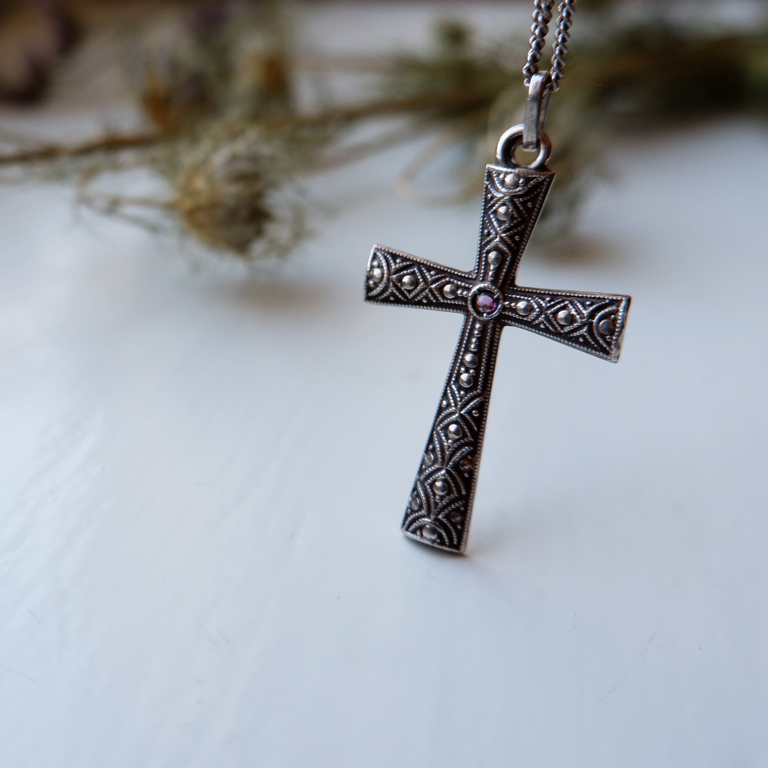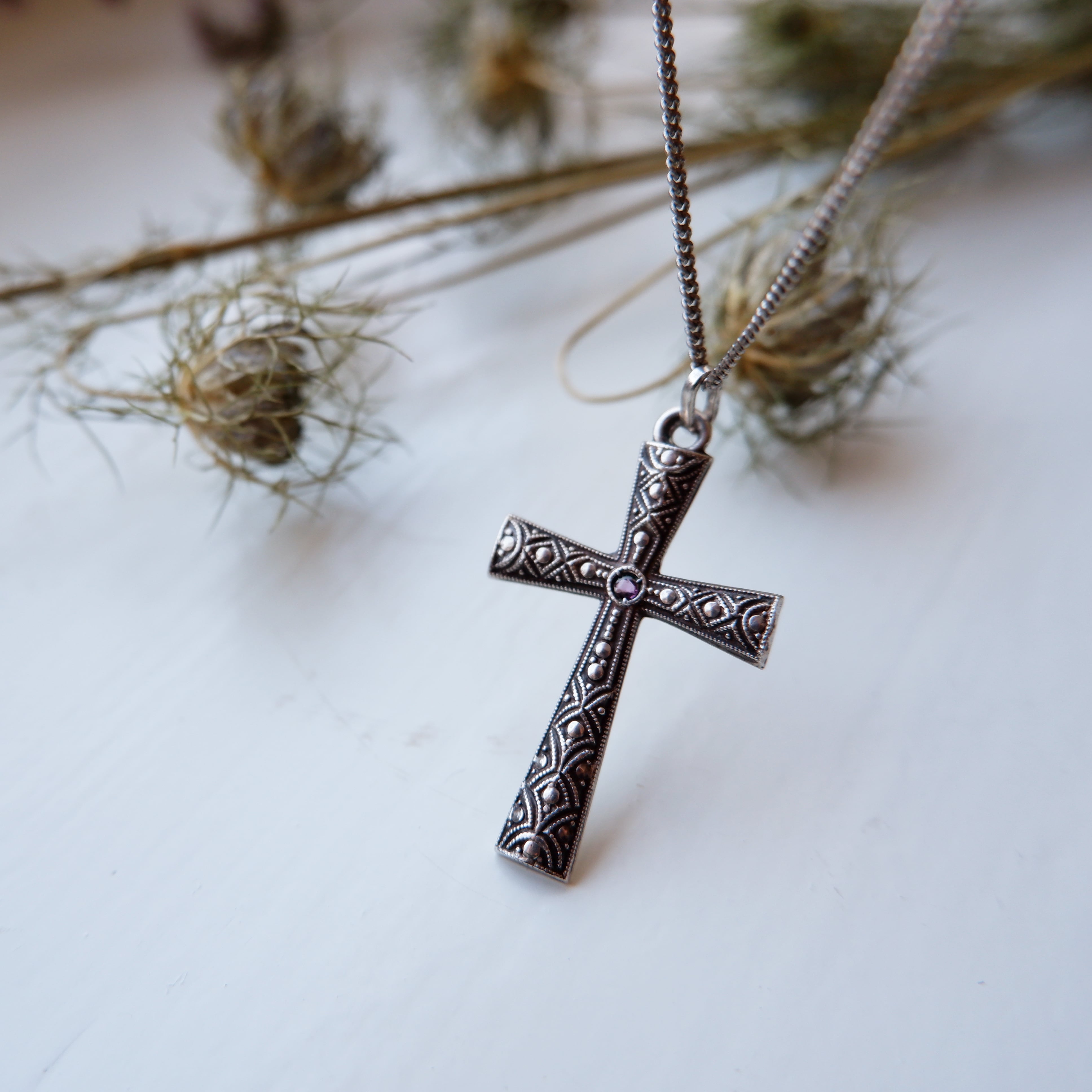 雰囲気たっぷりのクロスペンダントには、中心にアメジストの石が充てがわれています。