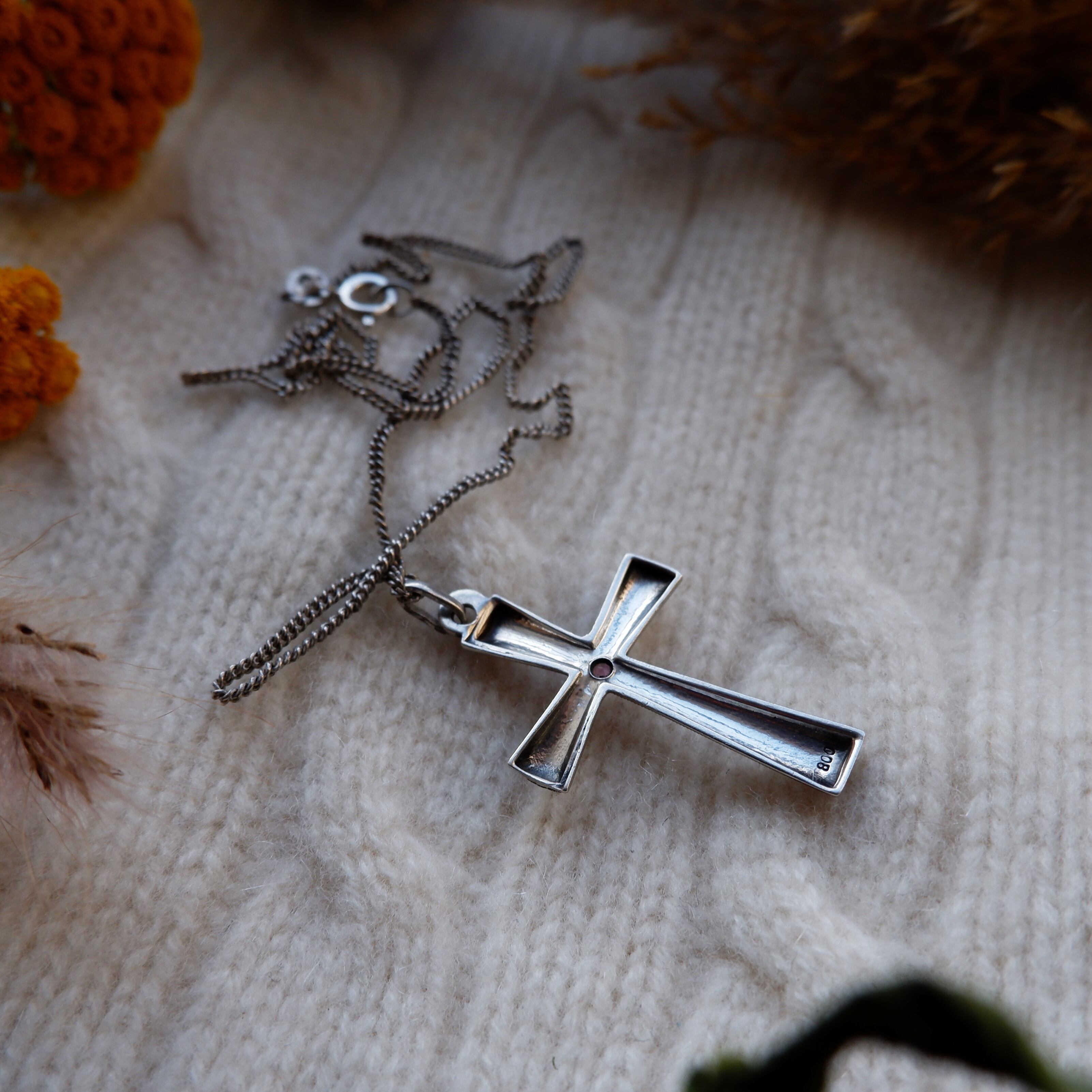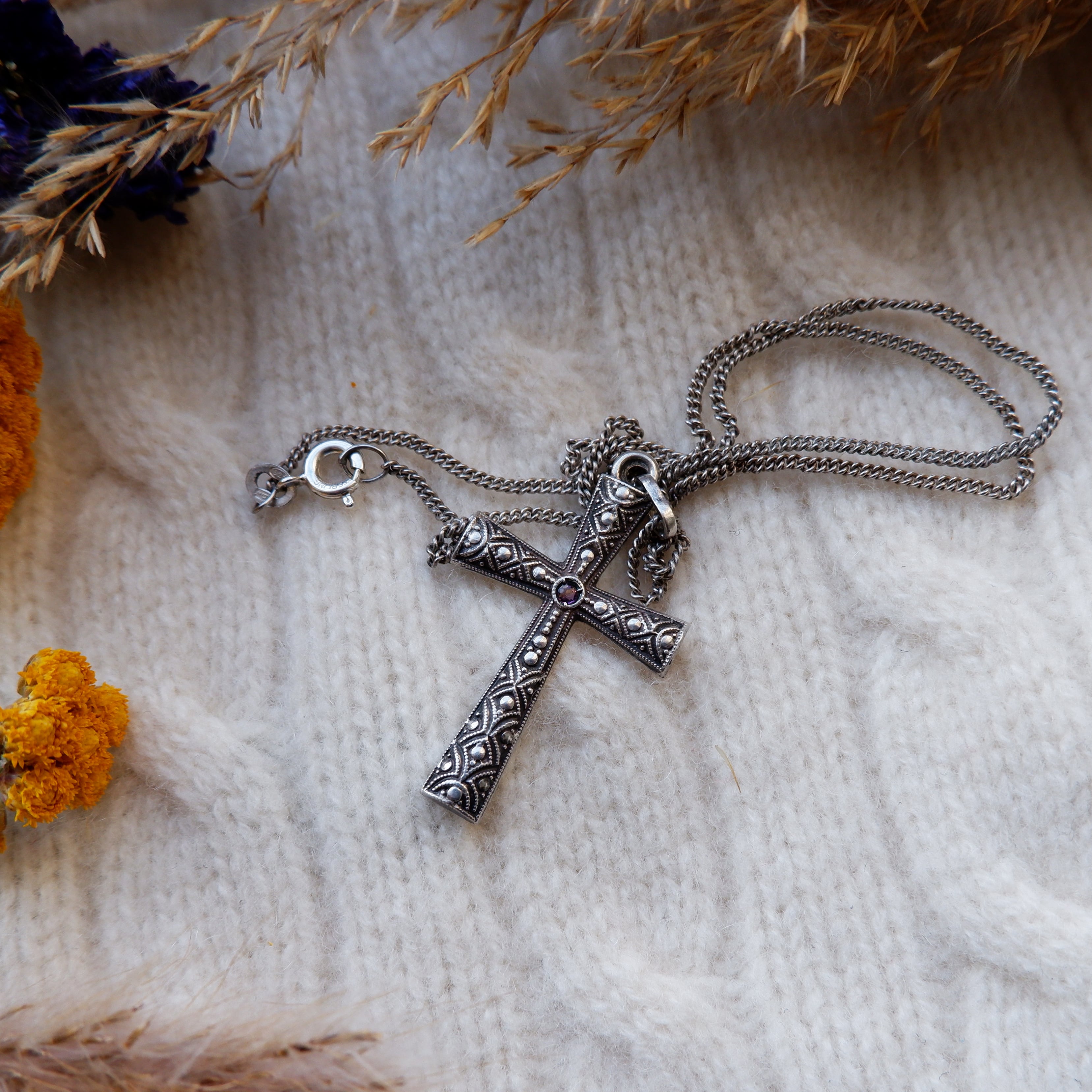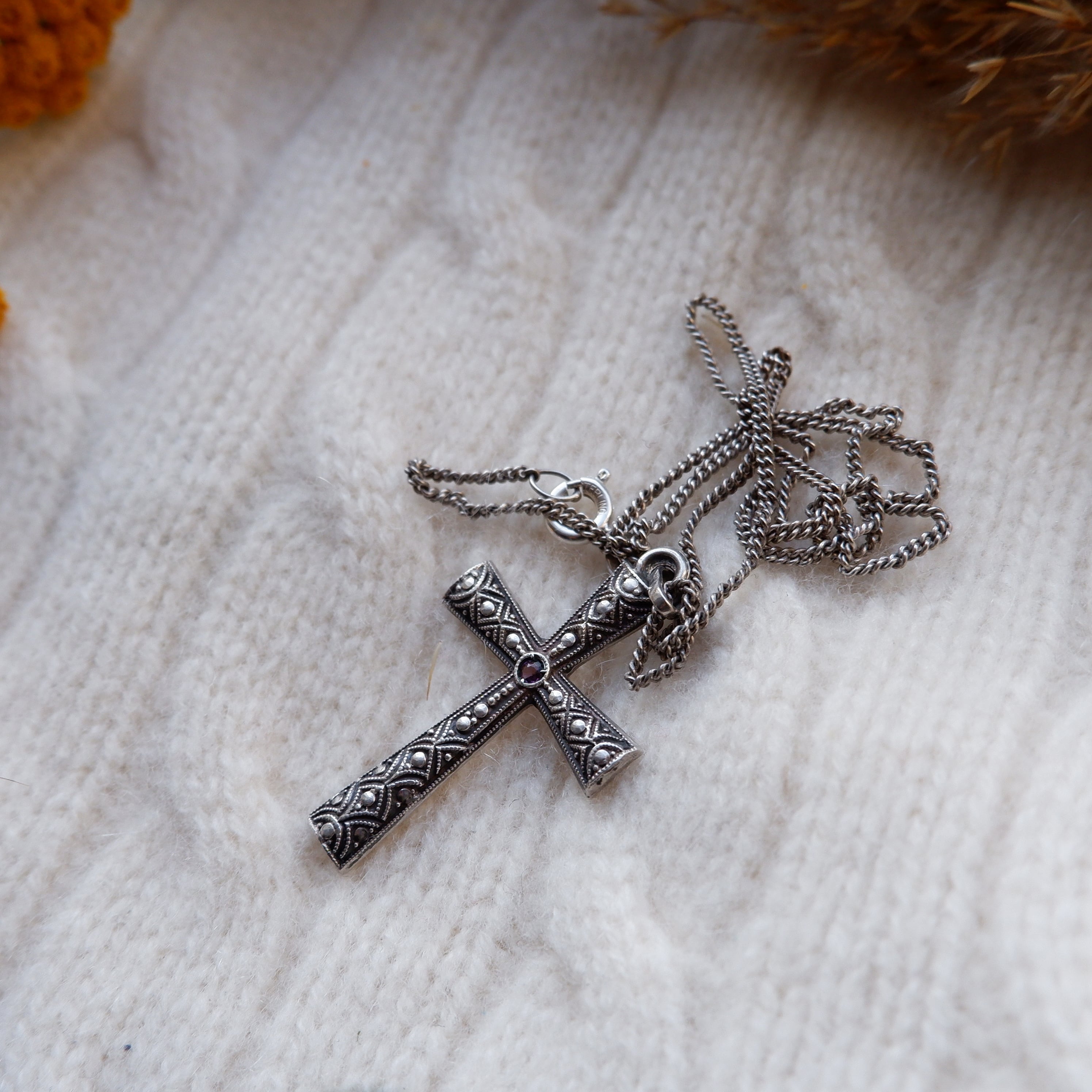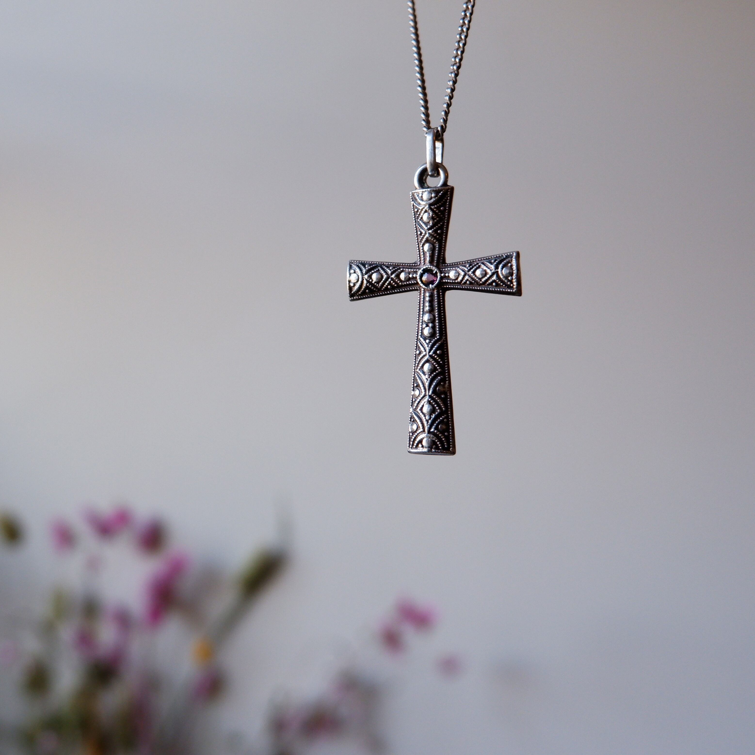 雰囲気たっぷりのクロスペンダントには、中心にアメジストの石が充てがわれています。