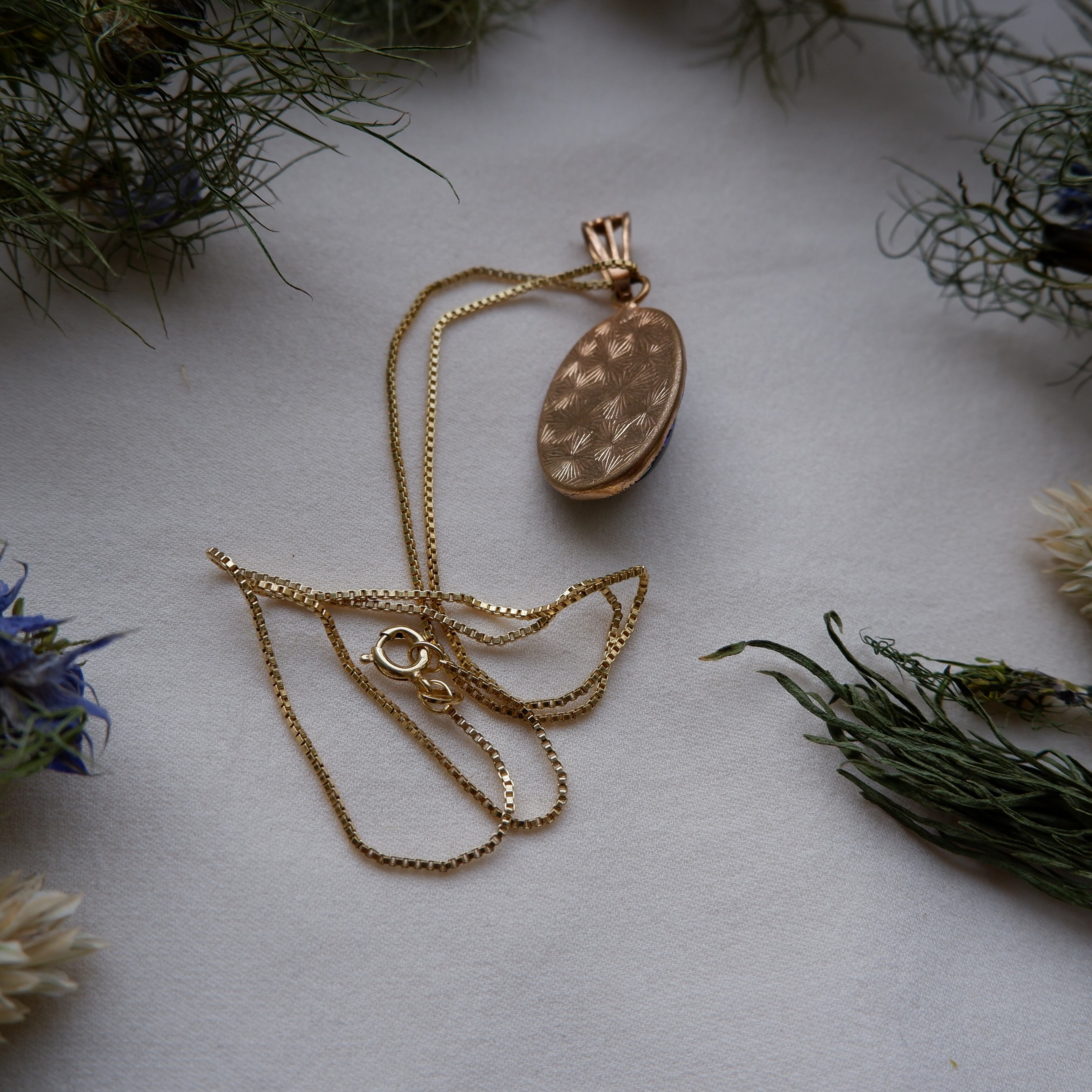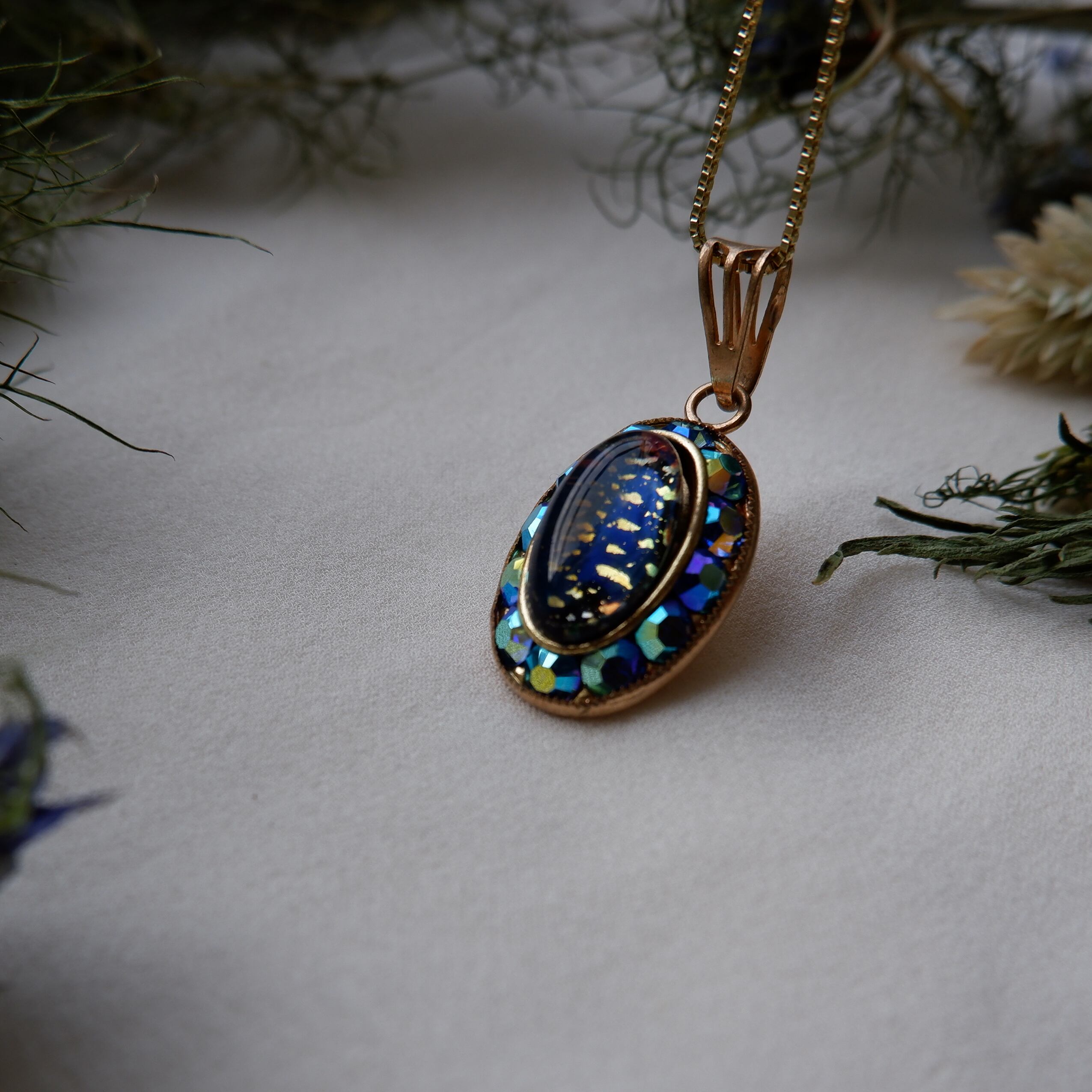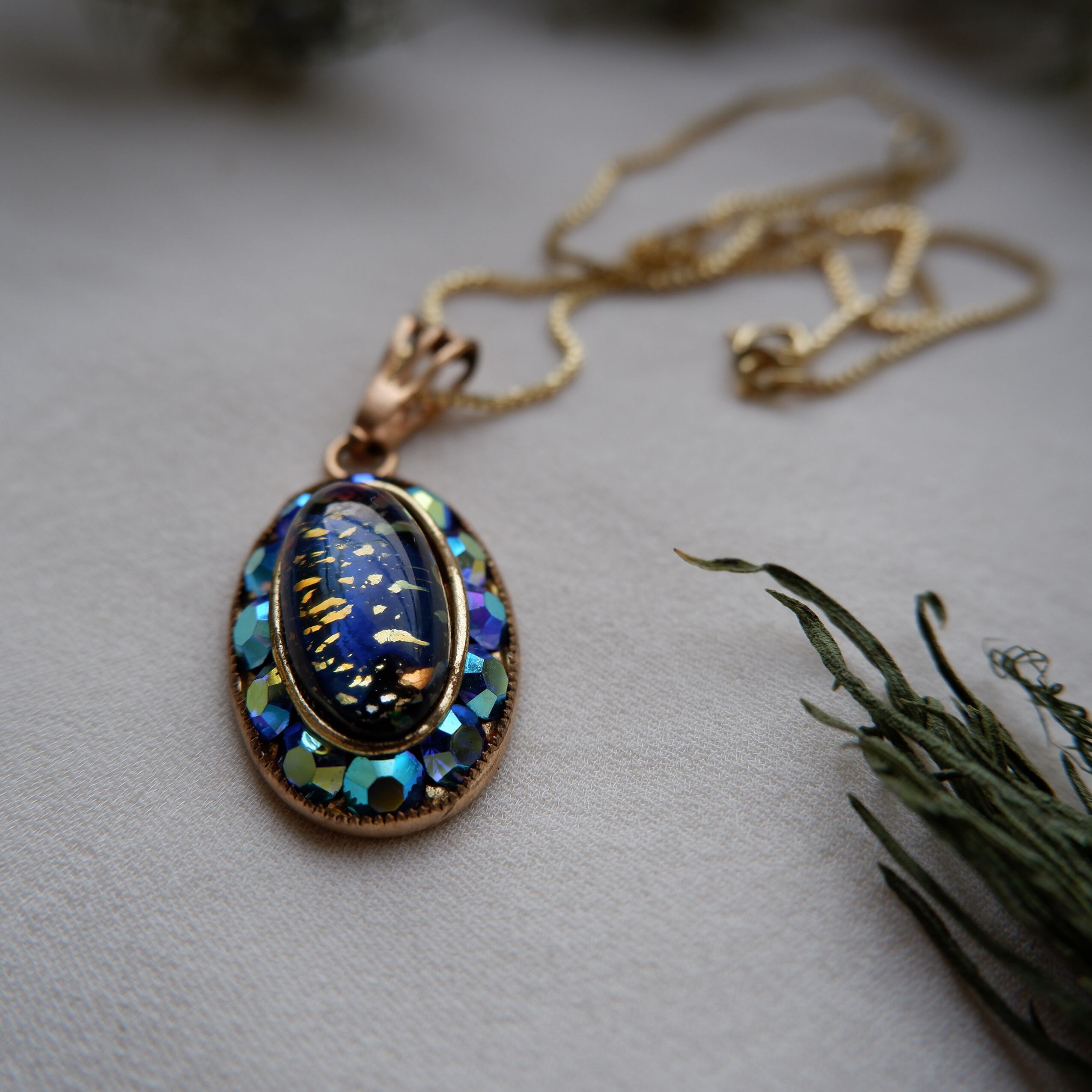 ビジューで囲まれたオーバルの中に金箔で装飾された空間が閉じ込められています。