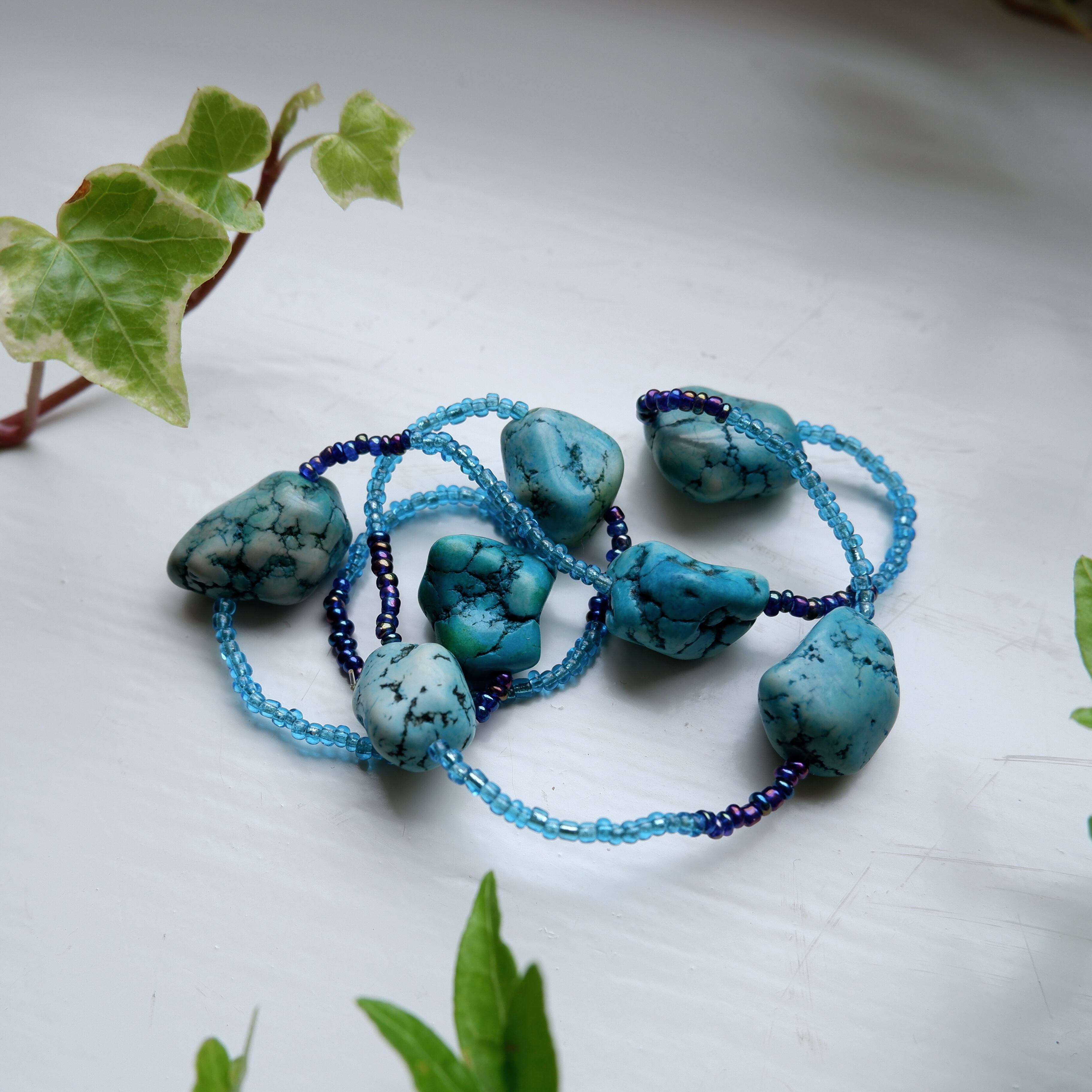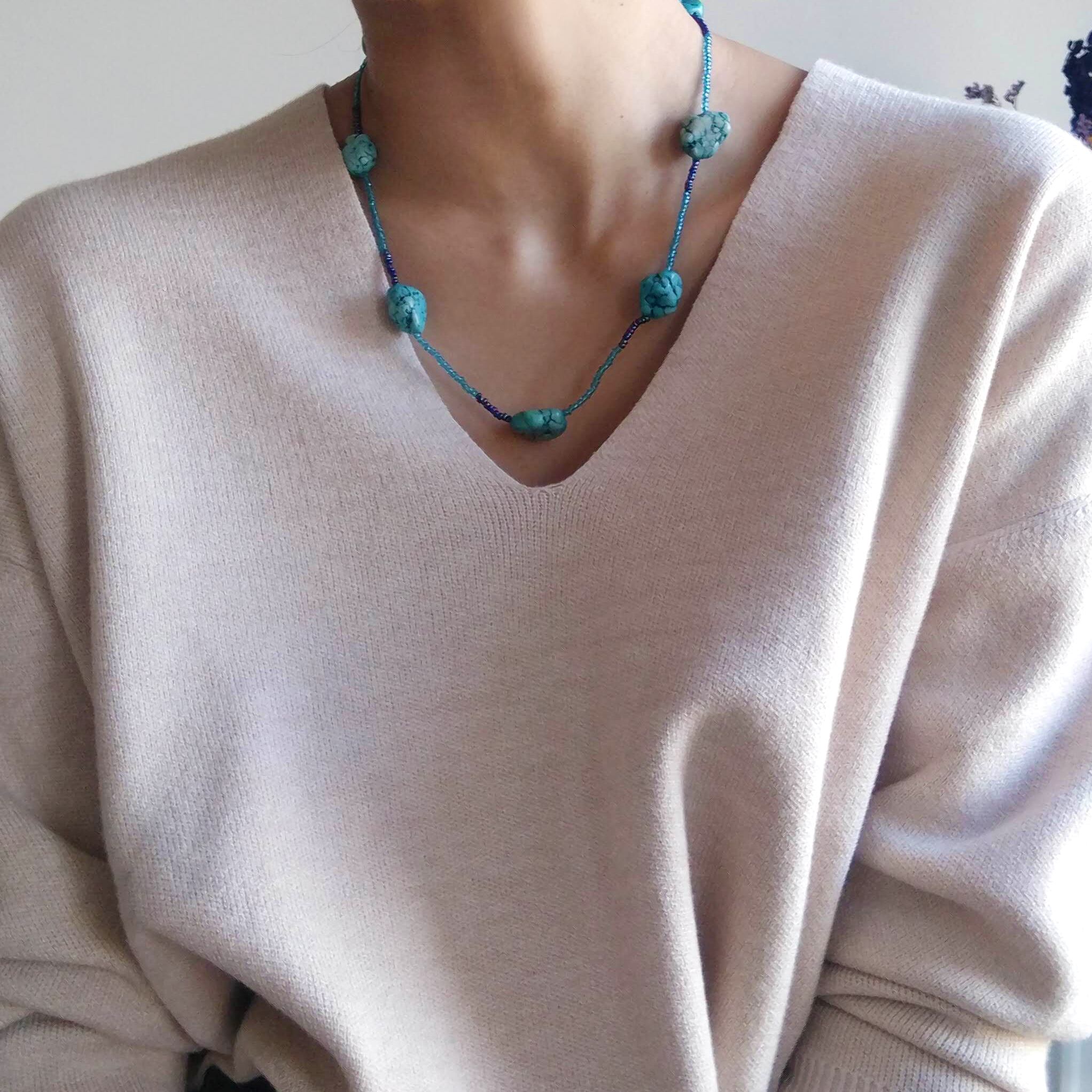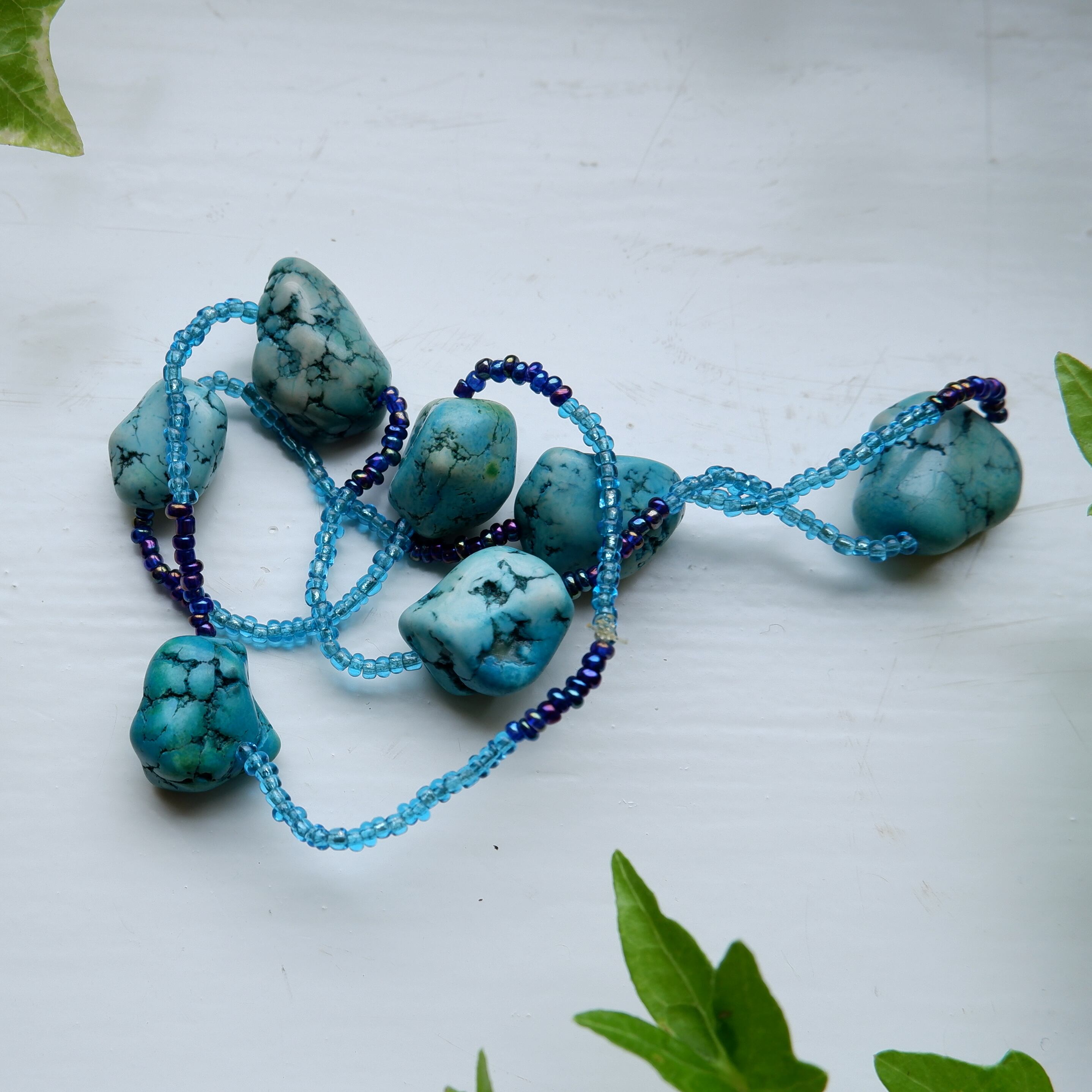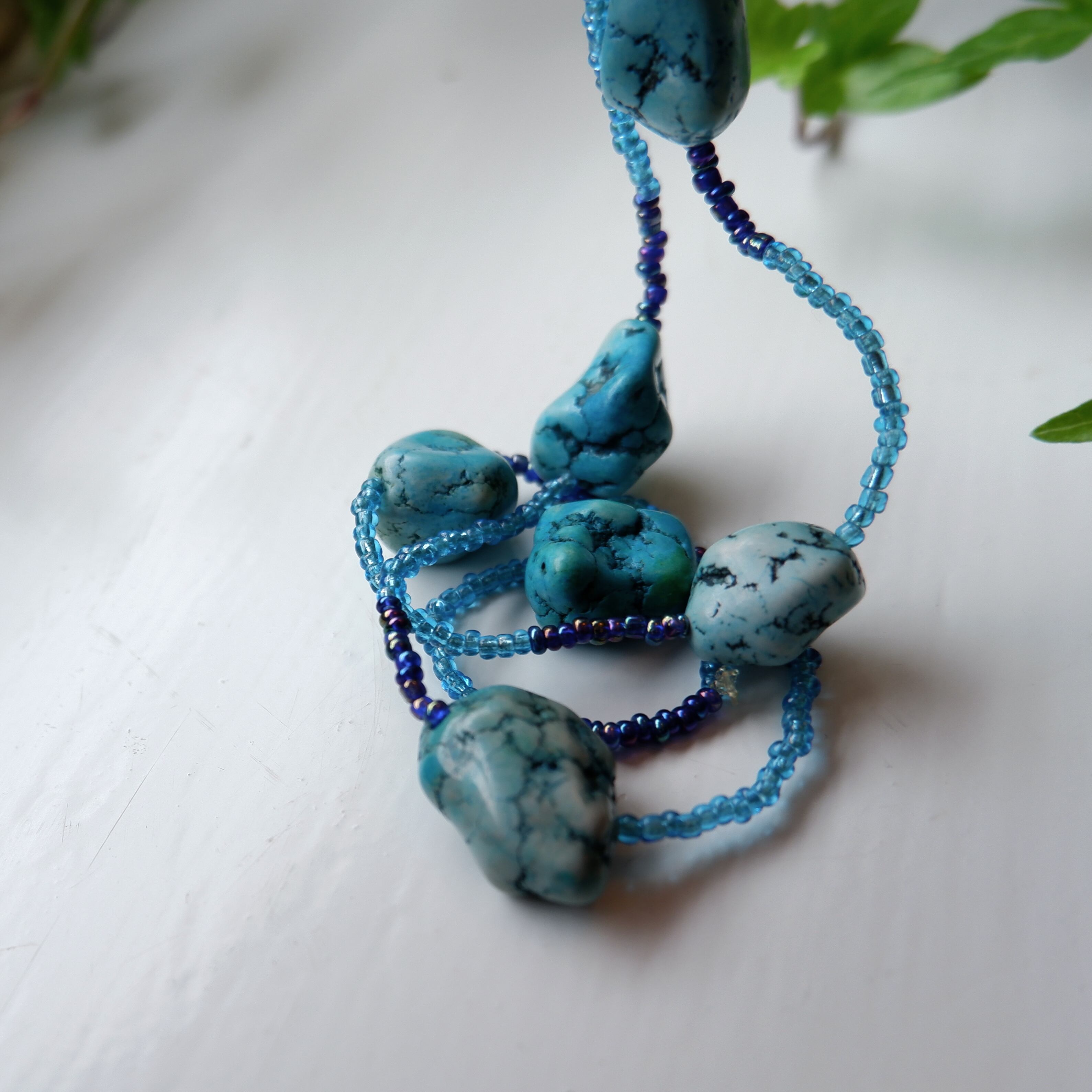 海色の石とガラスビーズで作られたゴム製のネックレスです。