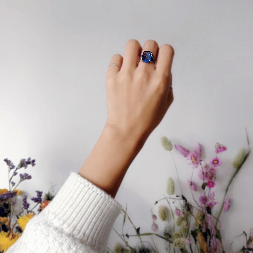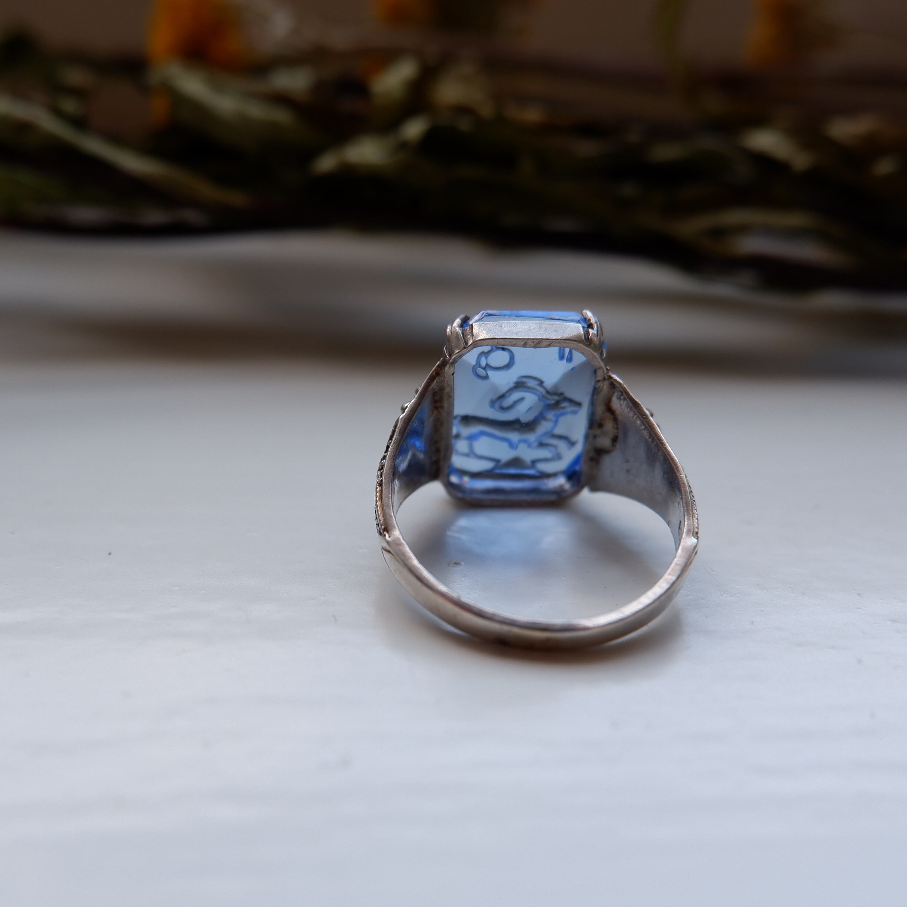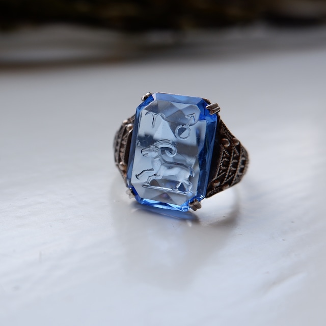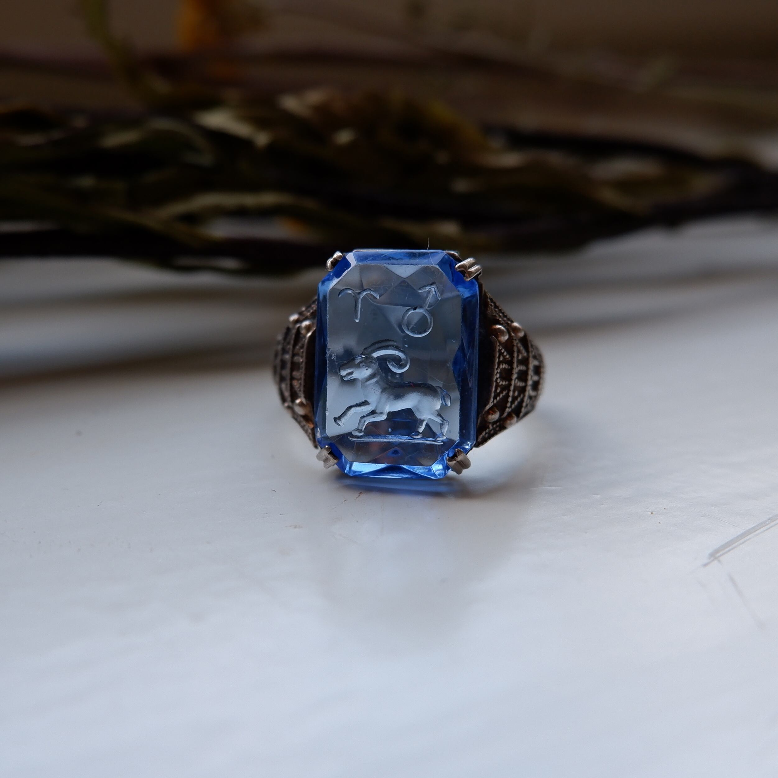 青いガラス製のモチーフにおひつじ座の絵柄が刻まれたヴィンテージ製のシルバーリングです。