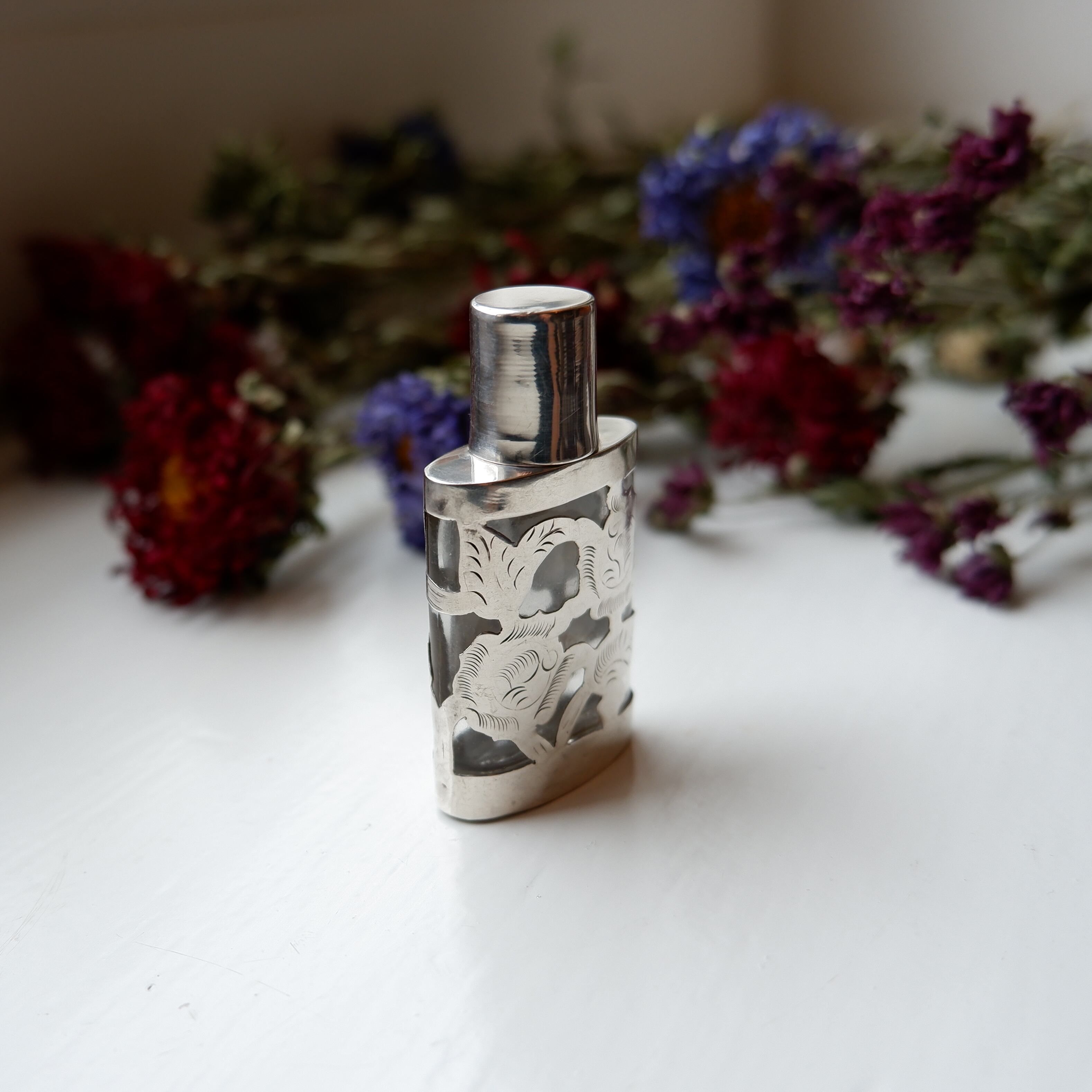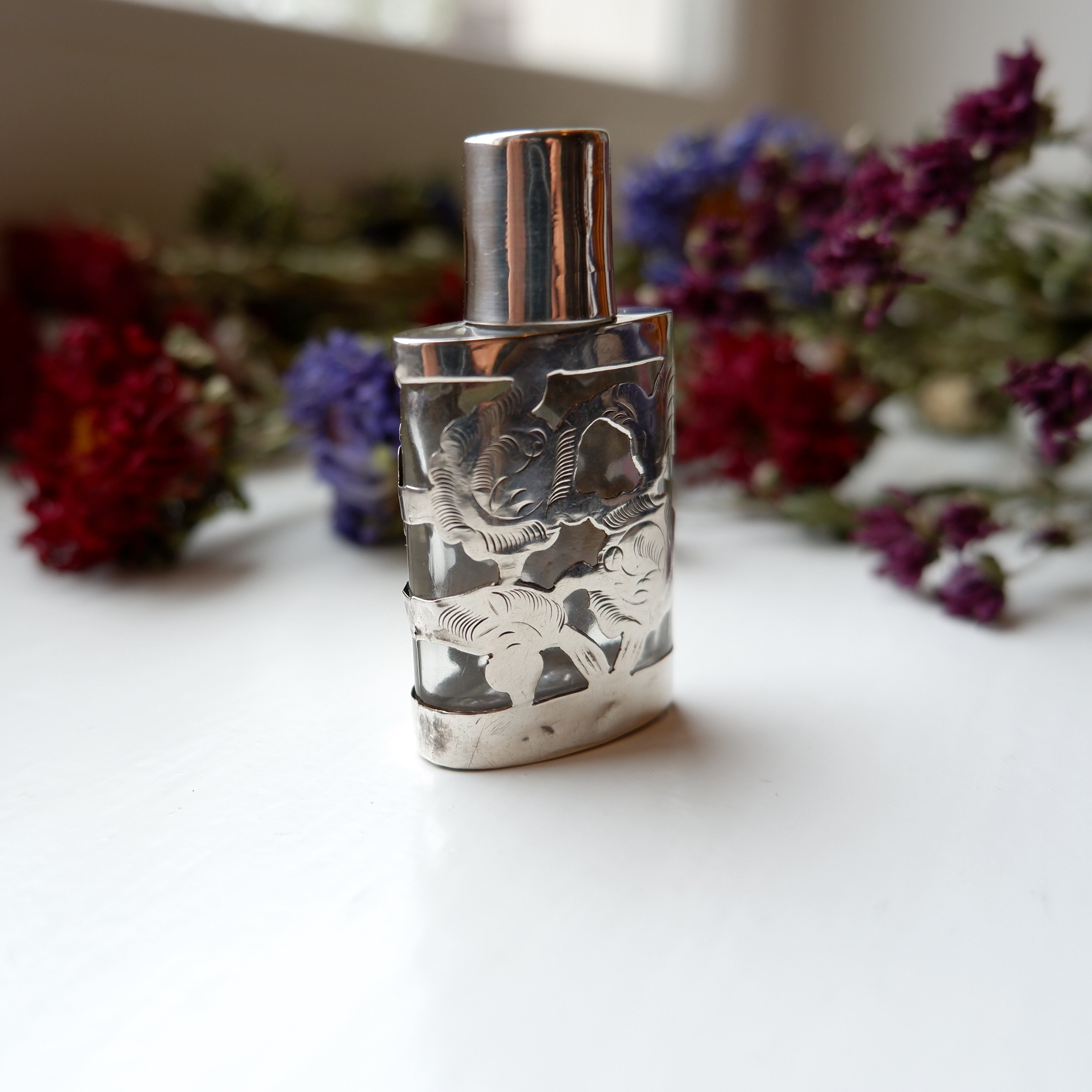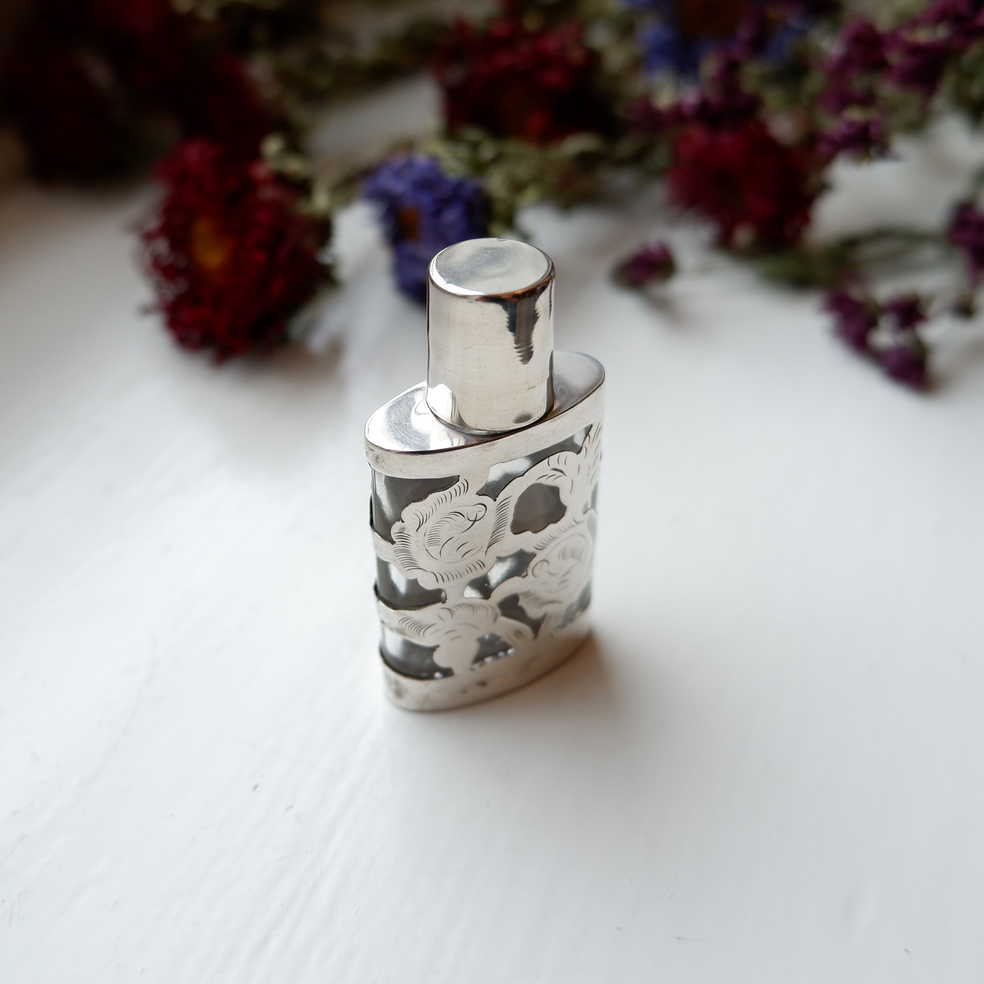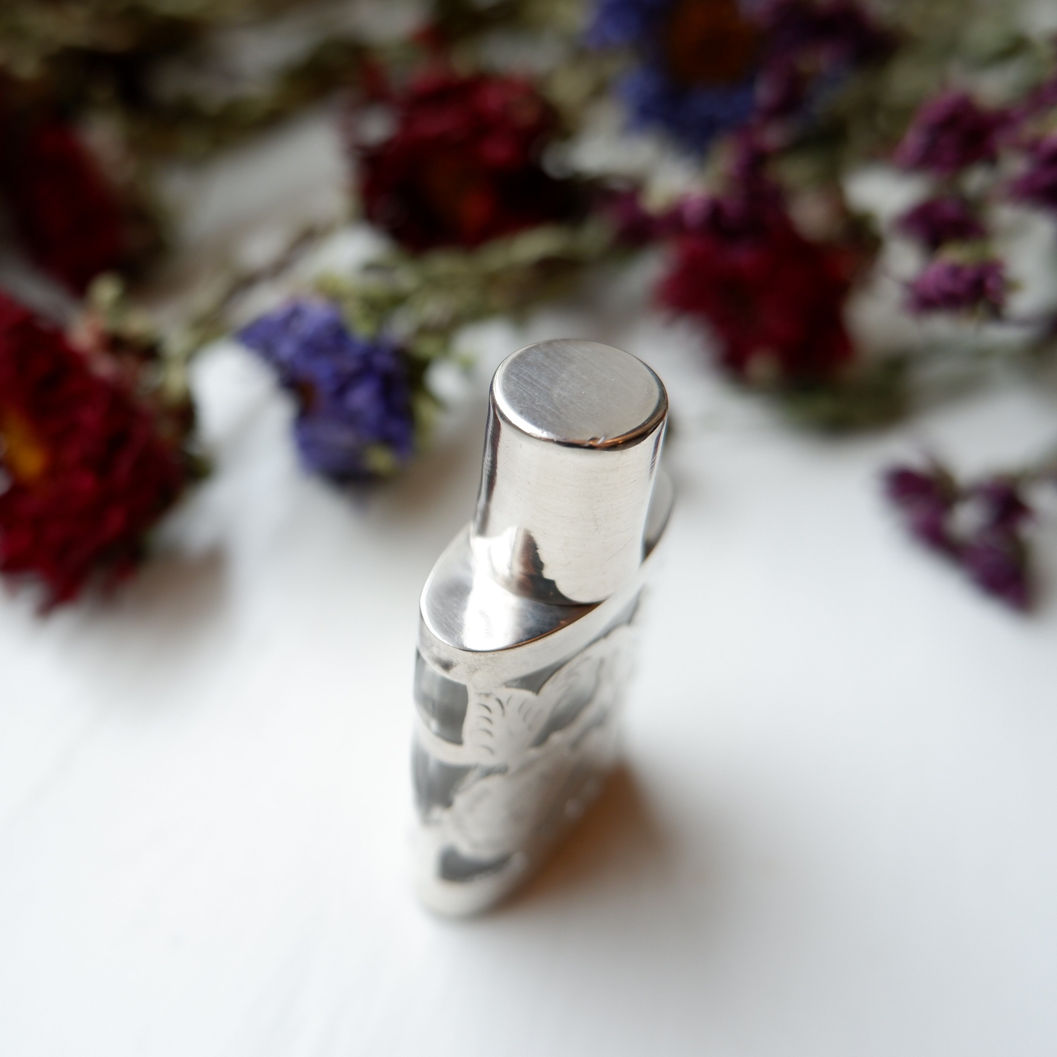 ガラス製の小さな瓶がシルバー製のハンドメイド彫金ケースで覆われています。
