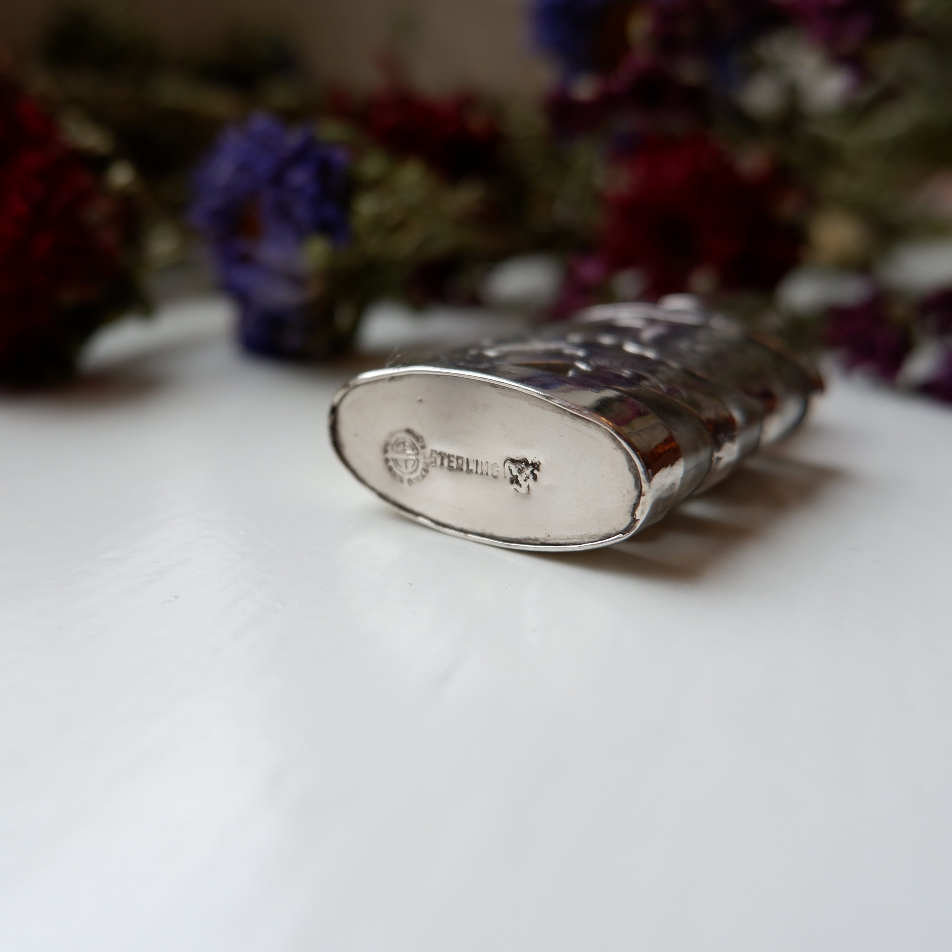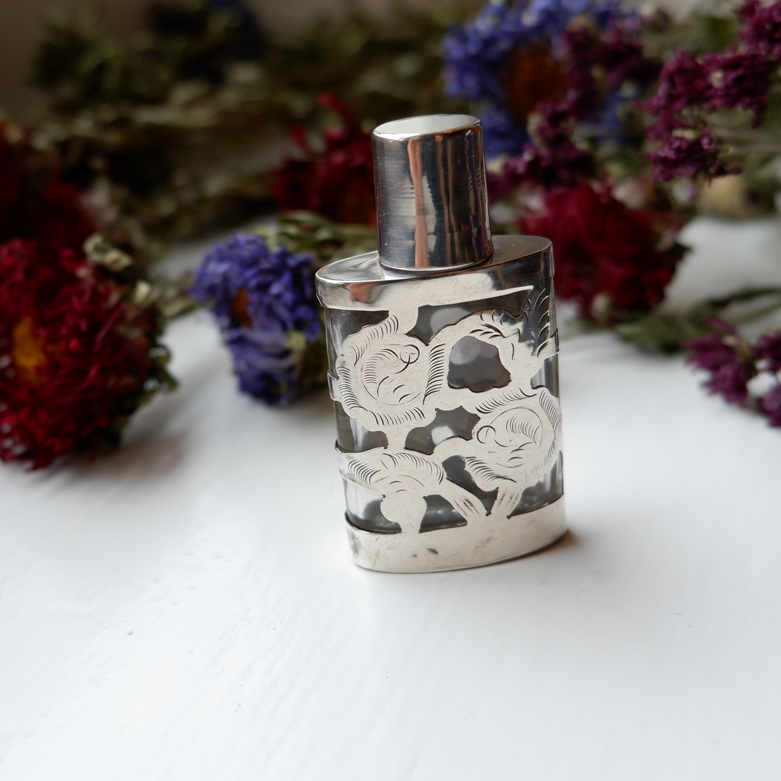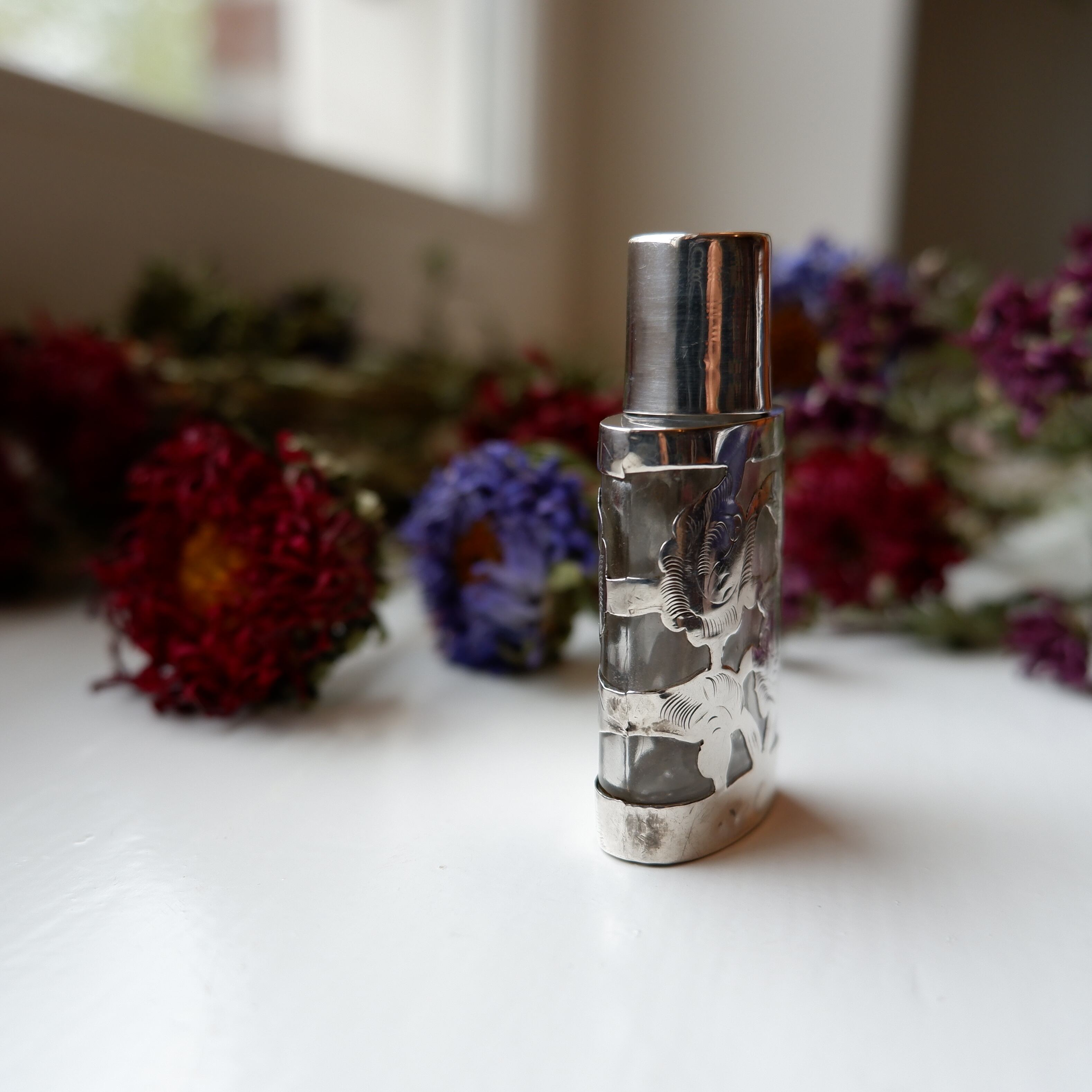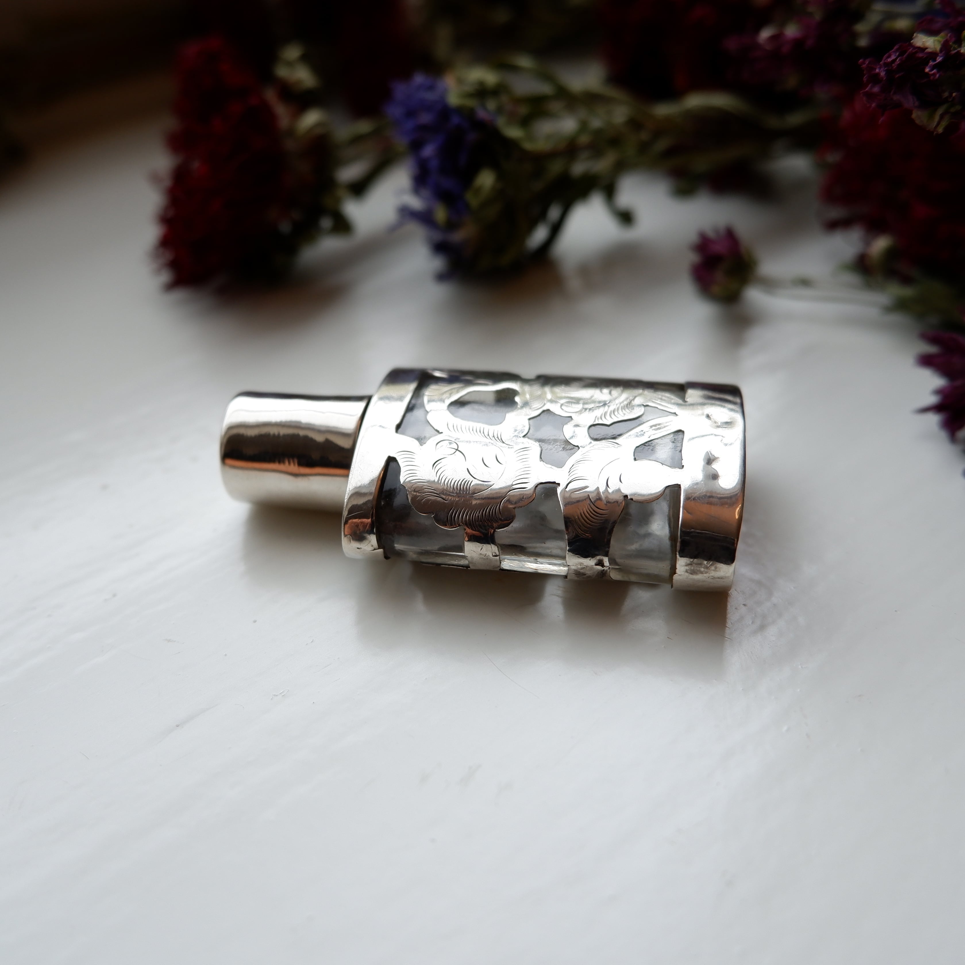 ガラス製の小さな瓶がシルバー製のハンドメイド彫金ケースで覆われています。