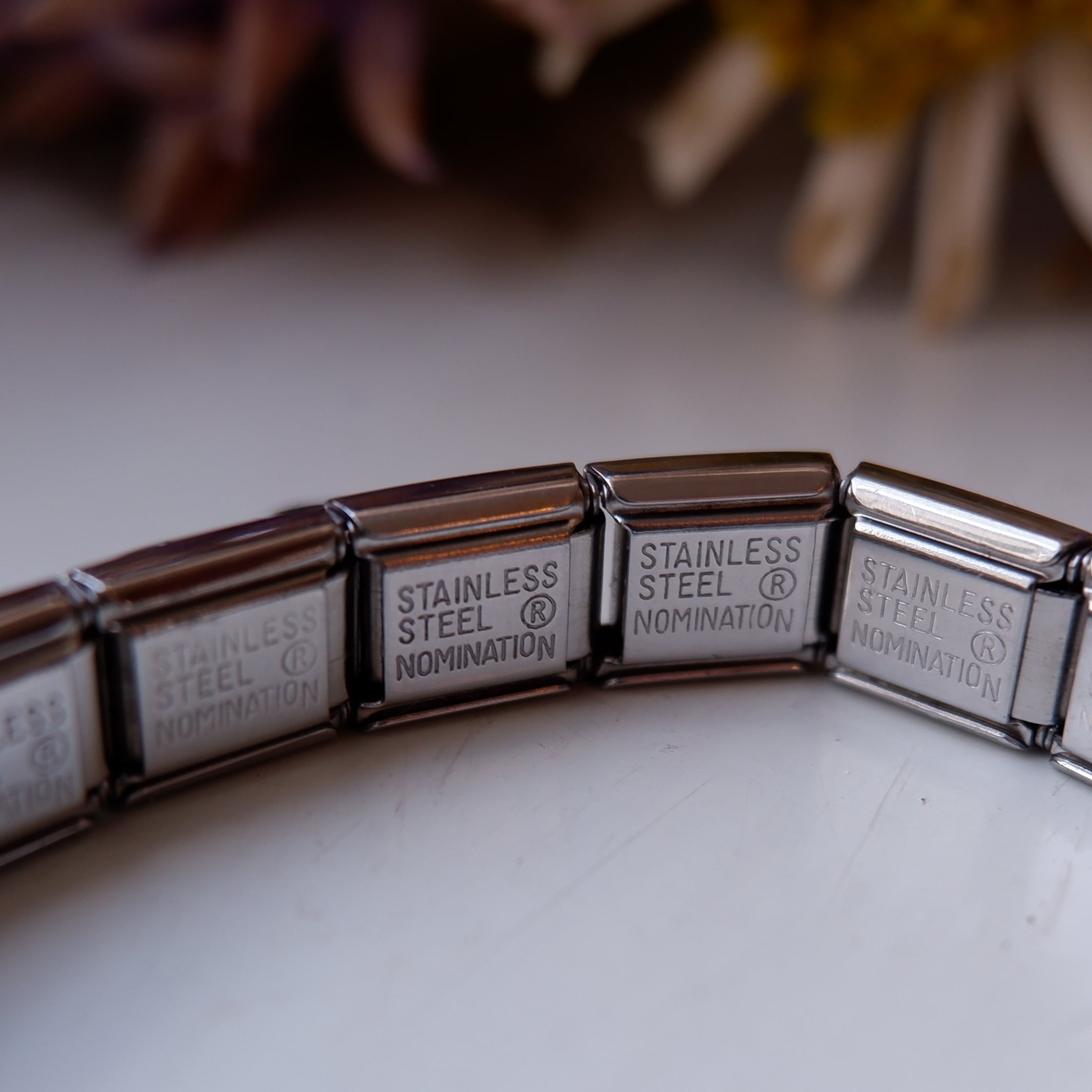 一つ一つのコマの背面に、ブランドと素材名 (NOMINATION / STAINLESS STEEL ®️NOMINATION) が刻印されてあります。