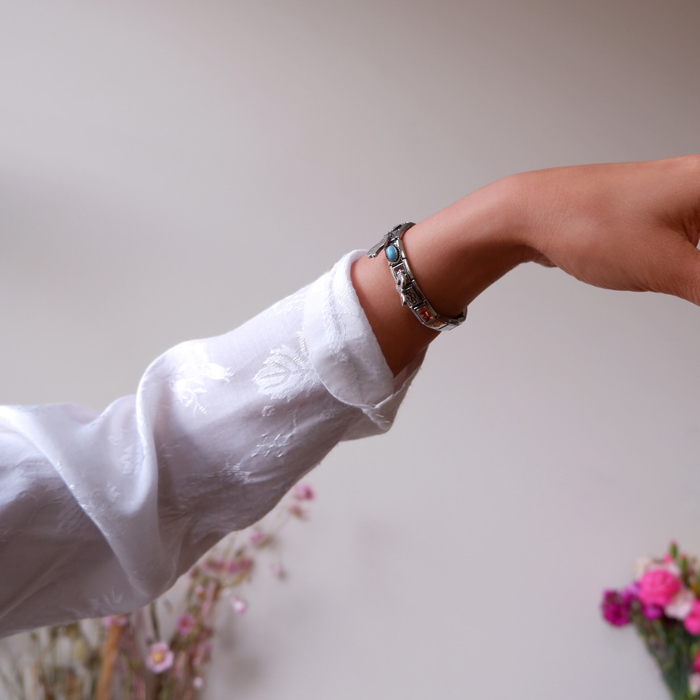 小さな猫と鍵のチャームが揺れるデザインのステンレス製ブレスレットです。