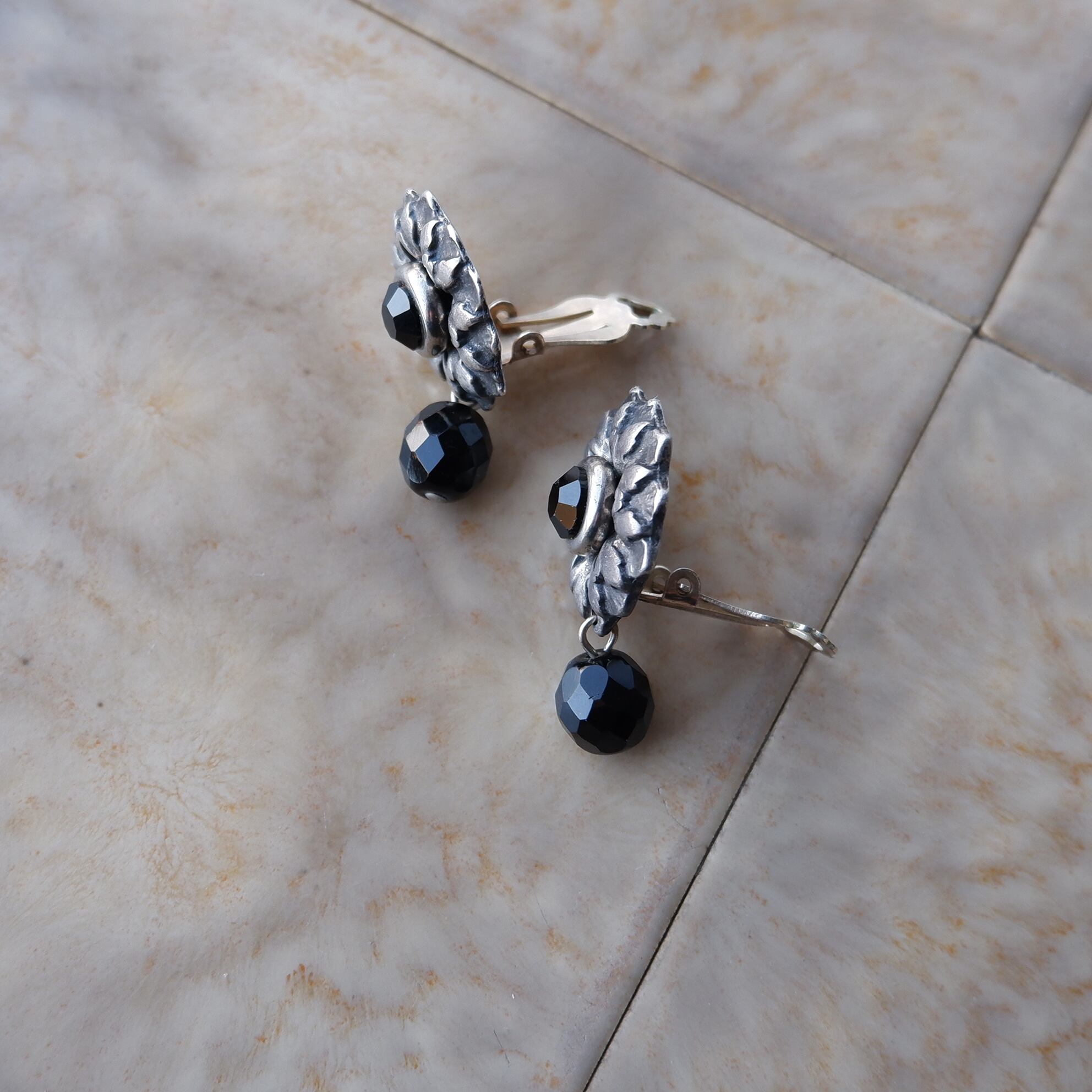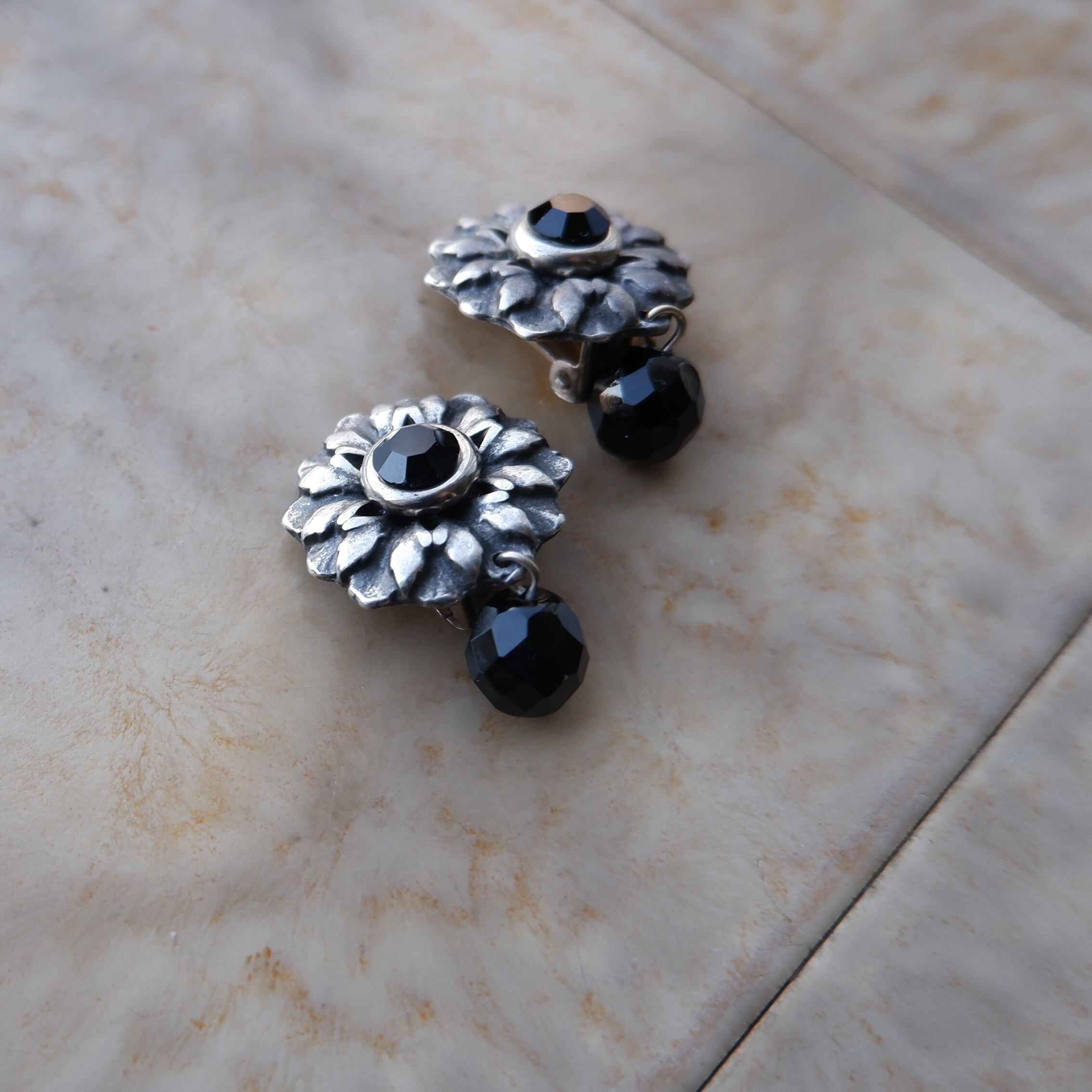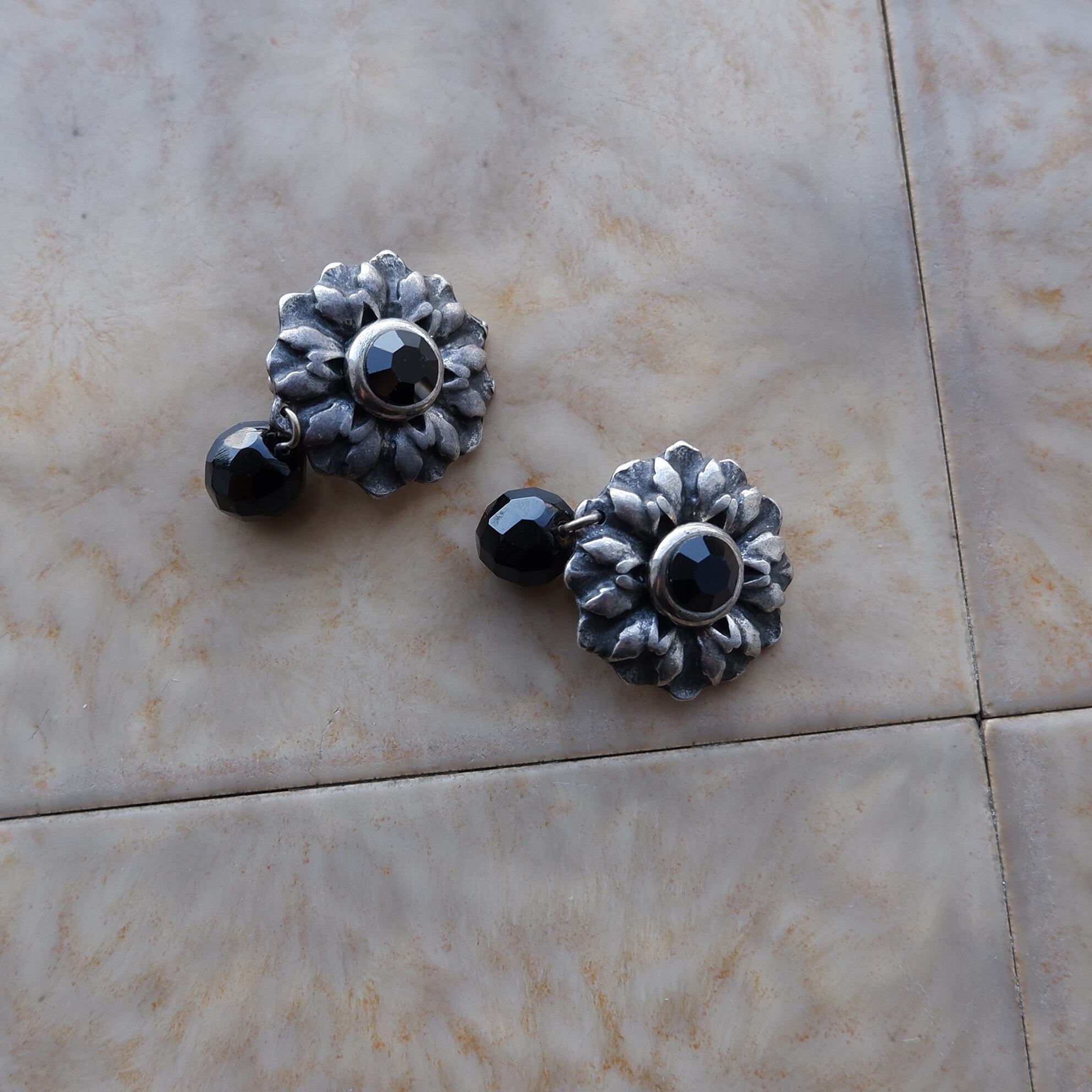重厚感のある彫金細工の花びらにビジューの花芯が施されたイヤリングです。