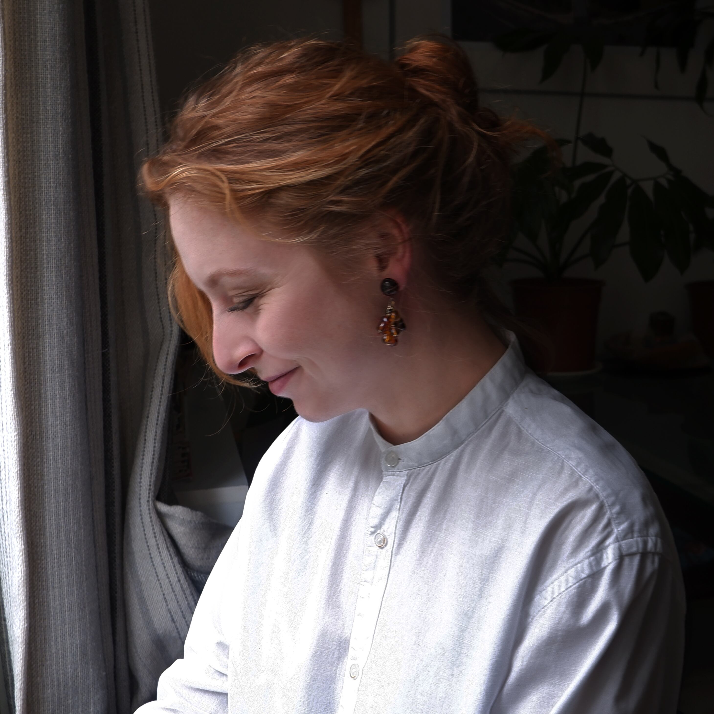 アンバー風の色合いをしたモチーフが優しく耳元で揺れる、優しい印象の一品です。