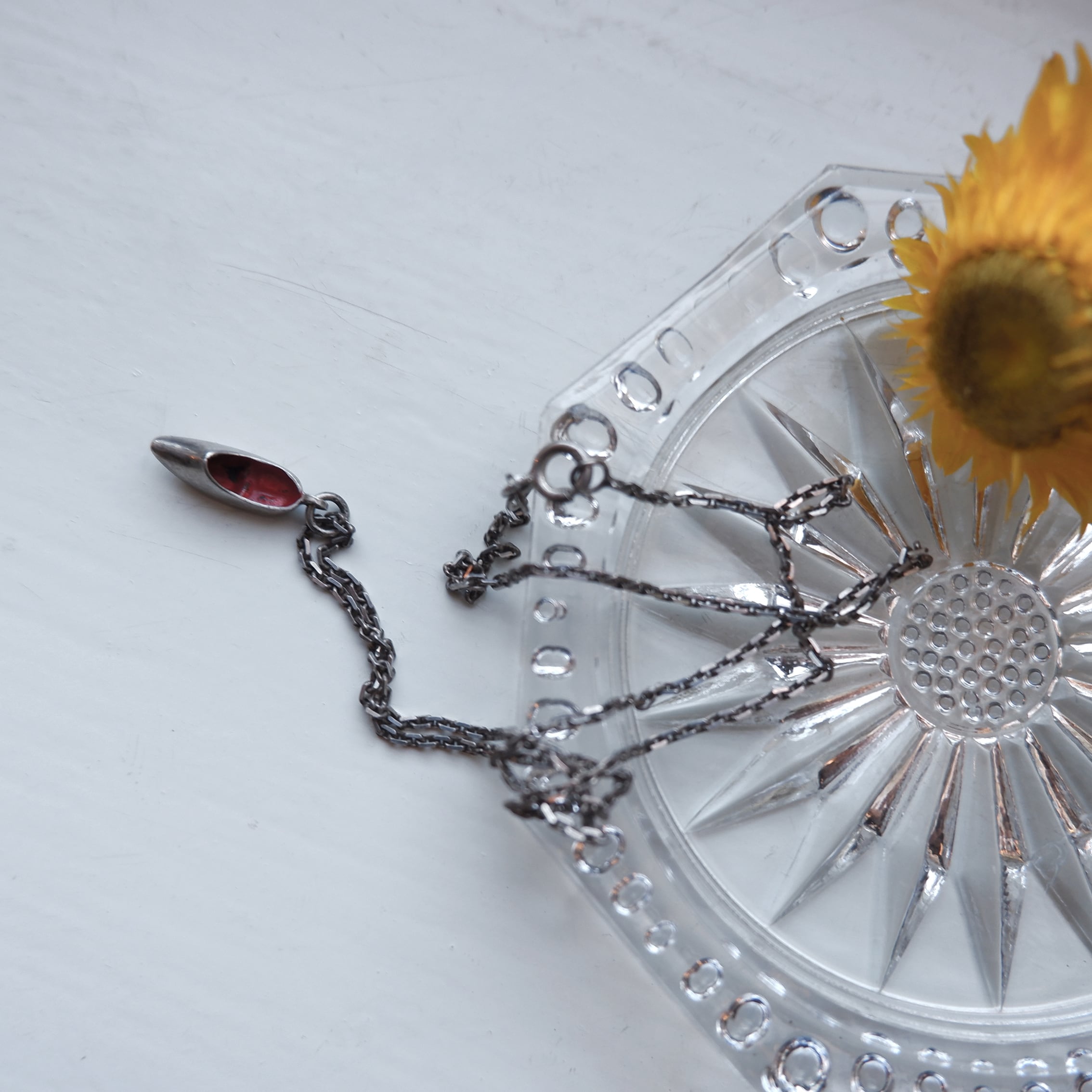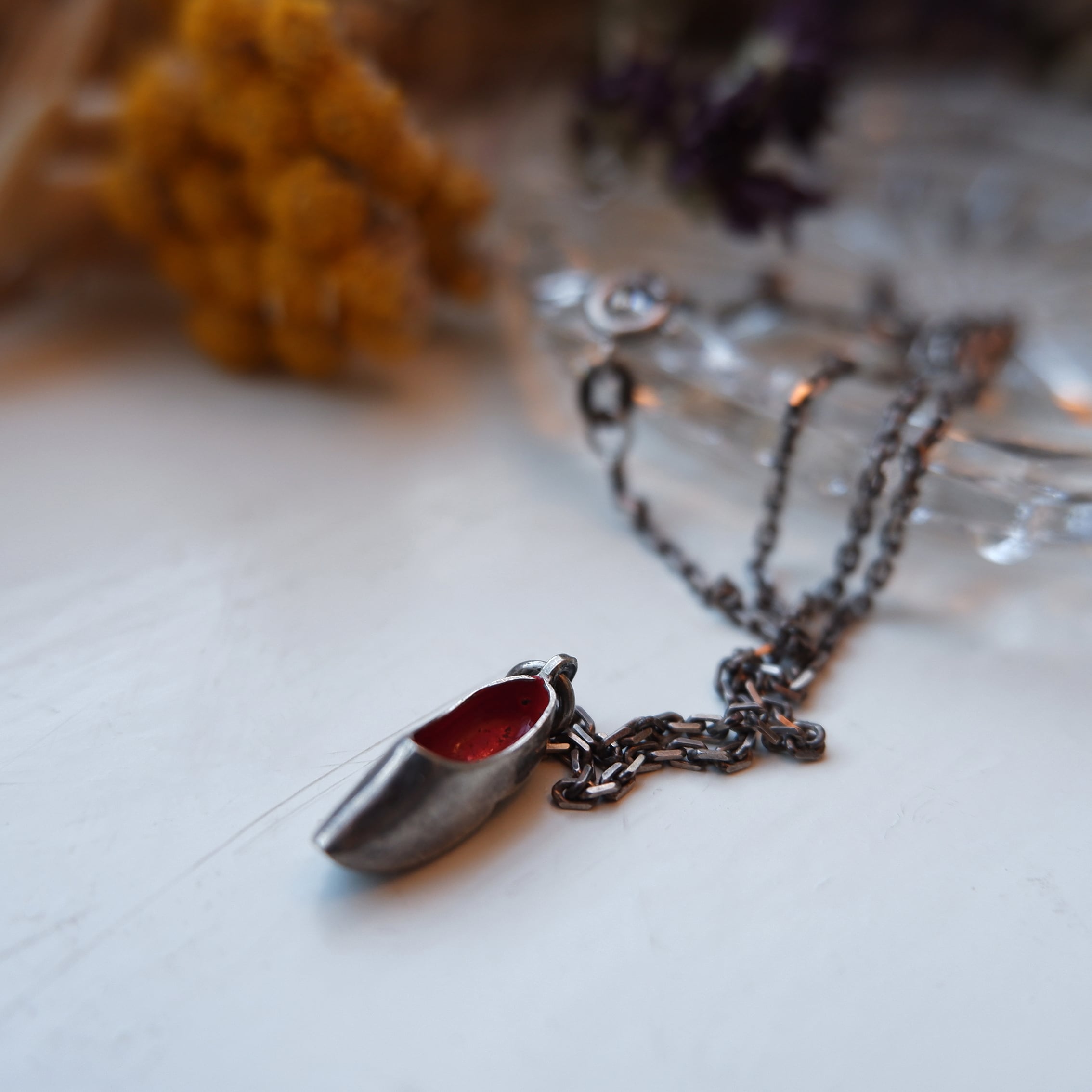 ペンダントの動きや角度によって、赤い中敷が顔を覗かせます。さりげないサイズが可愛い一品です。