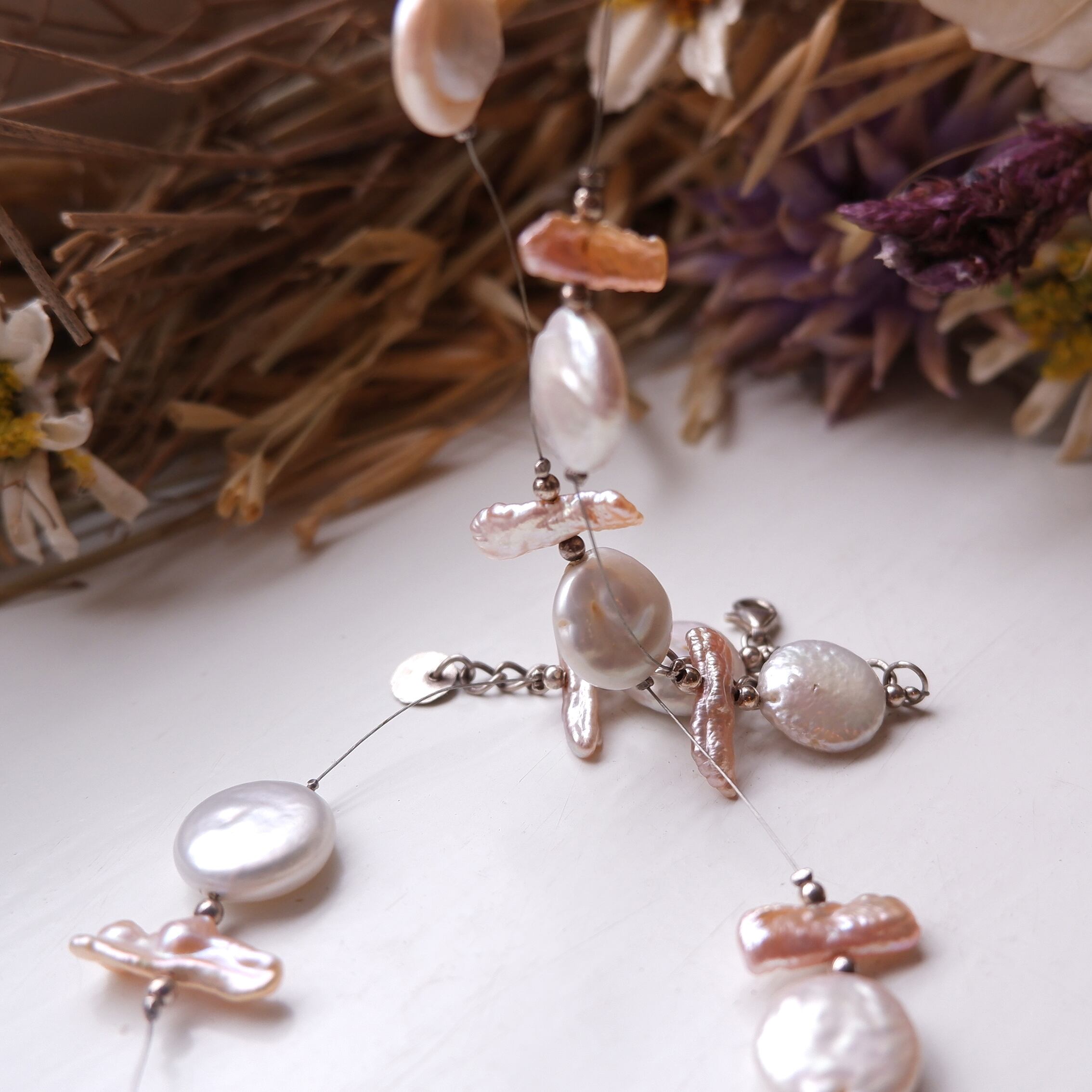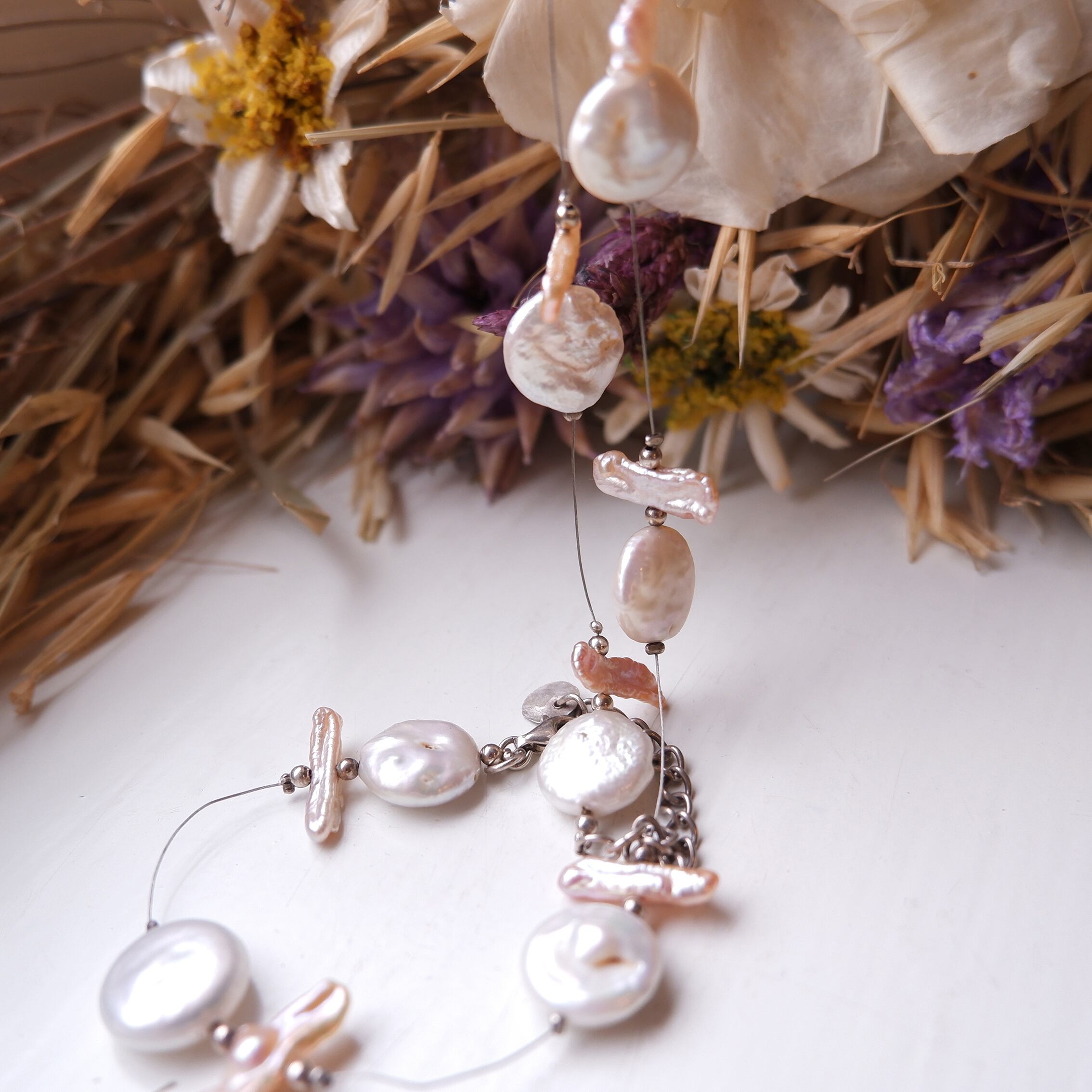 シルバー製のワイヤーに不揃いのパールビーズが散りばめられたネックレスです。