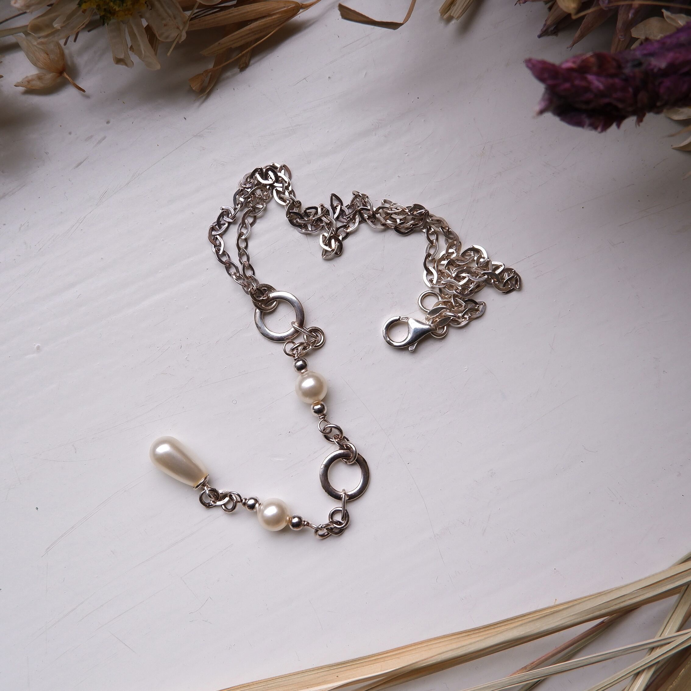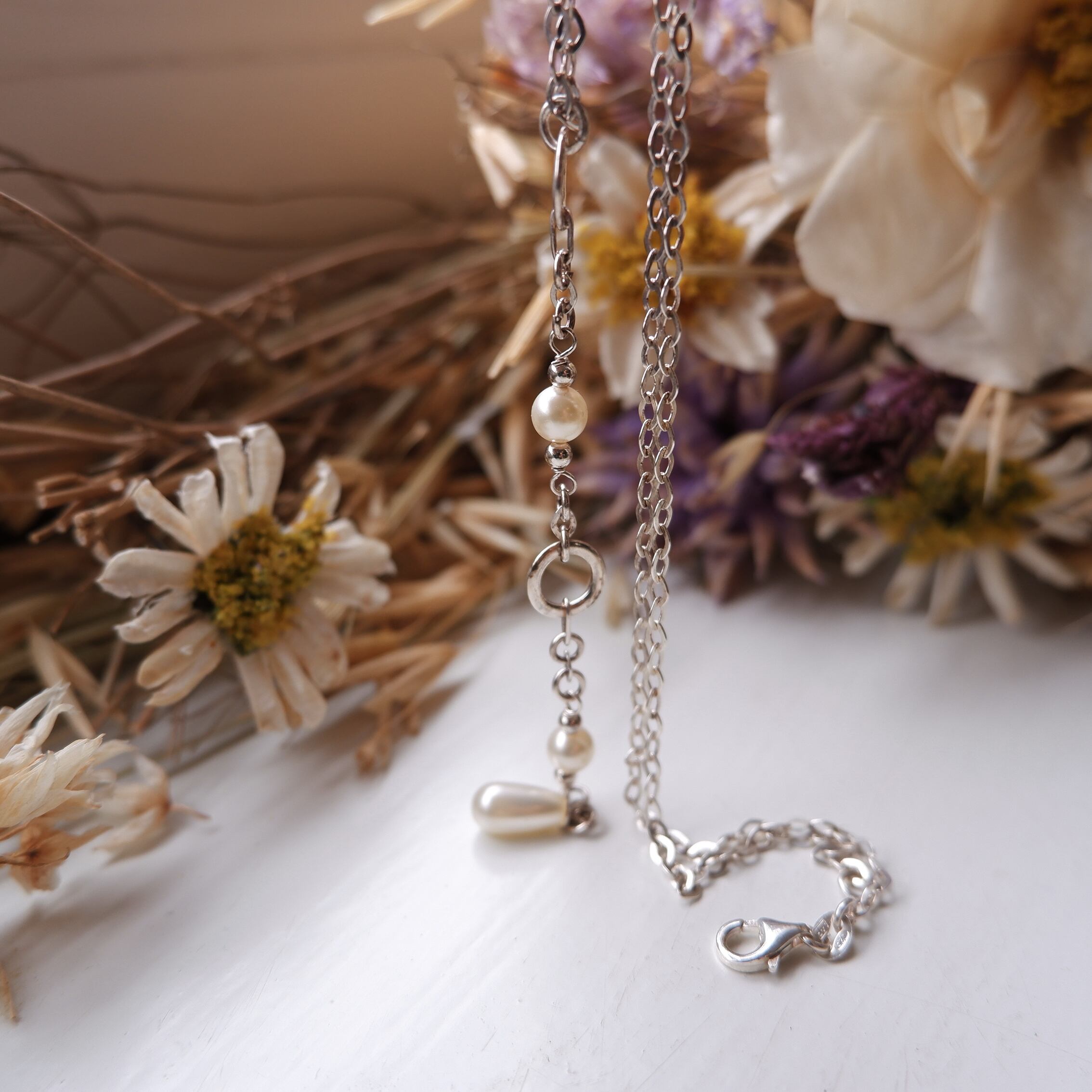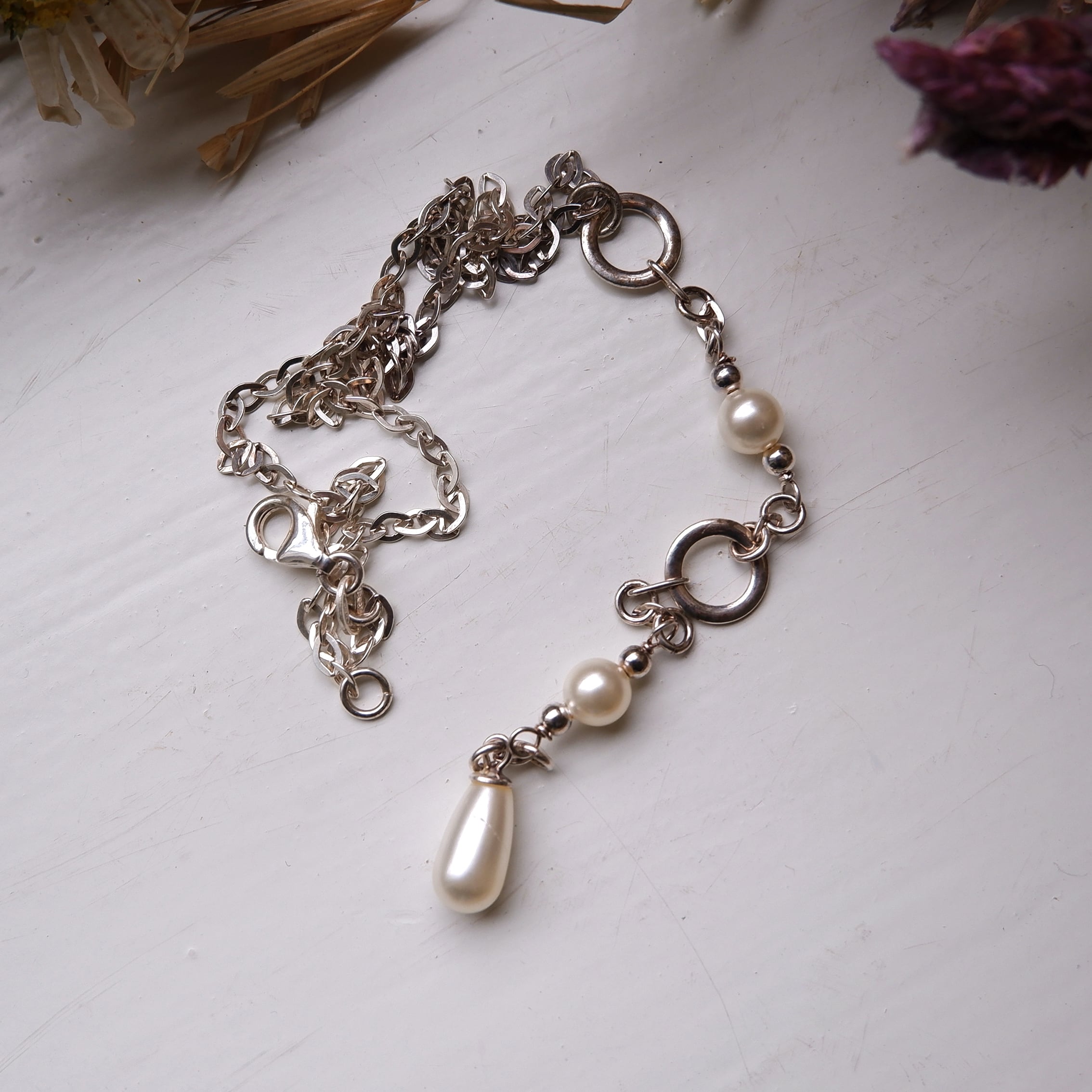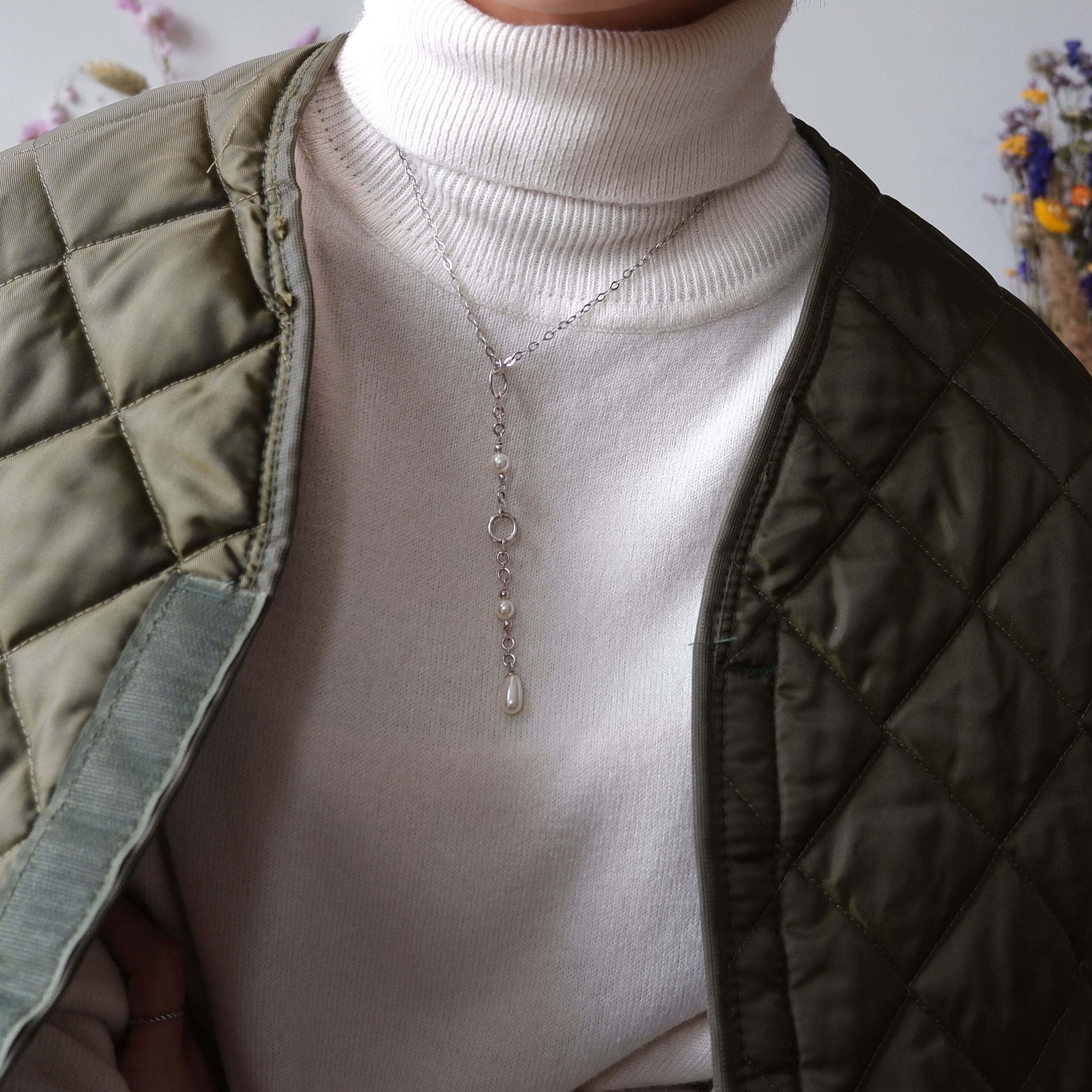 アイボリーカラーのパールビーズが施された、Y字ラインのシルバー製ヴィンテージネックレスです。