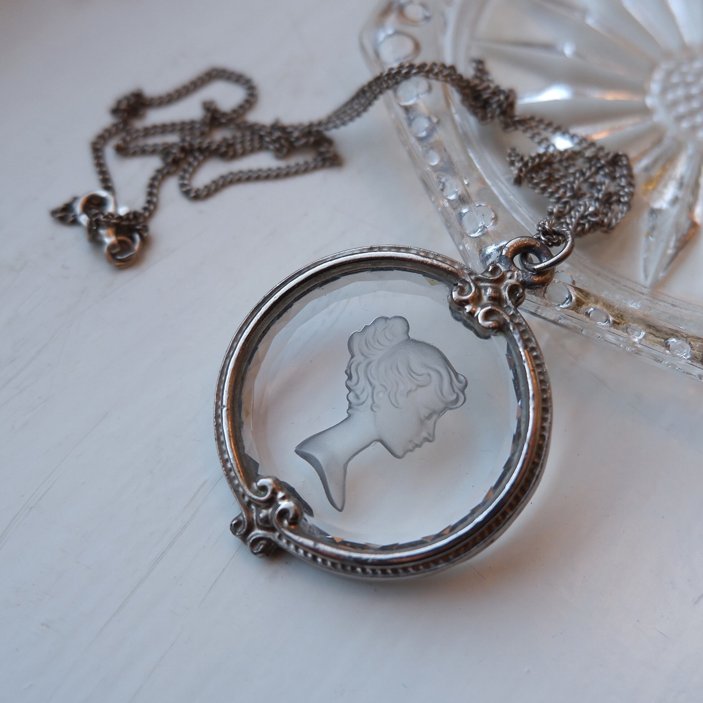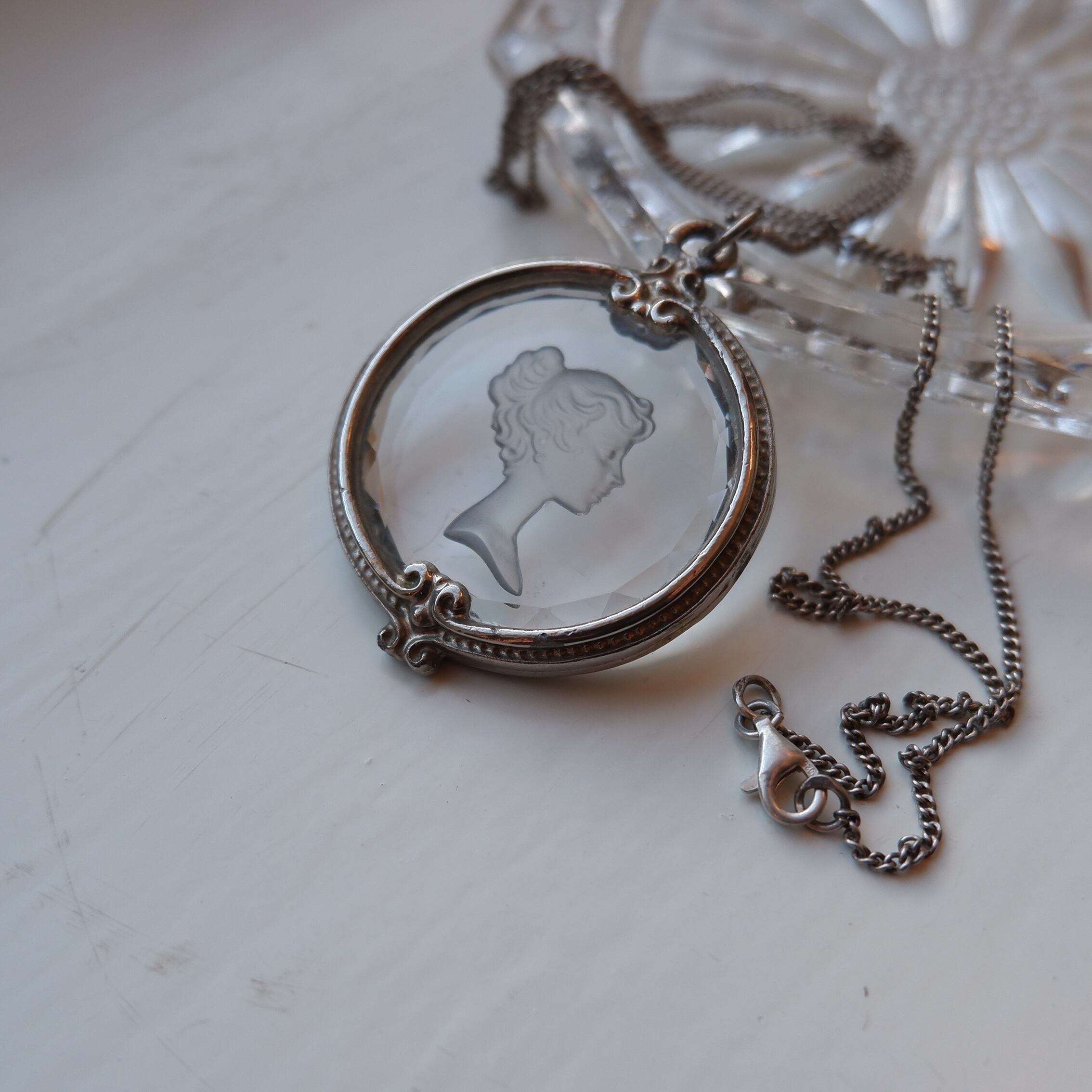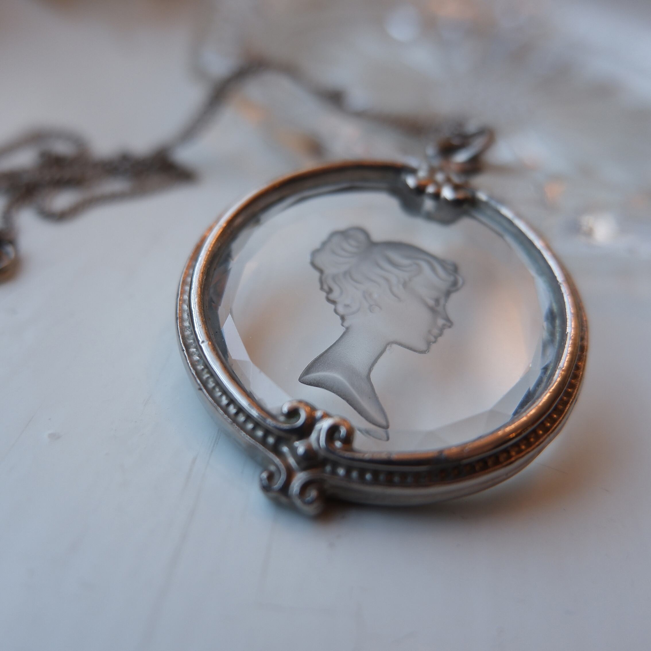 しなやかな髪の流れまで表現されたインタリオの細工と、縁のクリスタルカット、そこにぴったりと沿うように手作業で充てがわれた銀の額。