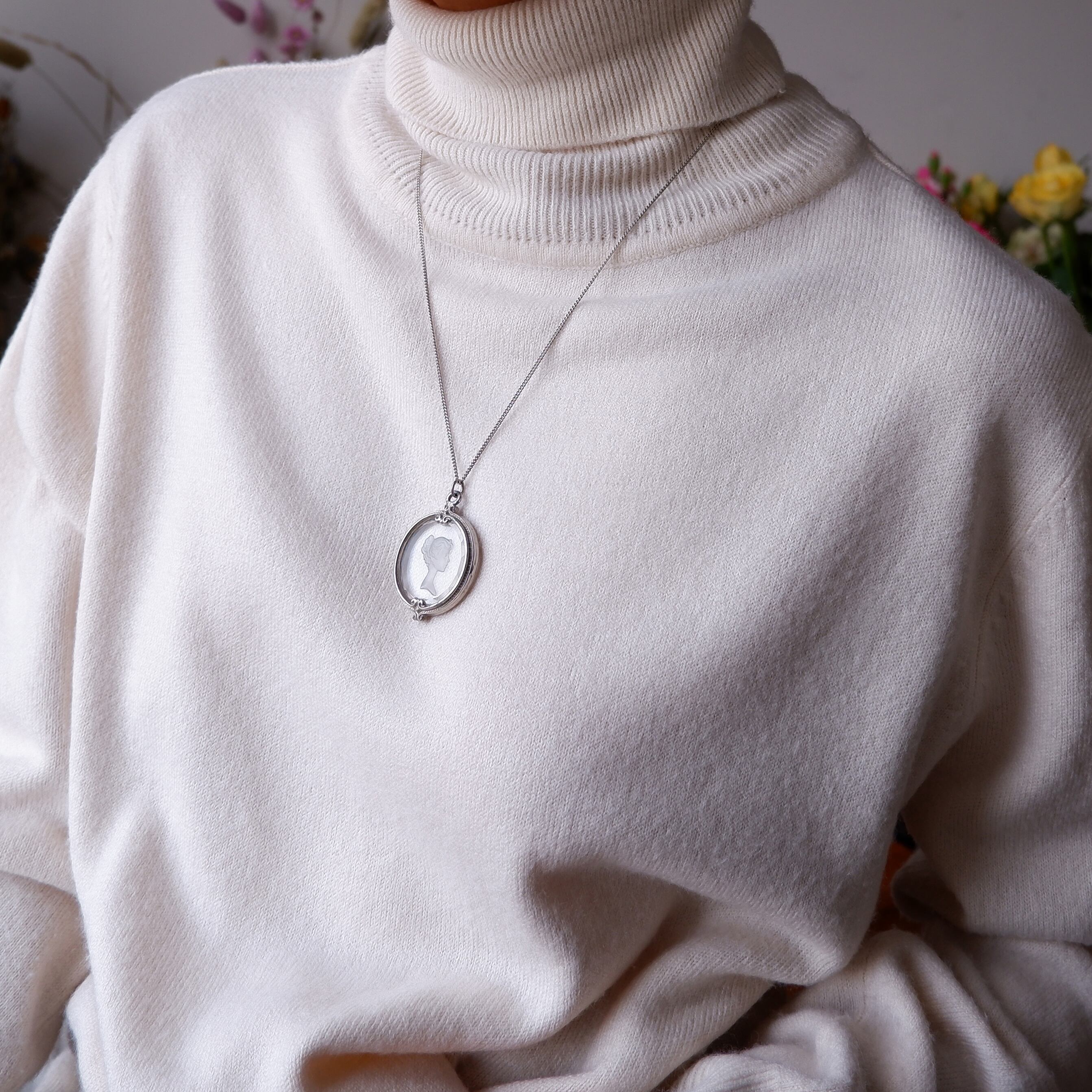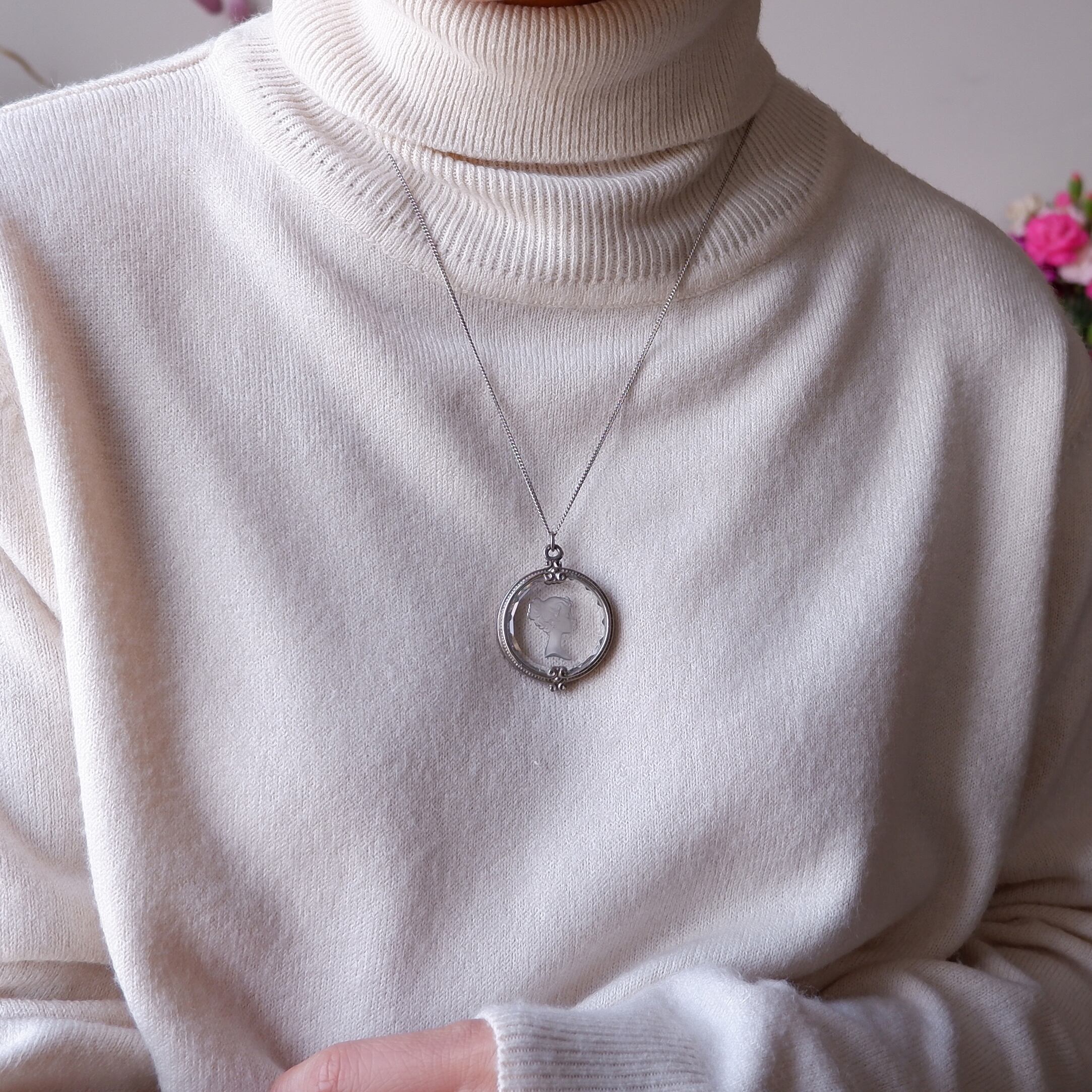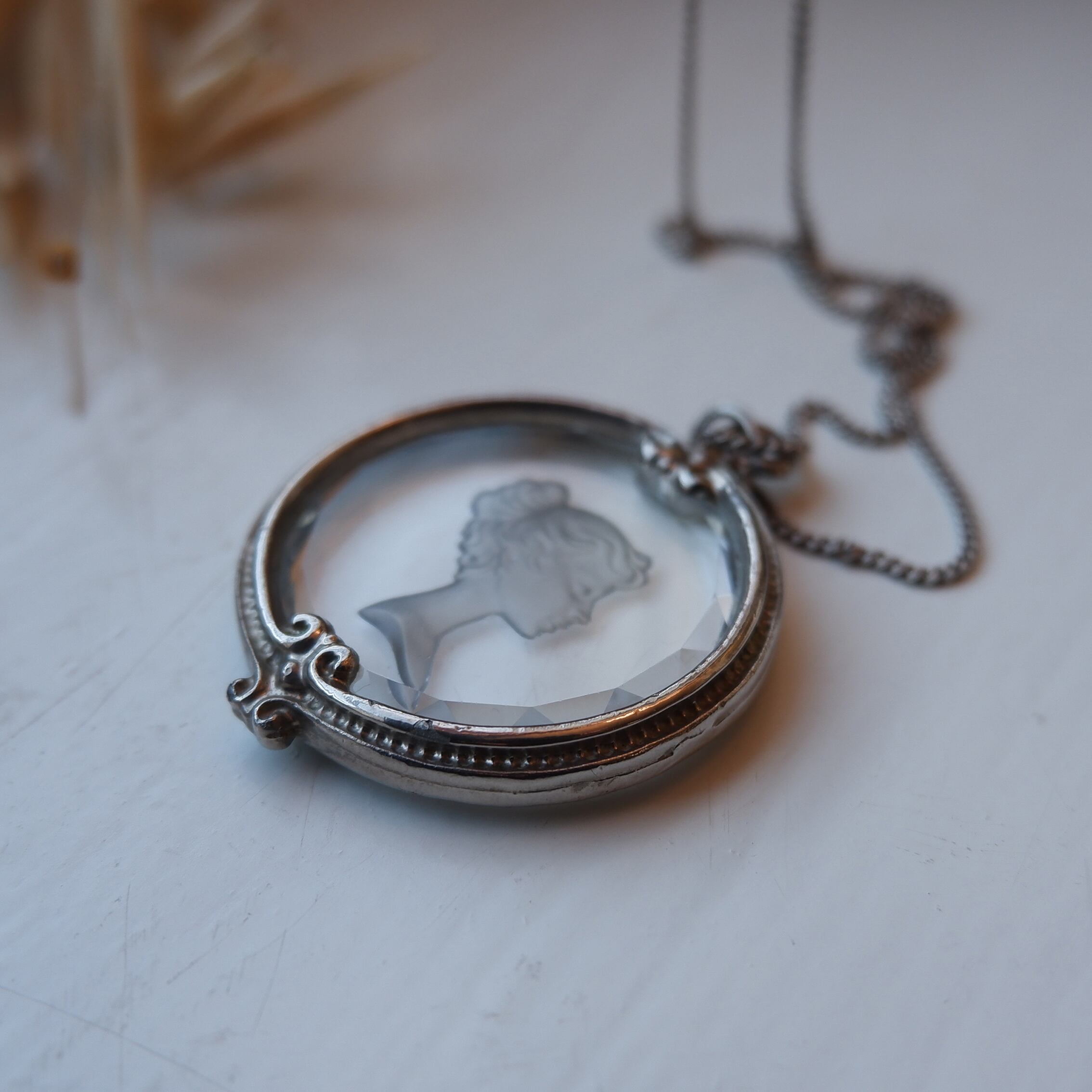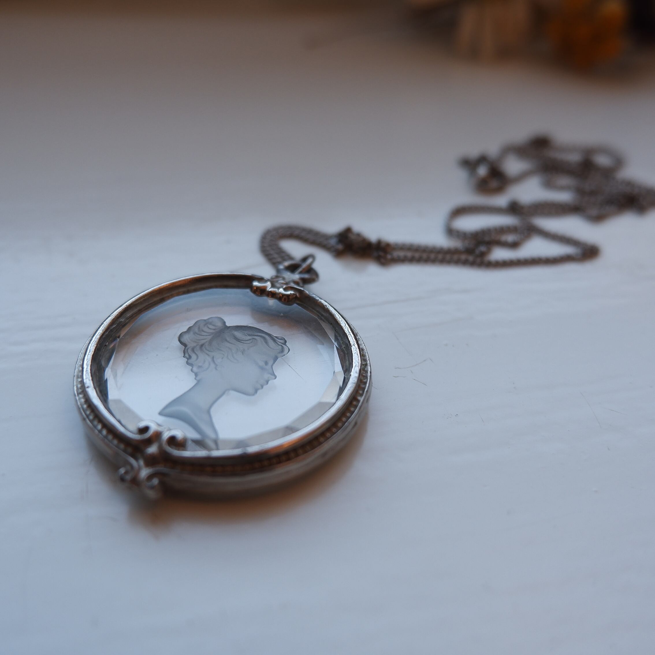 しなやかな髪の流れまで表現されたインタリオの細工と、縁のクリスタルカット、そこにぴったりと沿うように手作業で充てがわれた銀の額。