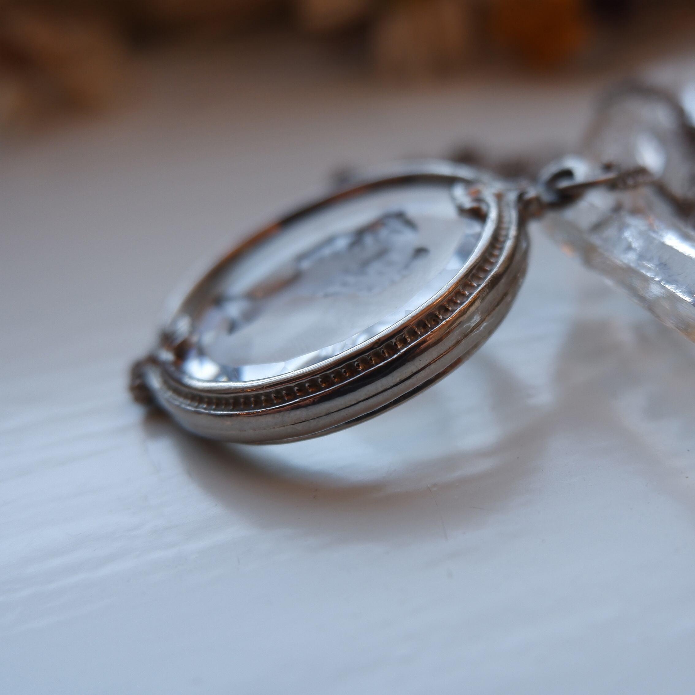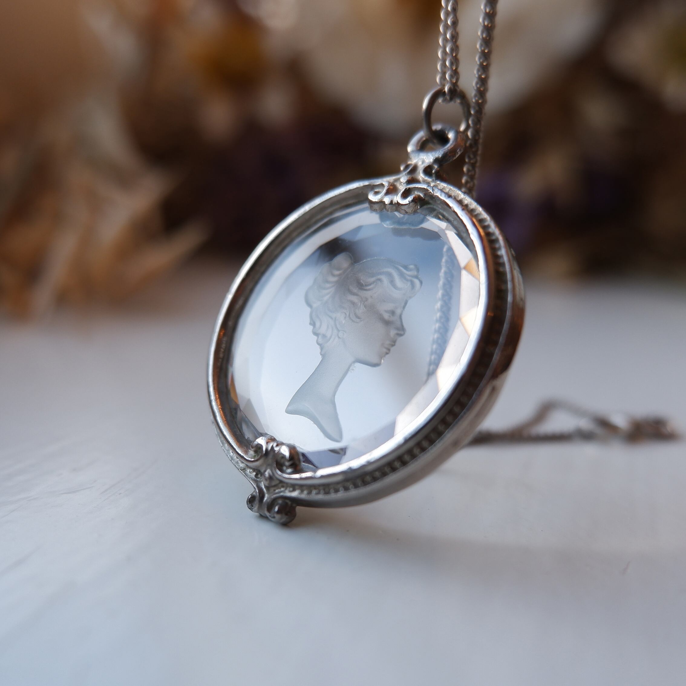 女性の横顔が彫刻されたジュエリーで知られる「カメオ」に良く似たこちらは、「クリスタル・インタリオ」。