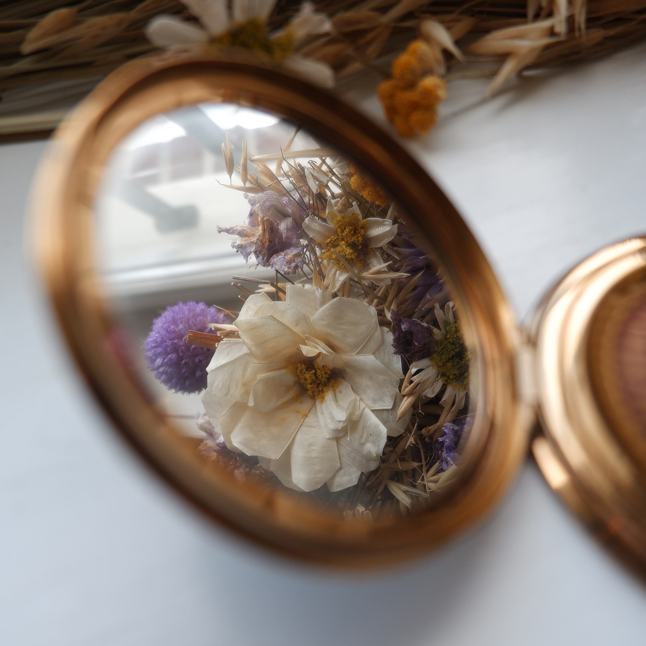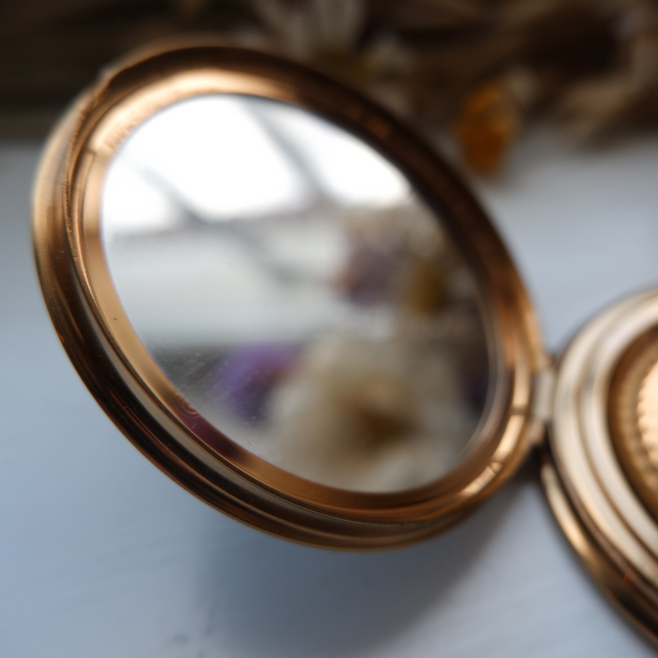 また、鏡は古い時代のオリジナル品のままですので、表面上に全体的に細かい傷が付いています。コンパクトミラーとして日常使い頂きたい場合には、鏡を取り替えるか、市販のミラーシートなどを上から使用されても良いかも知れません。