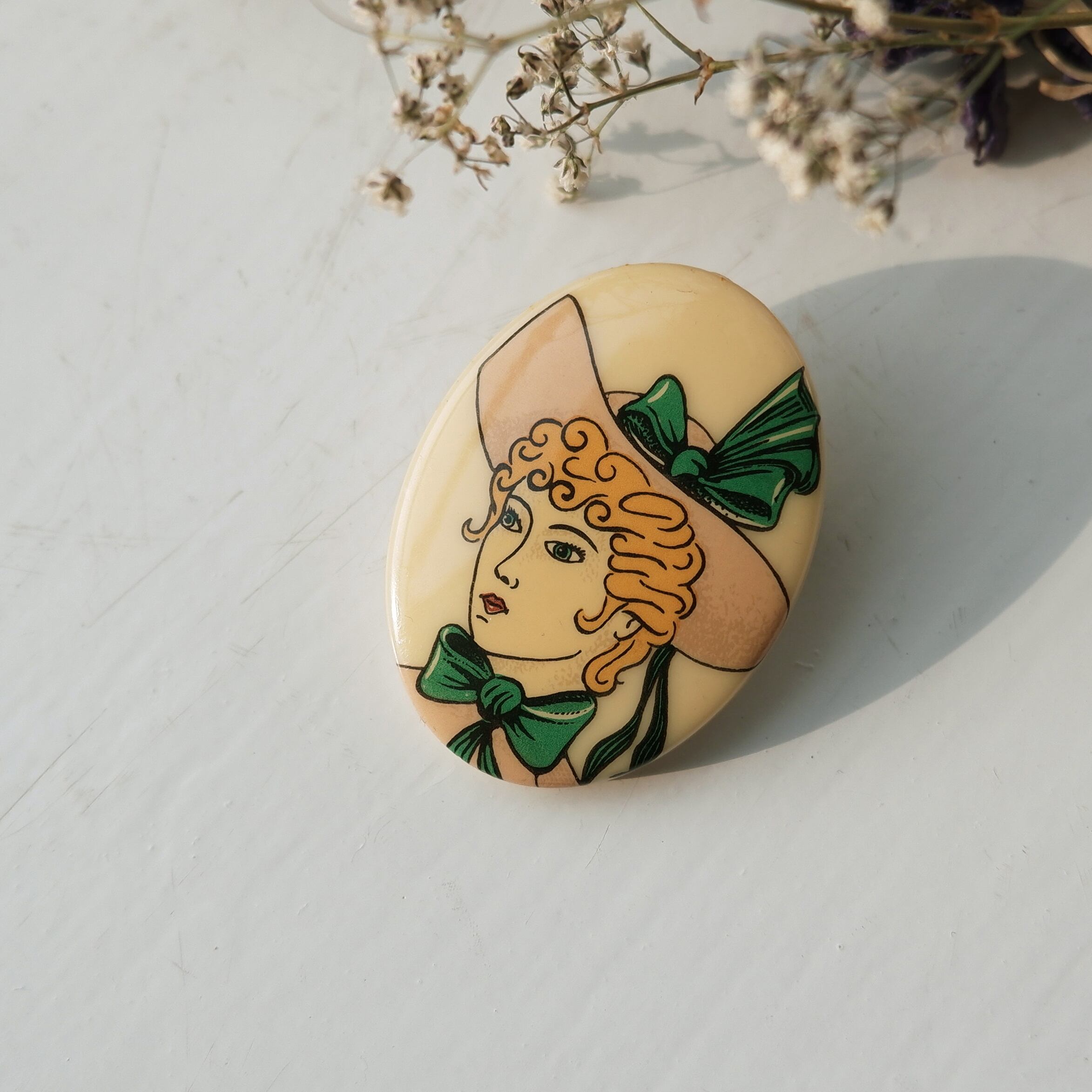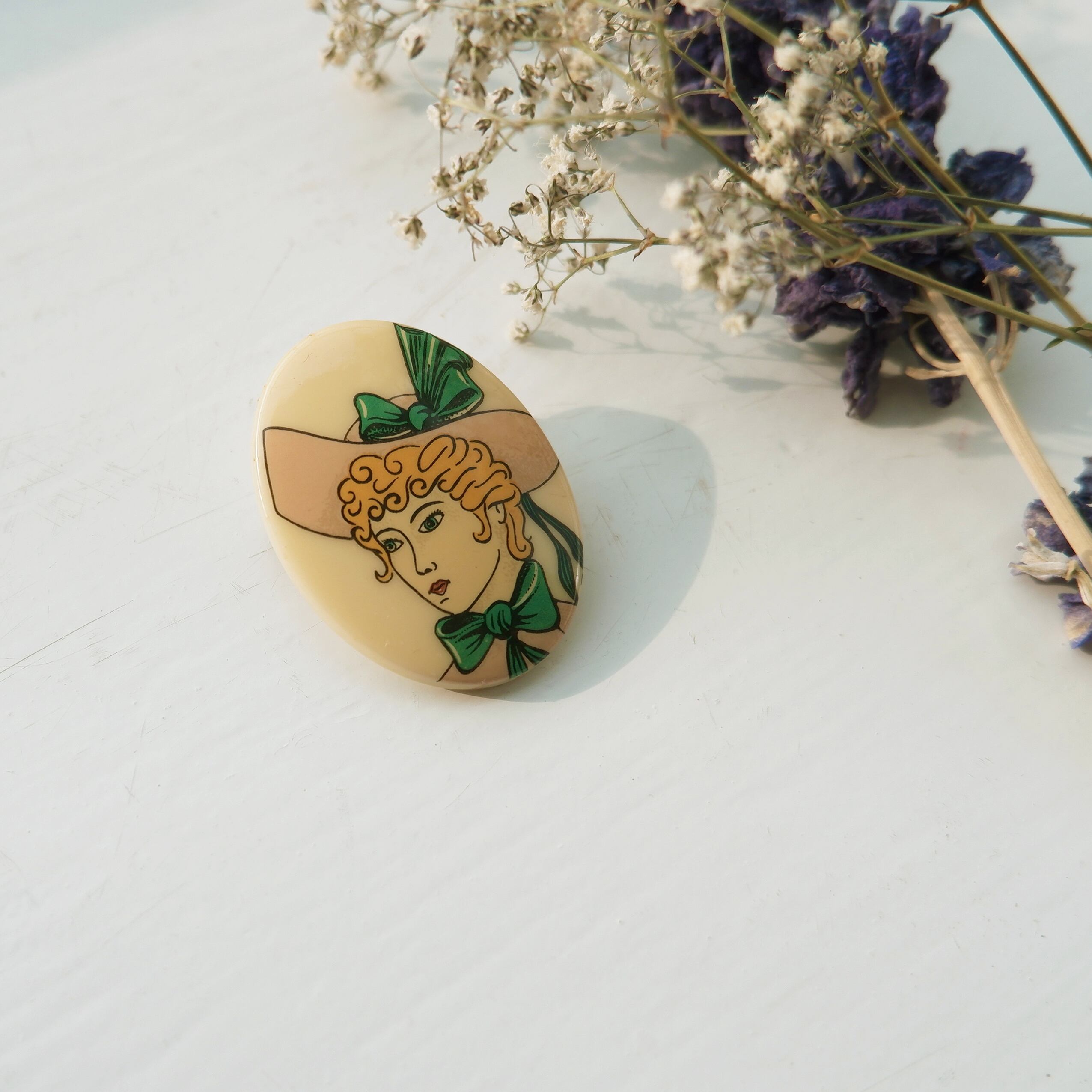大きなリボンが特徴的なオールドファッションを身に纏った女性が描かれています。
