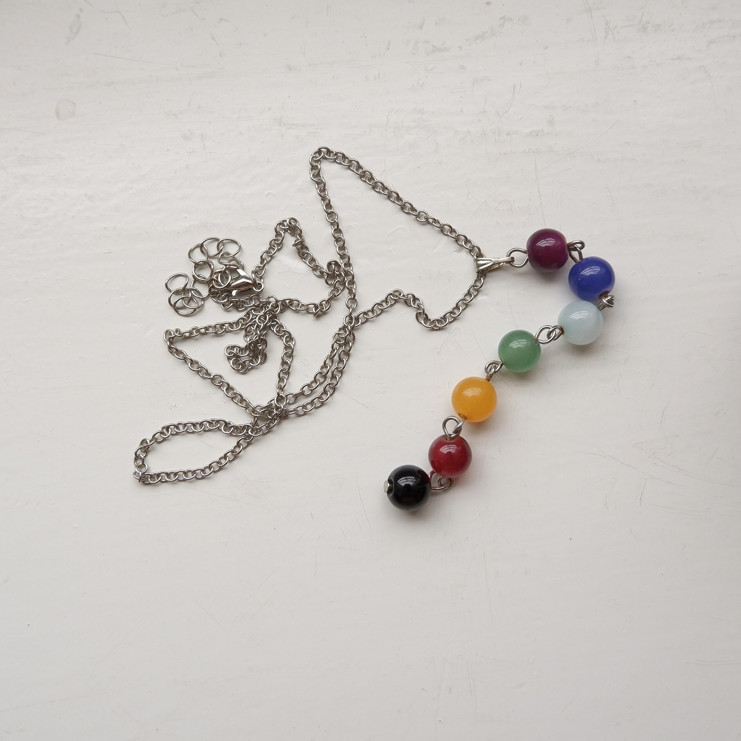 ペンダント部分には、オニキス・モスアゲート・カルサイトなどの7つの石が連なっています。いずれもパワーストーンとして持ち主を守ってくれる事で知られている石です。