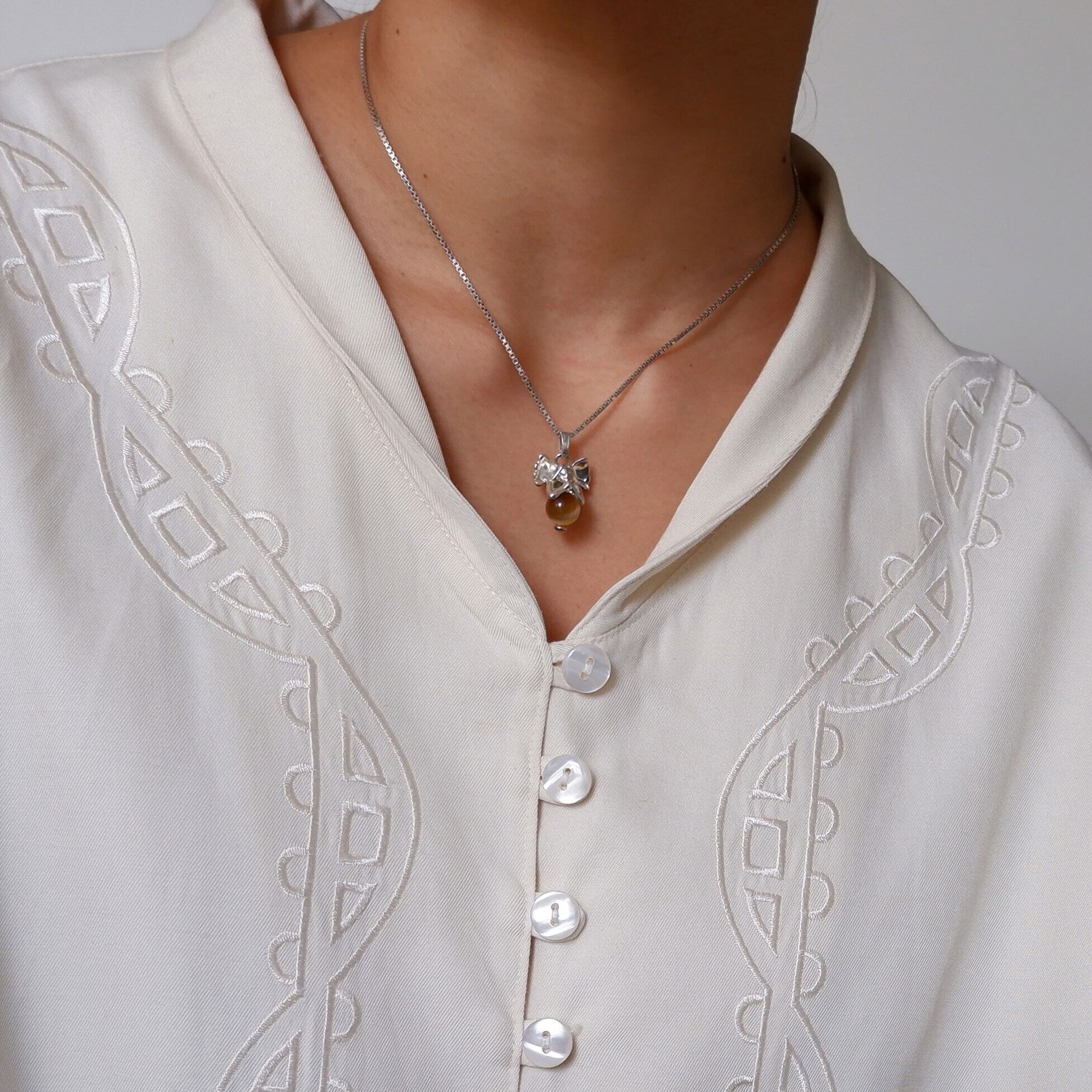 コンパクト目なので、写真のようなVネックトップやタートルネックなどに映えそう。
