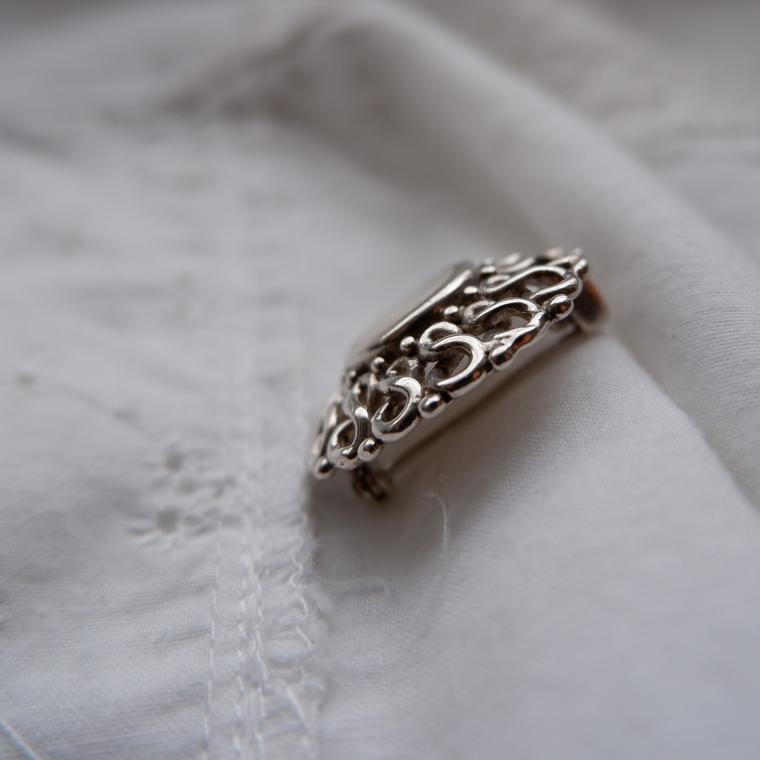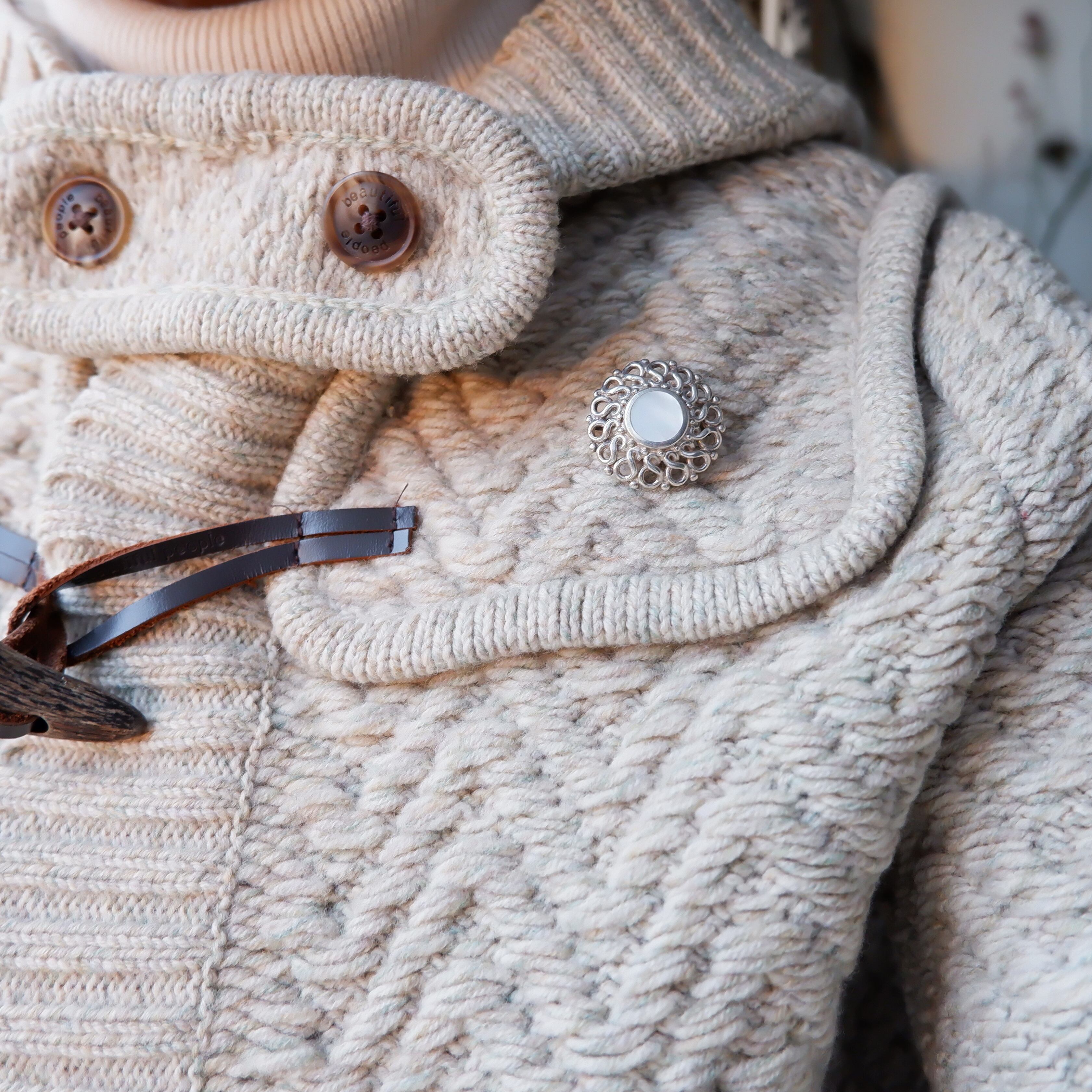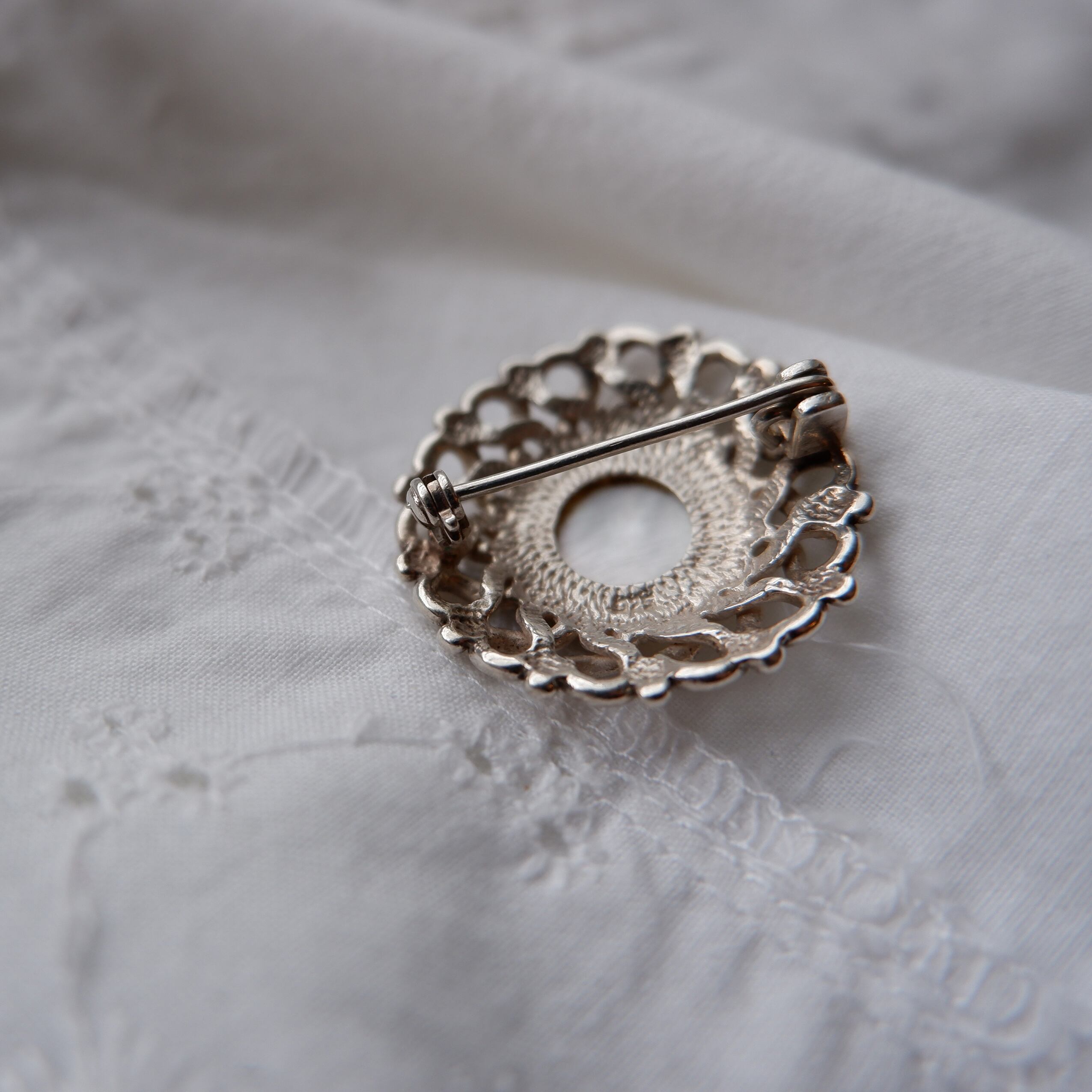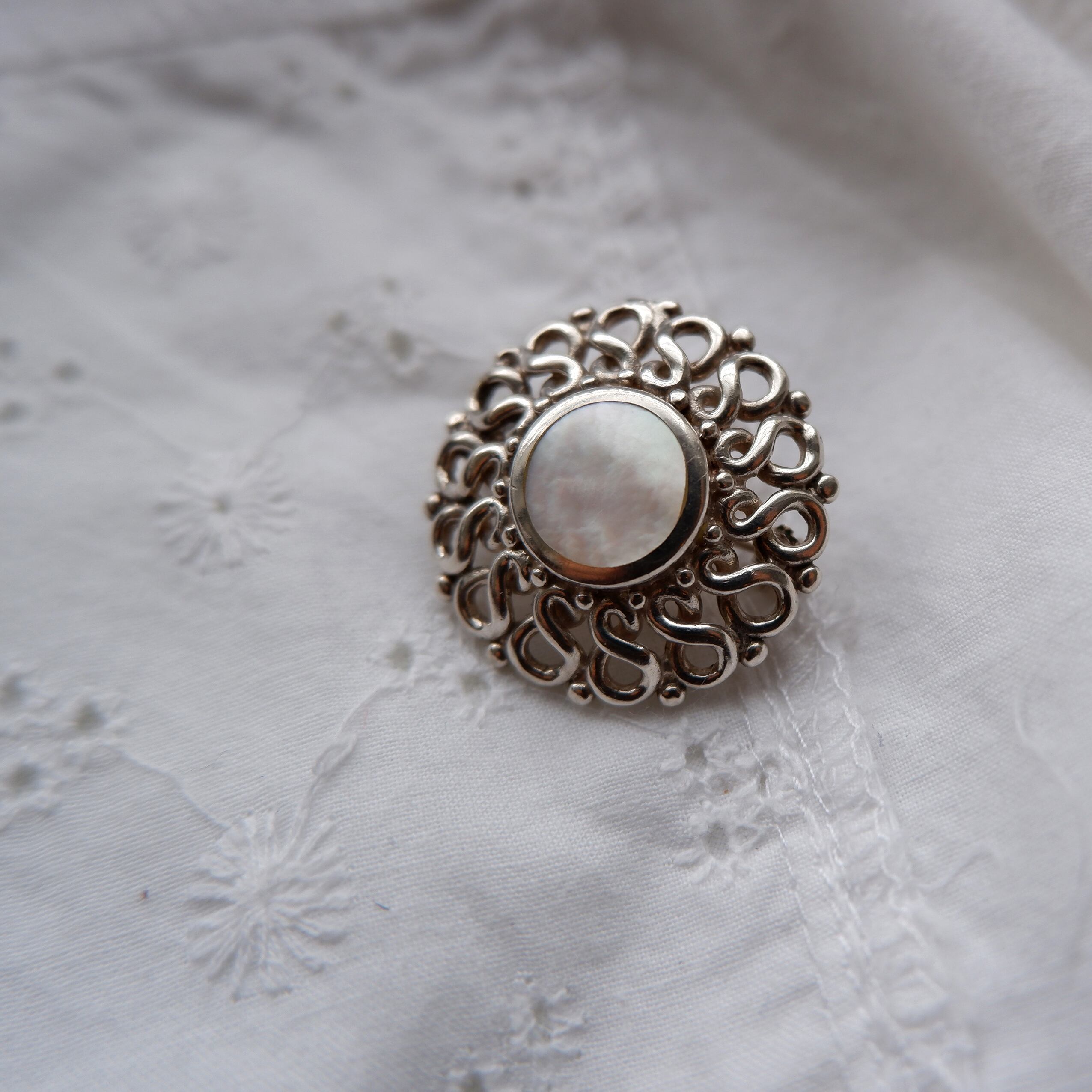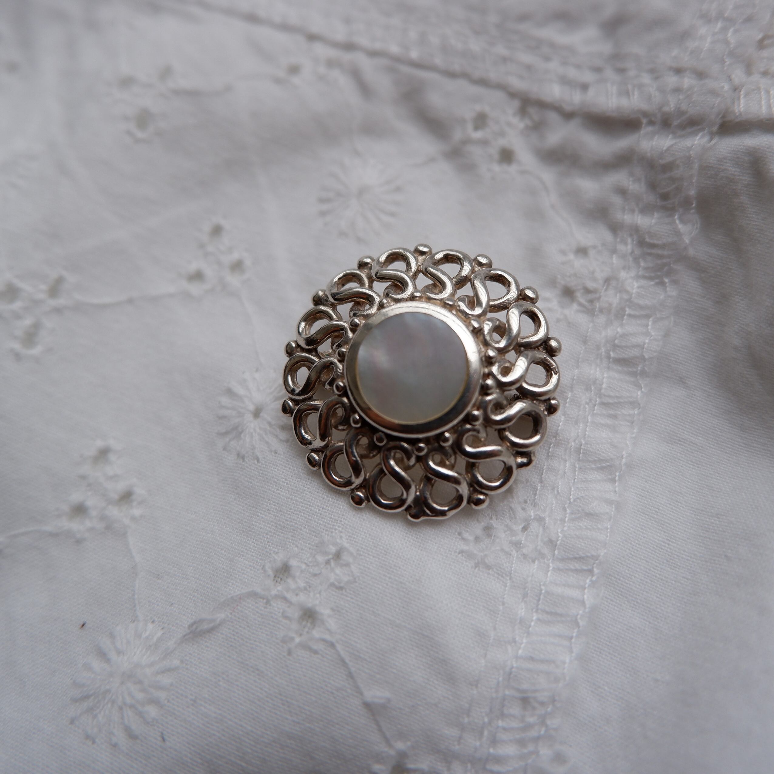 貝と真鍮が素材となったシルバープレート製のブローチです。