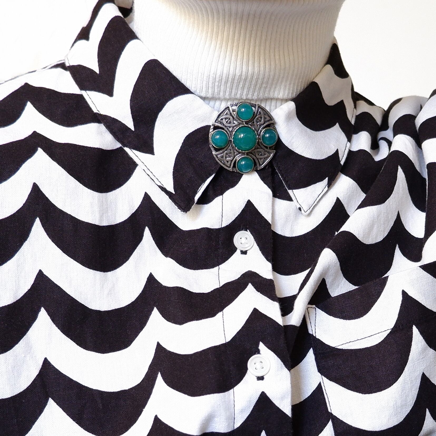 こちらは少し重みのあるアイテムですので、写真のような襟元や、厚みのある布地を選んで頂くと、より安定した着用感で楽しんでいただけます。