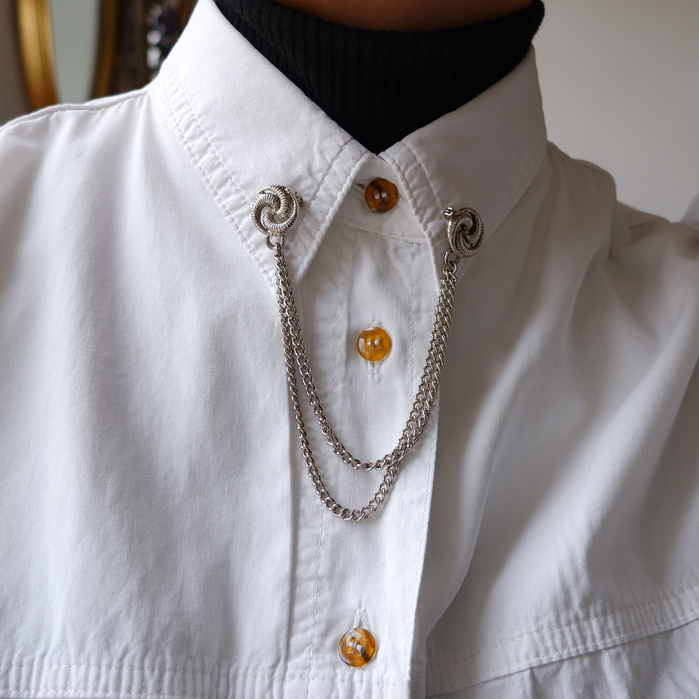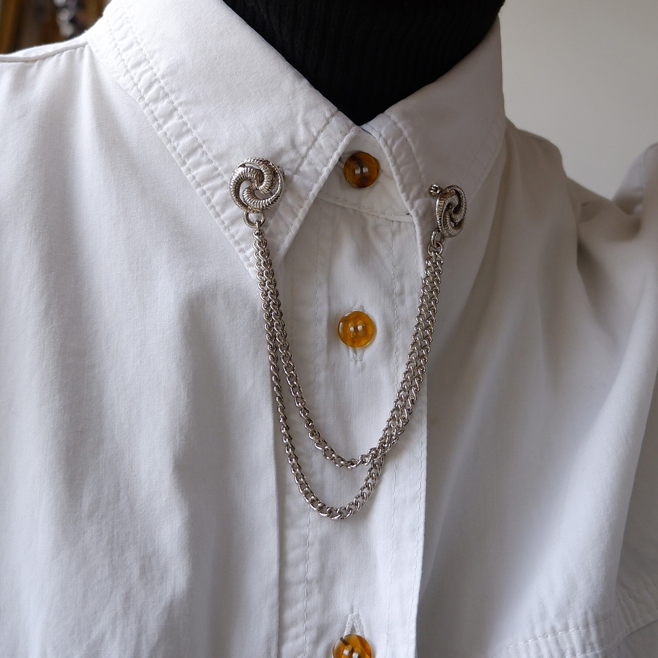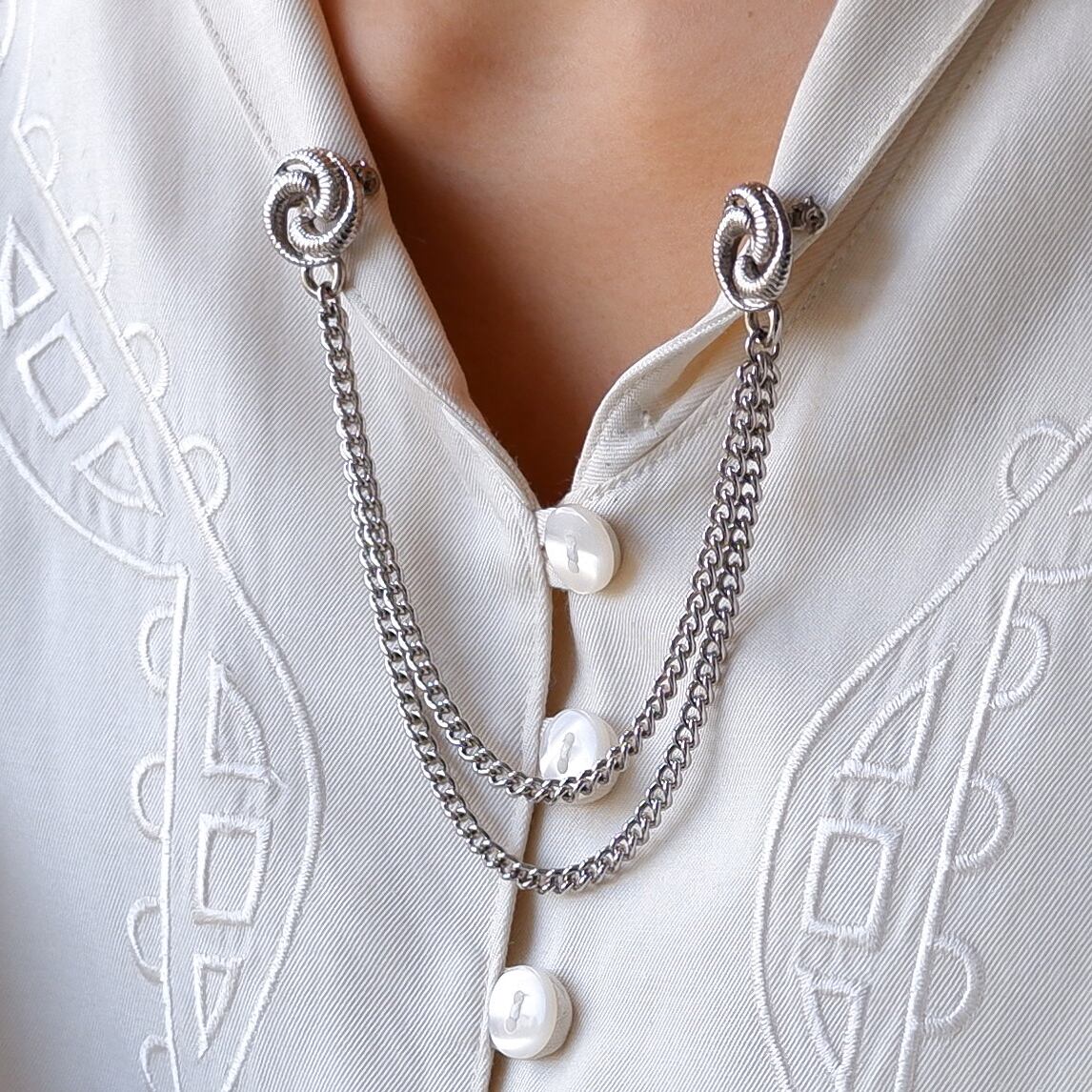 襟のあるシャツや、ジャケットの胸元、またカーディガンの前立てなど、様々なスタイルでお使いいただけます。