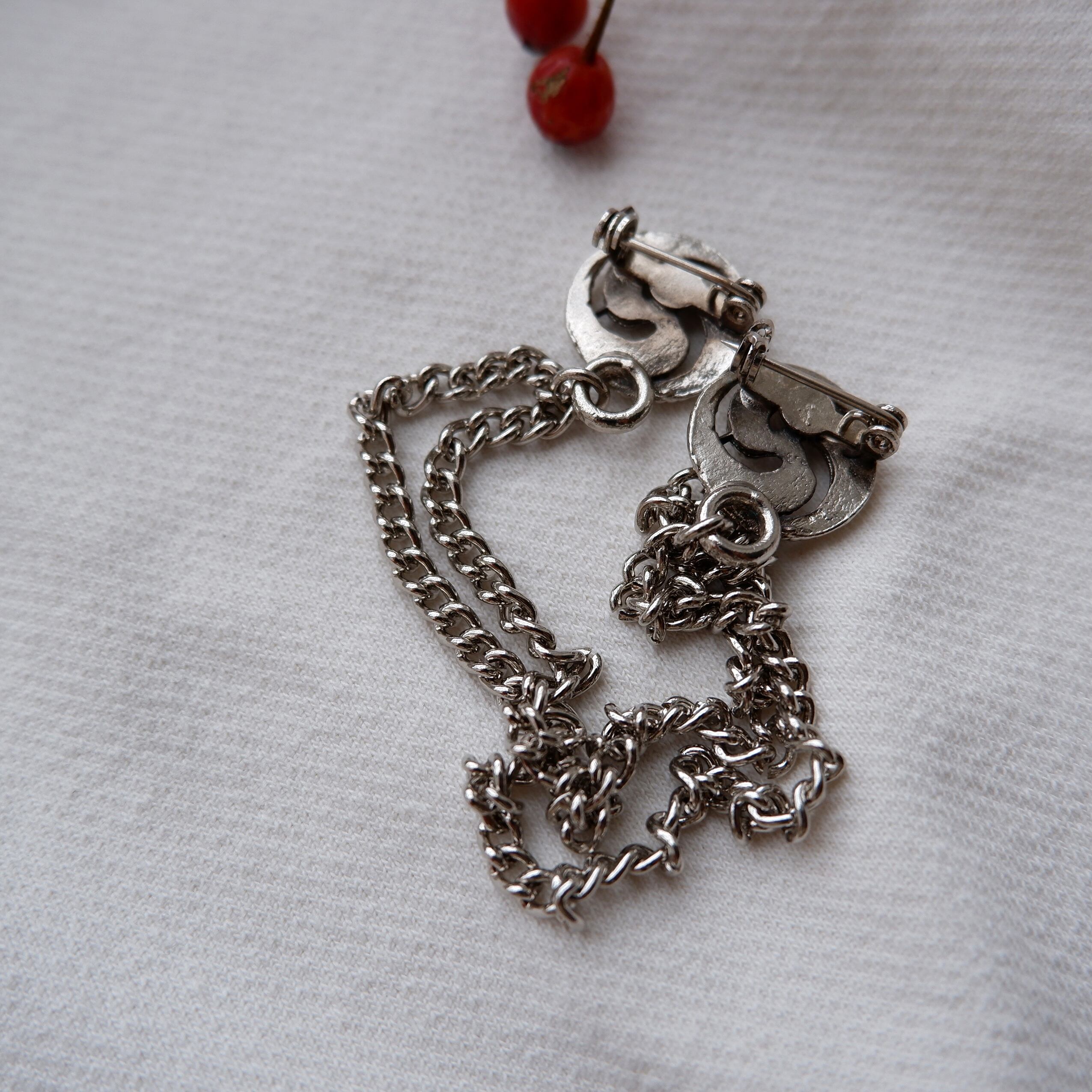 2連のチェーンで繋がった、つがいモチーフのブローチです。