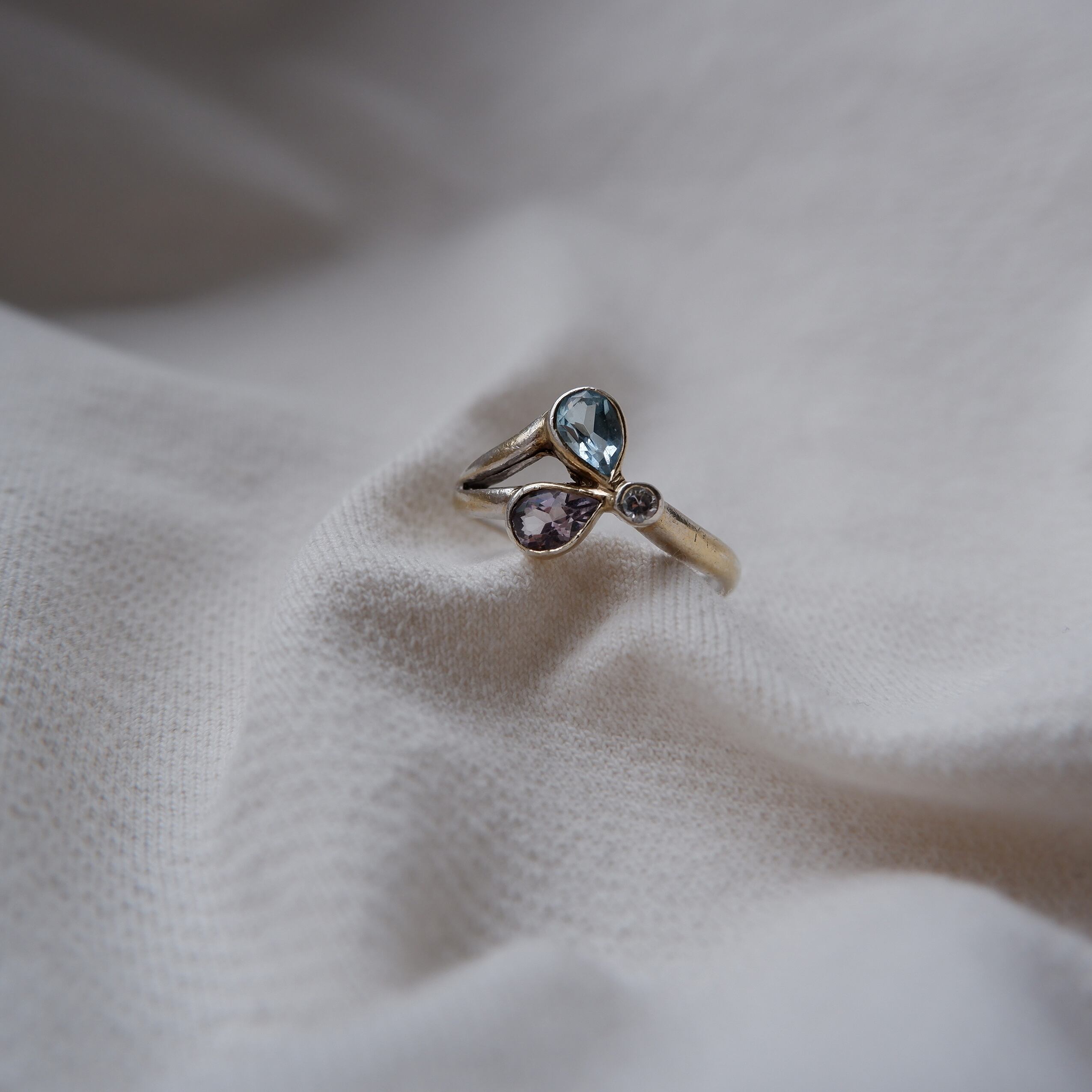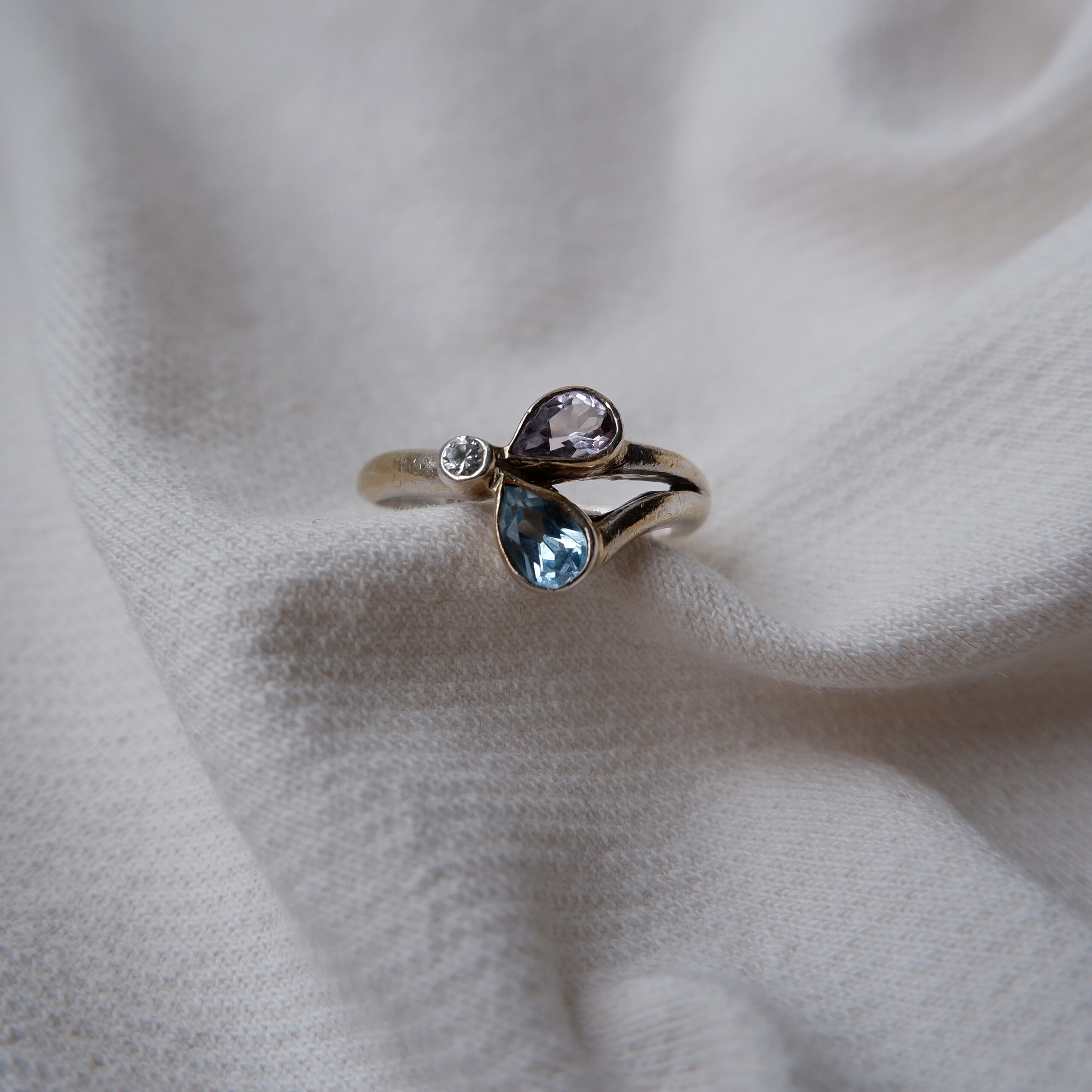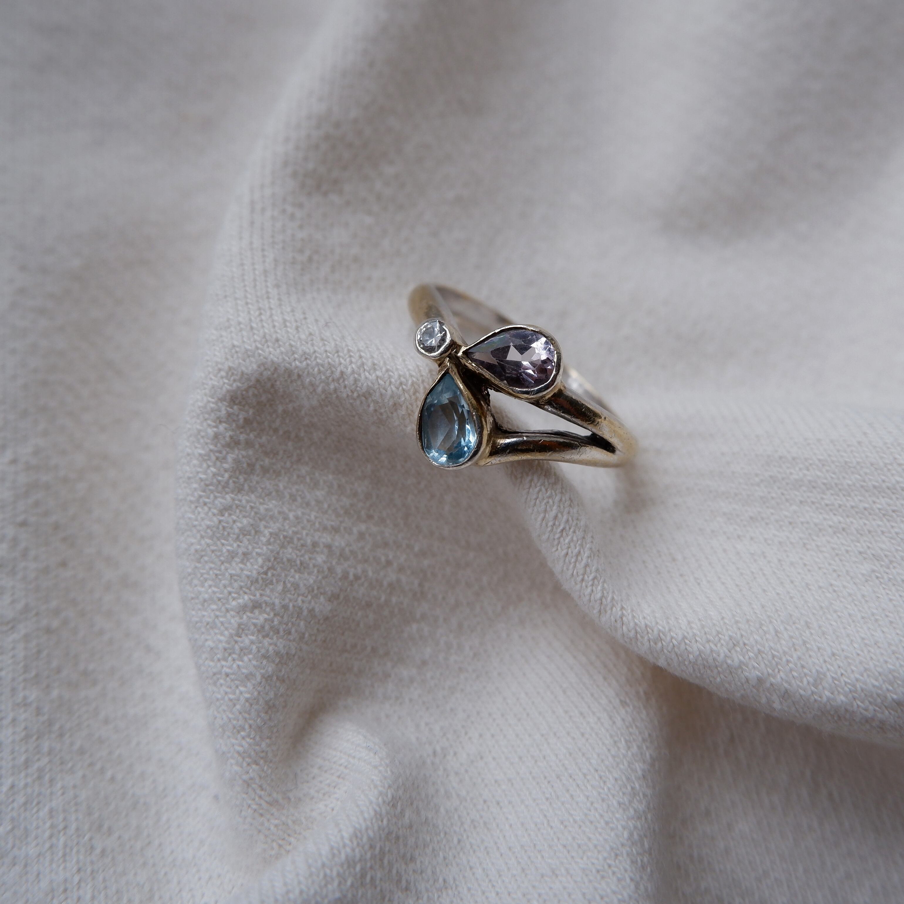アクアマリンとアメジスト、そしてジルコニア、3種の石が充てがわれています。