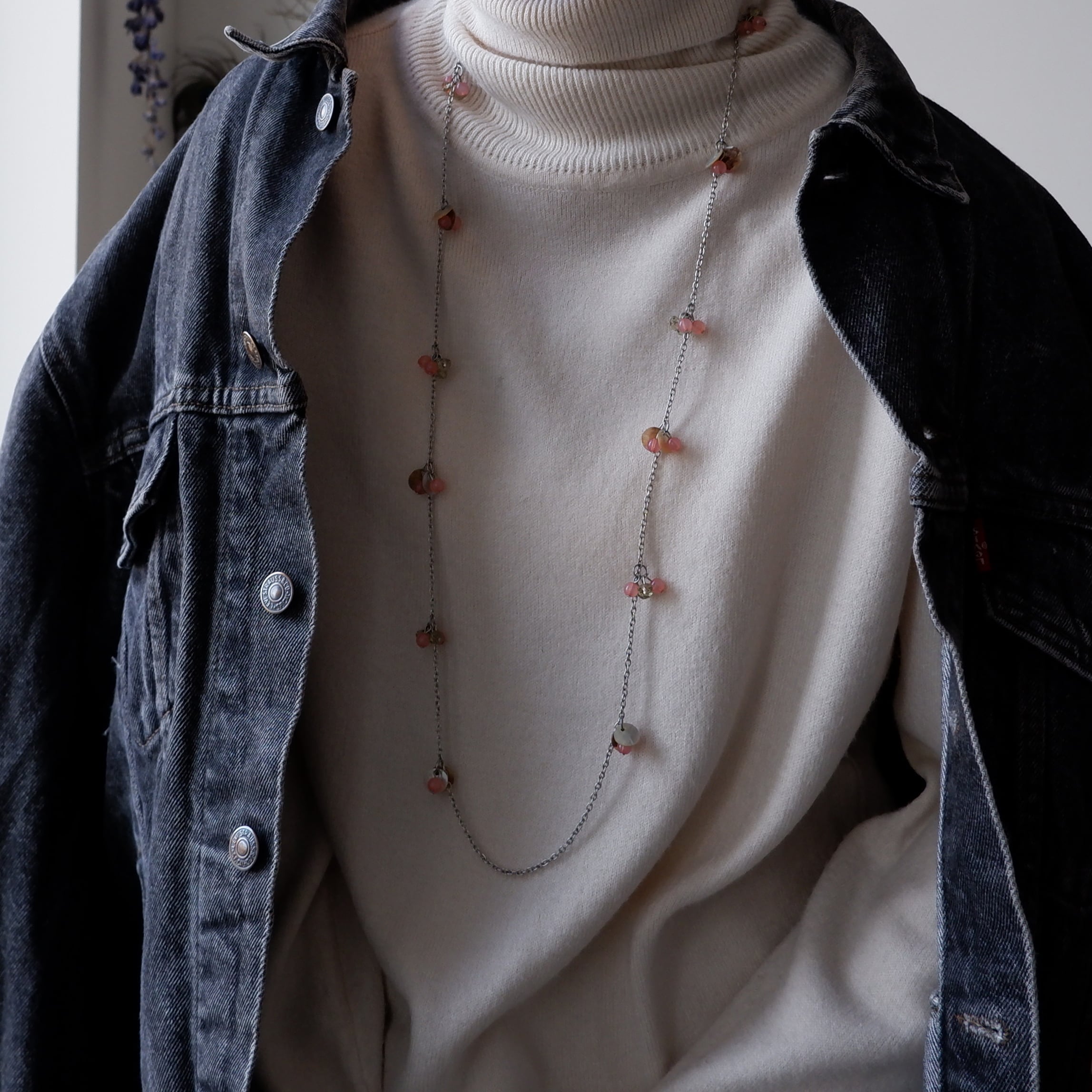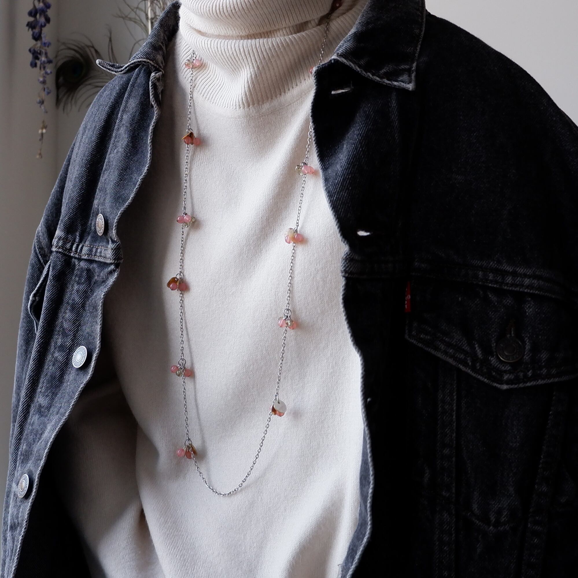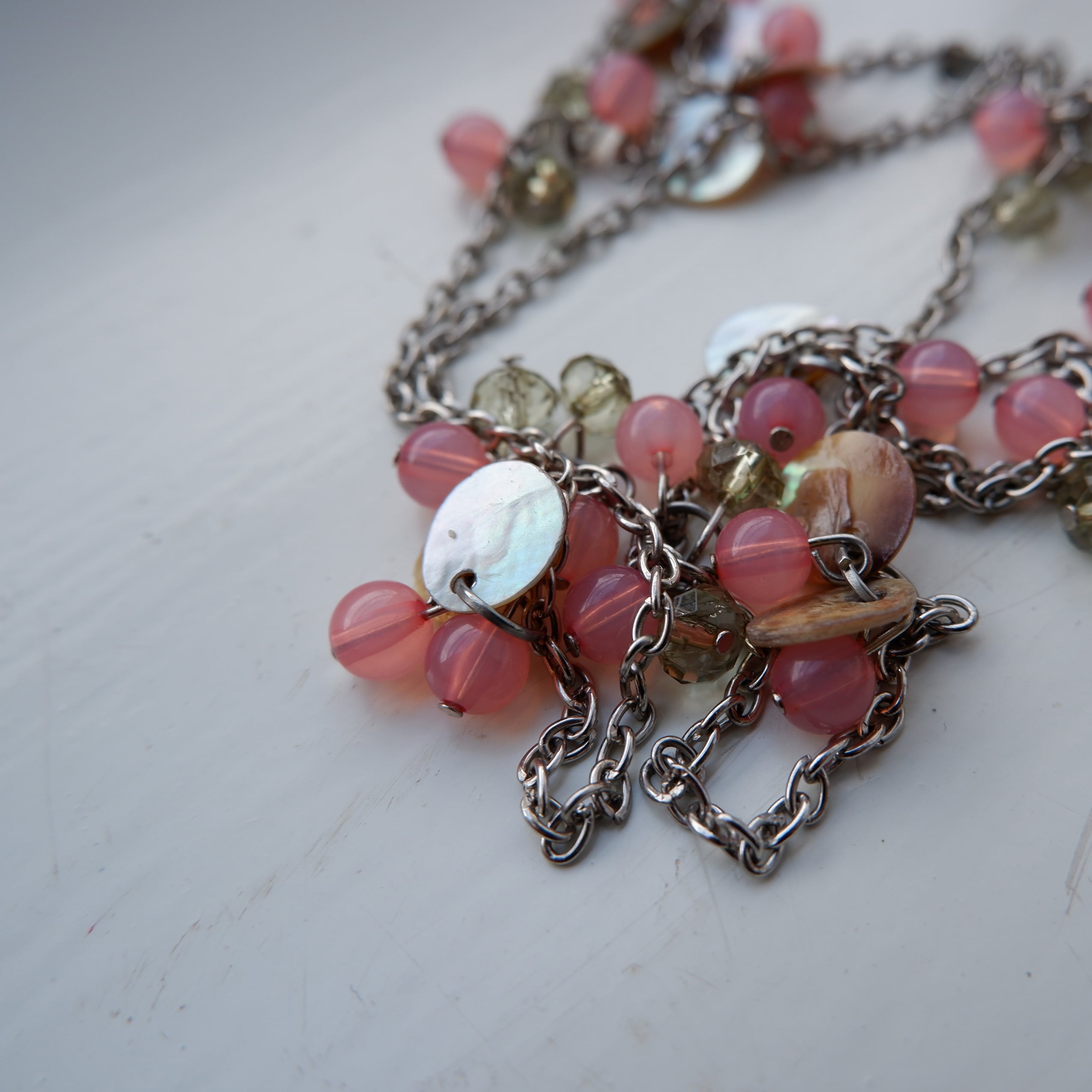 ピンク色のガラスビーズと天然貝のモチーフが並ぶ、可愛いデザインのロングネックレスです。