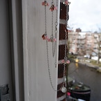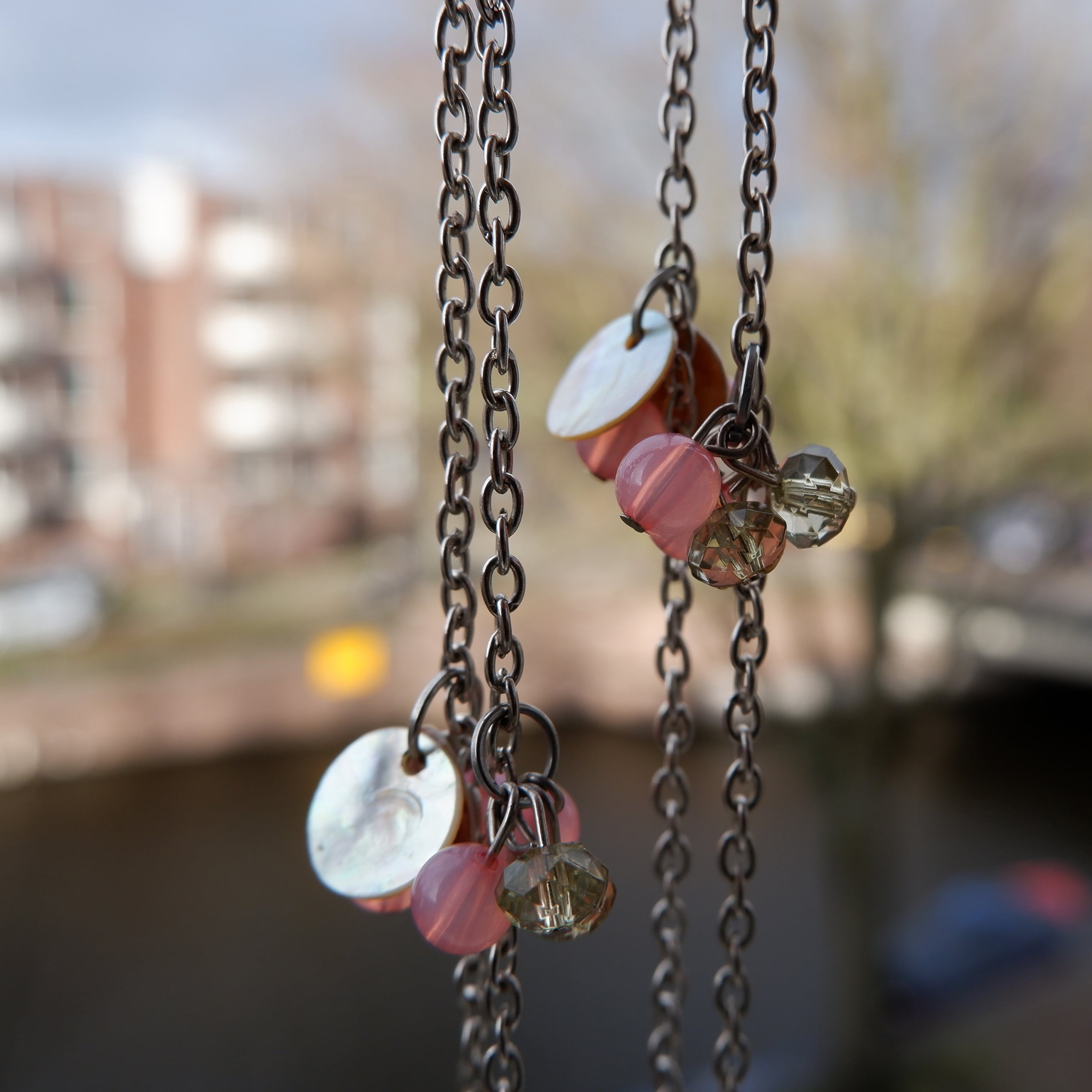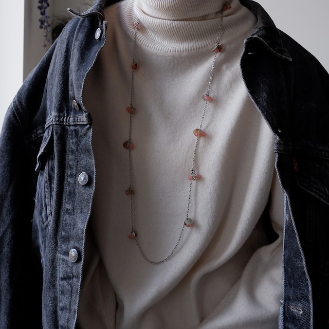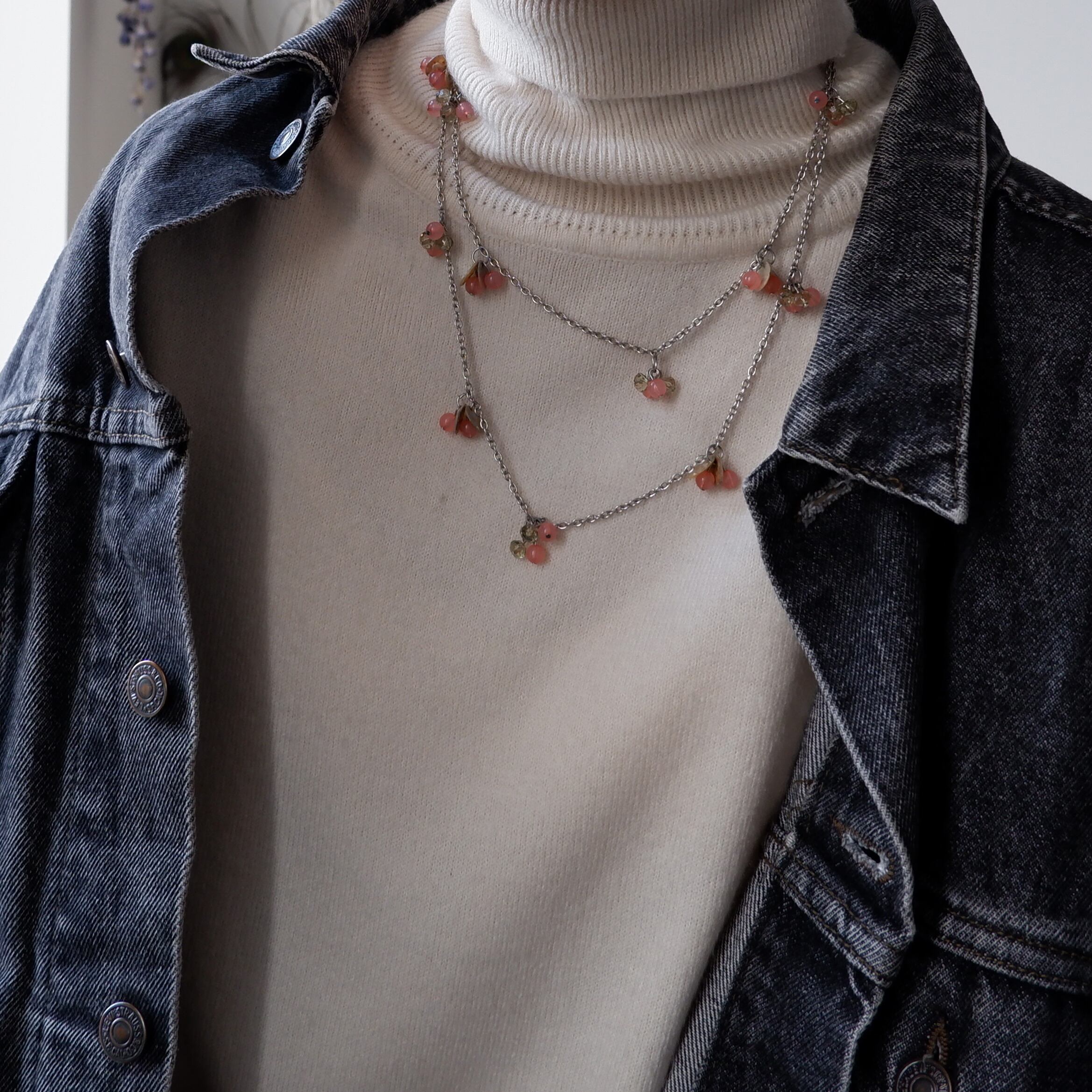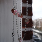 ピンク色のガラスビーズと天然貝のモチーフが並ぶ、可愛いデザインのロングネックレスです。