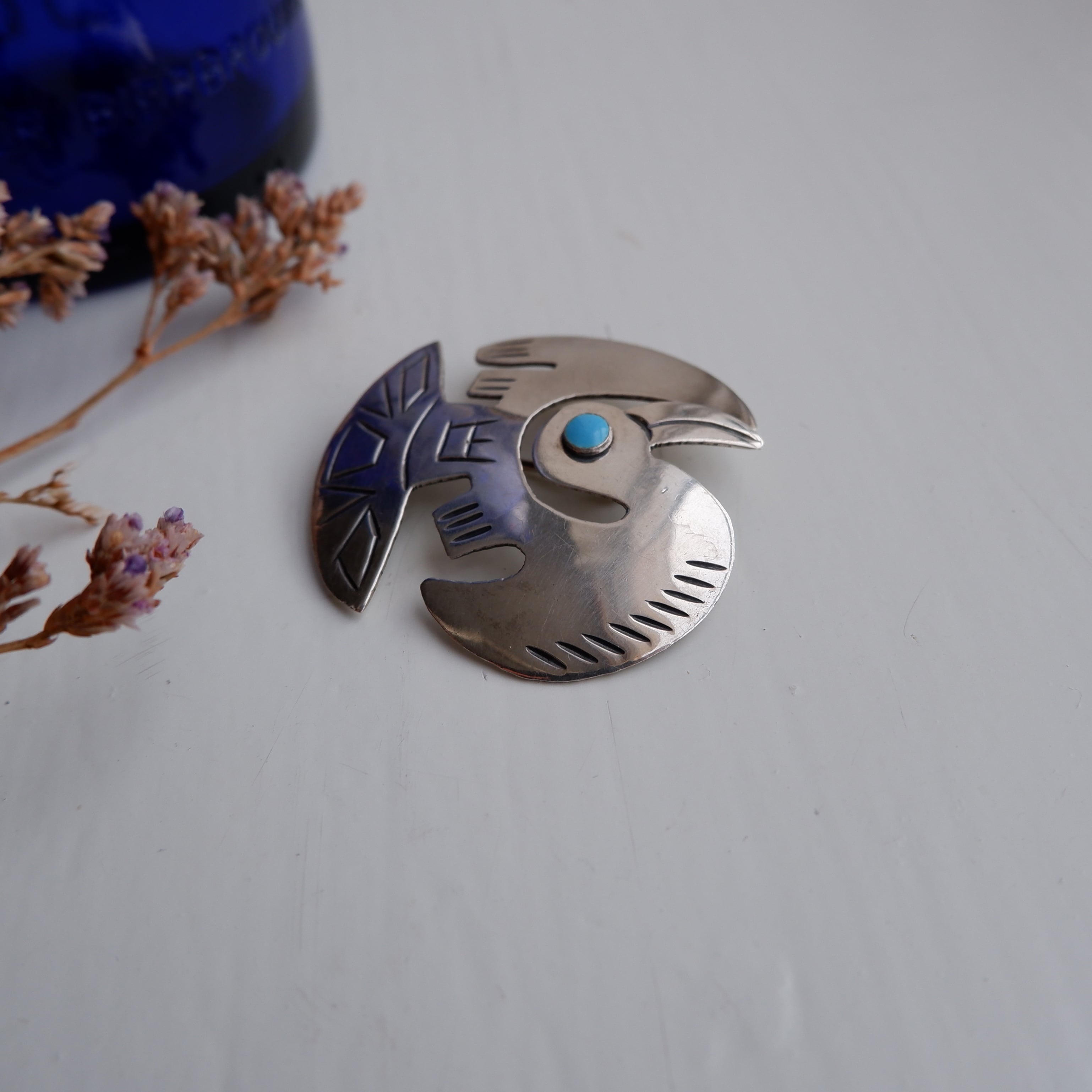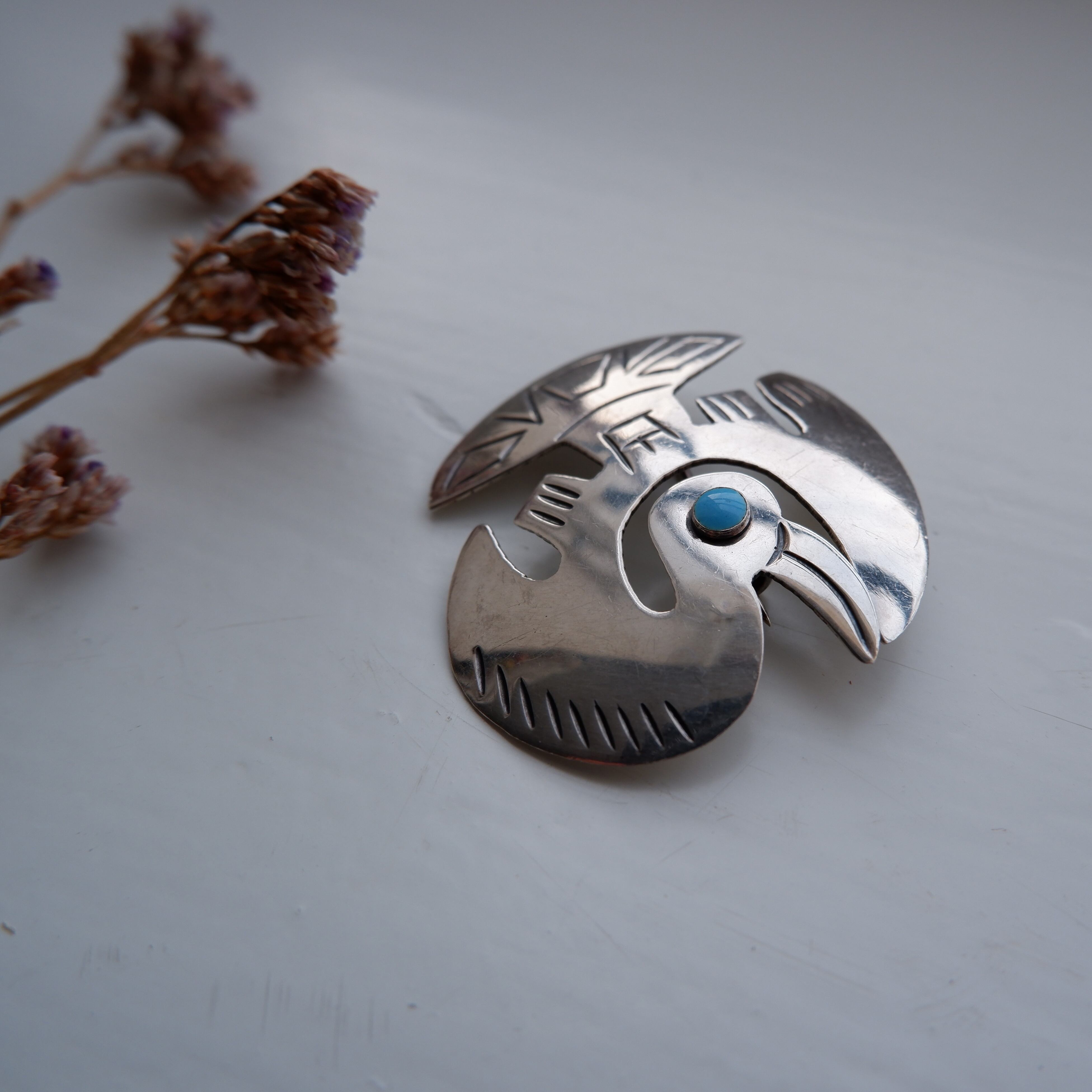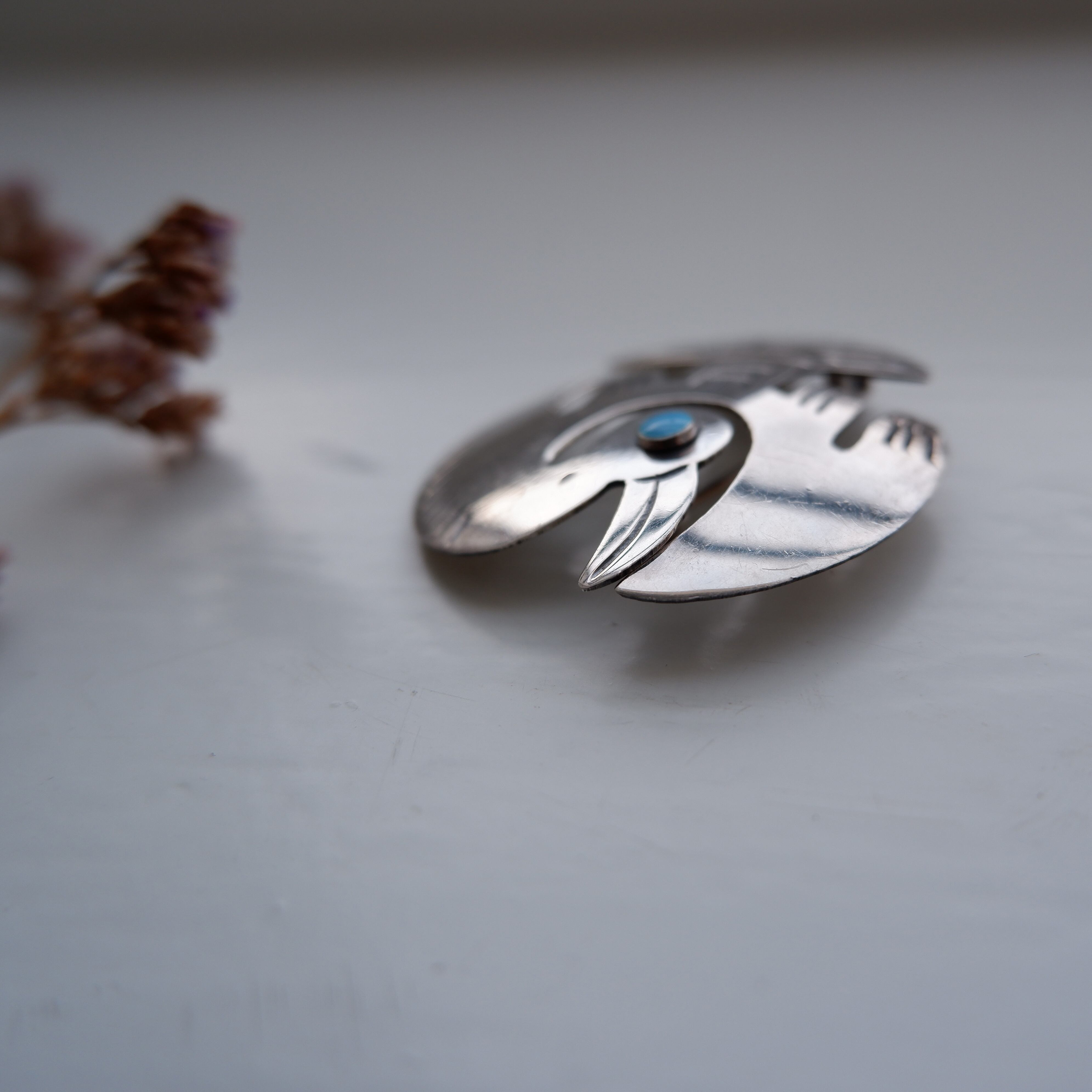 青い目が印象的な、鳥モチーフのシルバーブローチです。