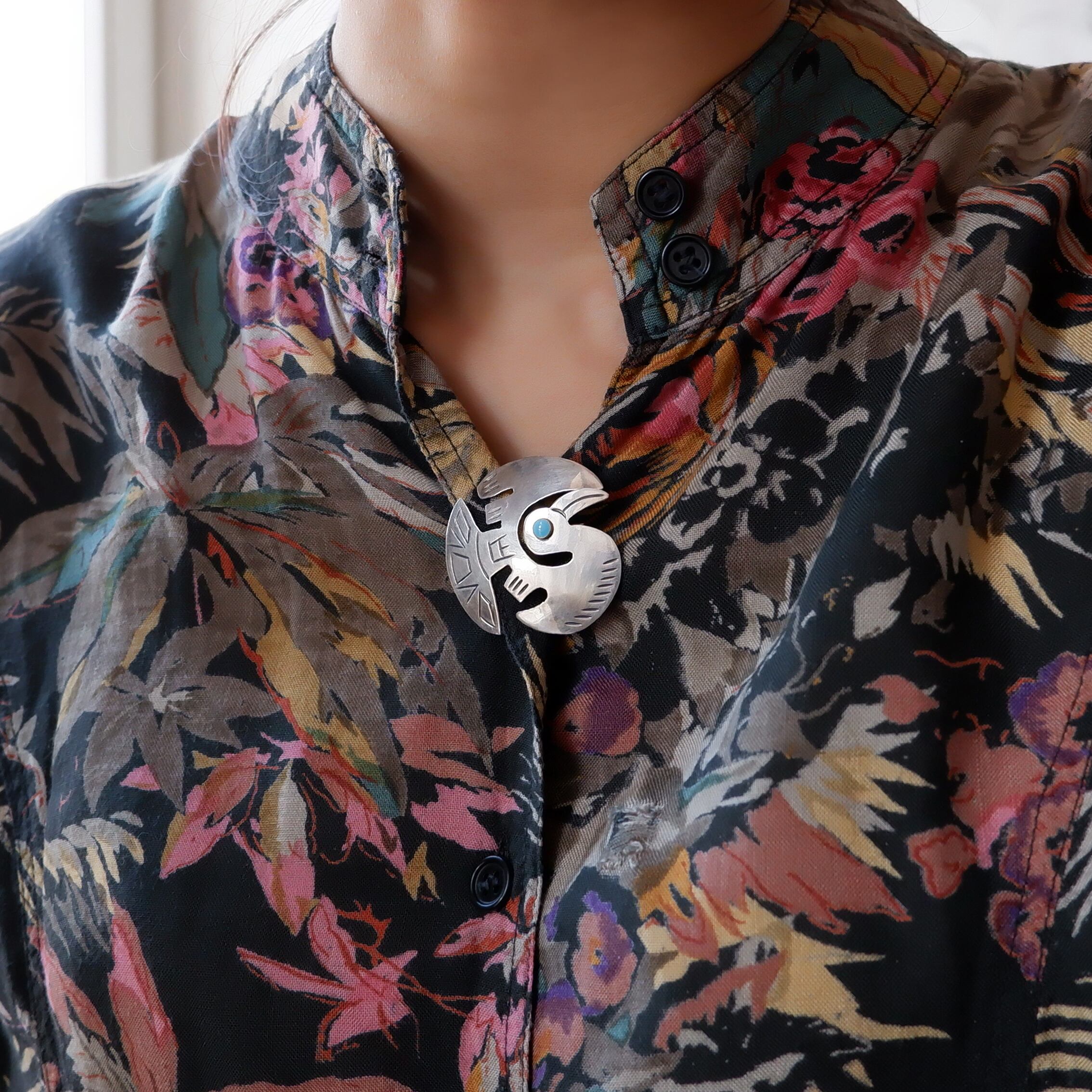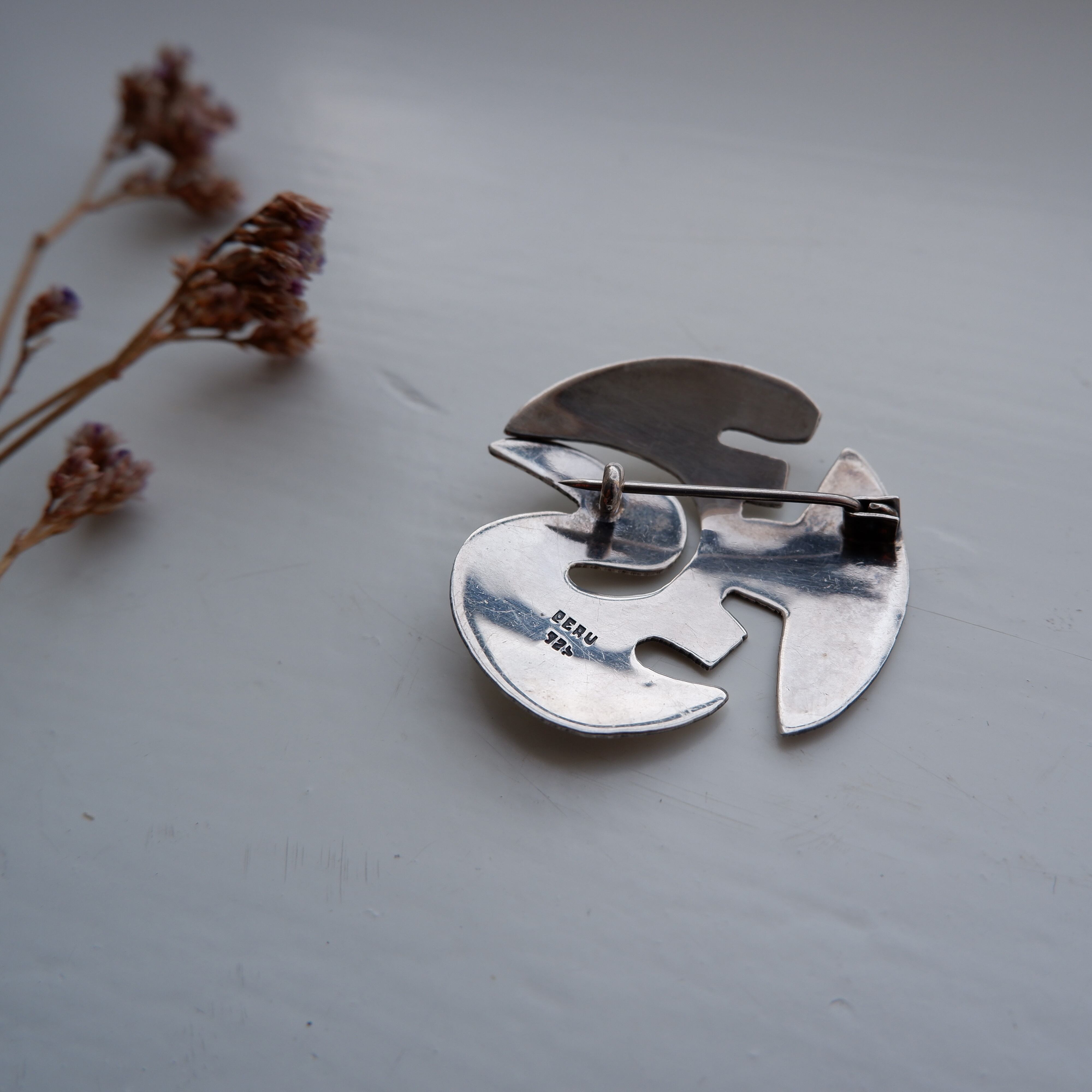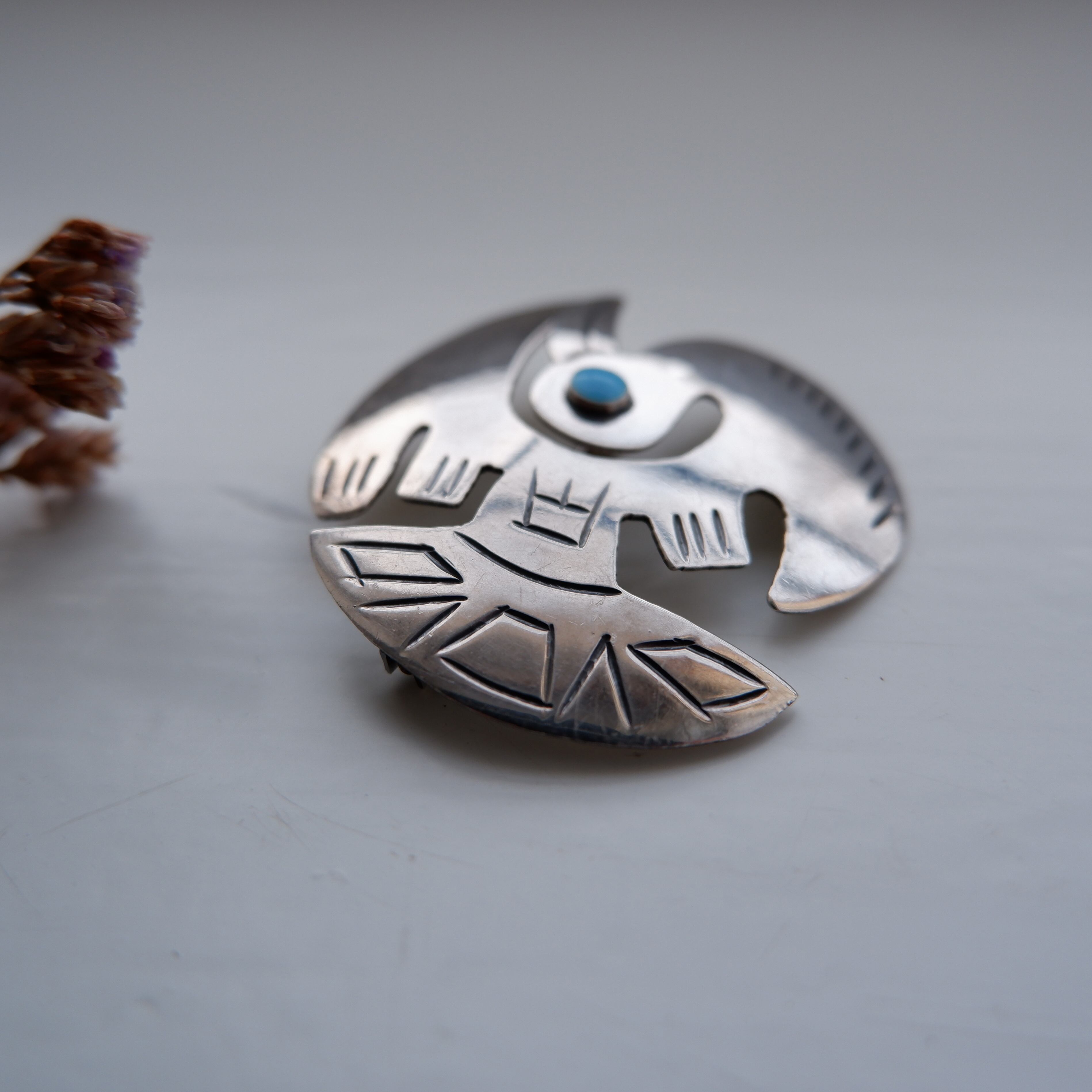 青い目が印象的な、鳥モチーフのシルバーブローチです。
