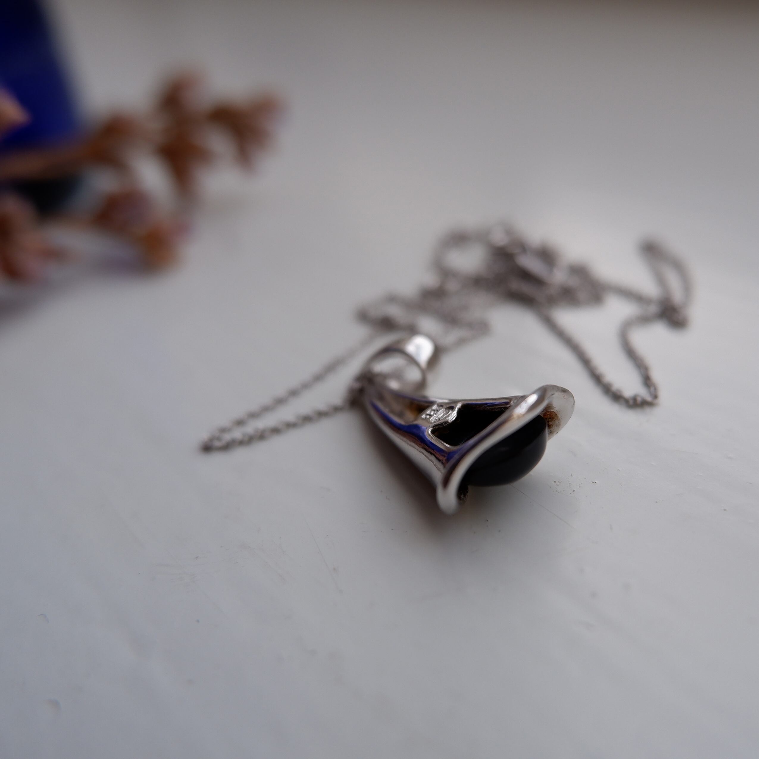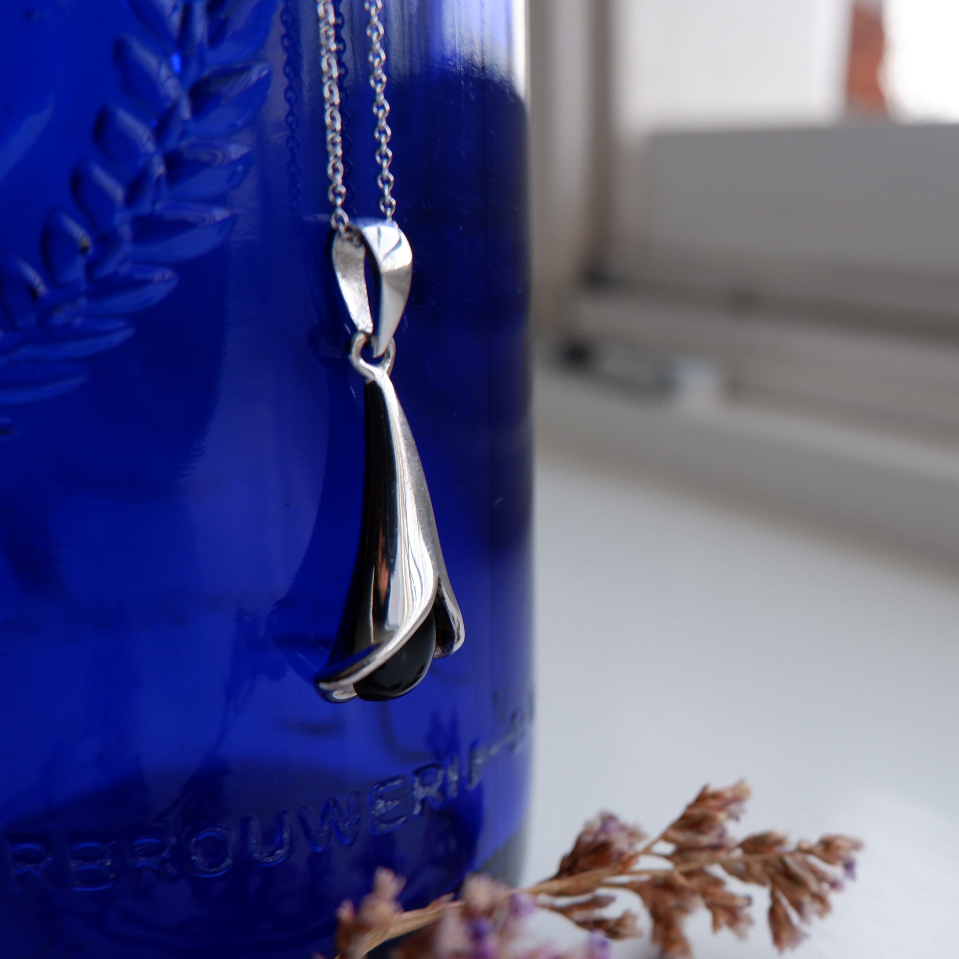 凛とした姿で知られる カラー のお花でしょうか。胸元でモチーフが揺れる姿が可愛いです。