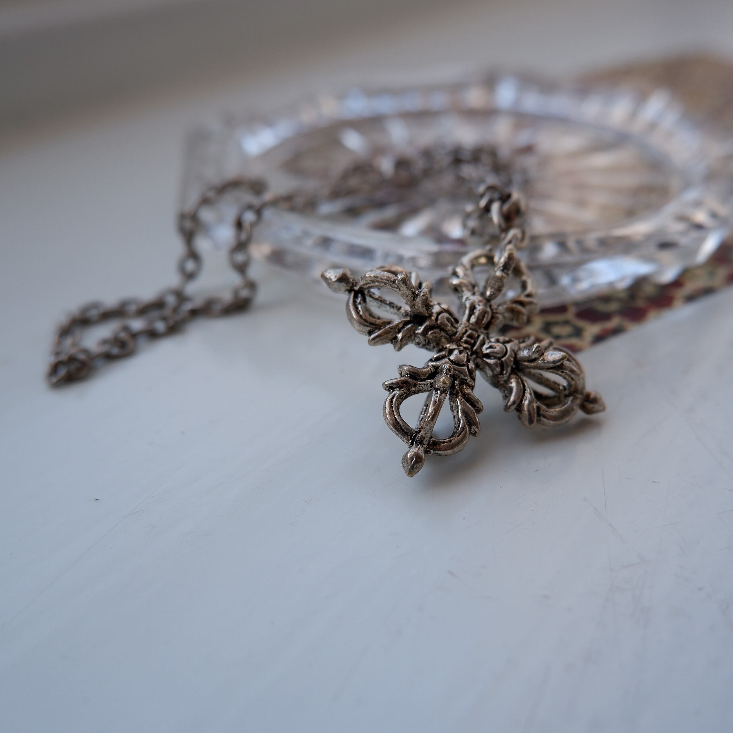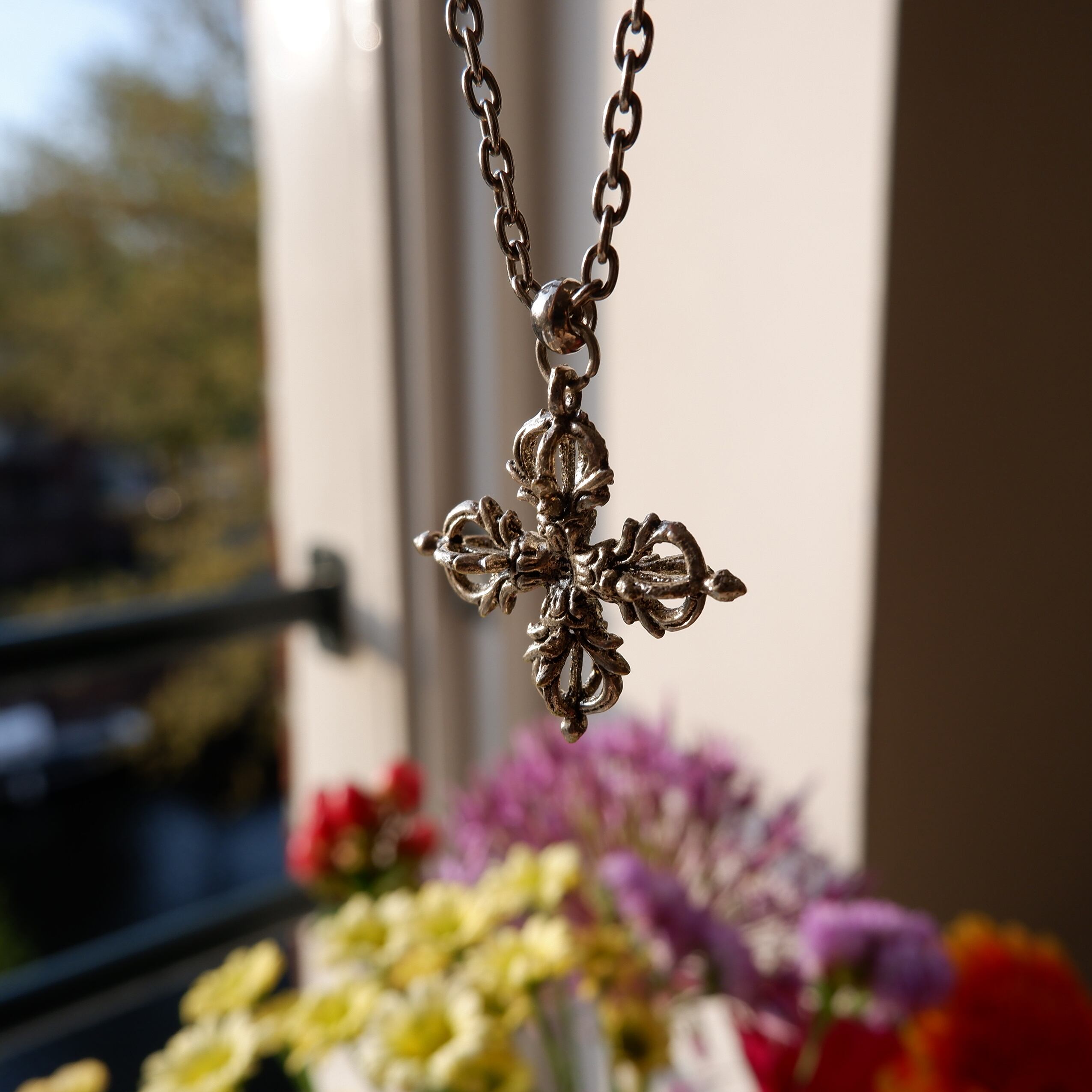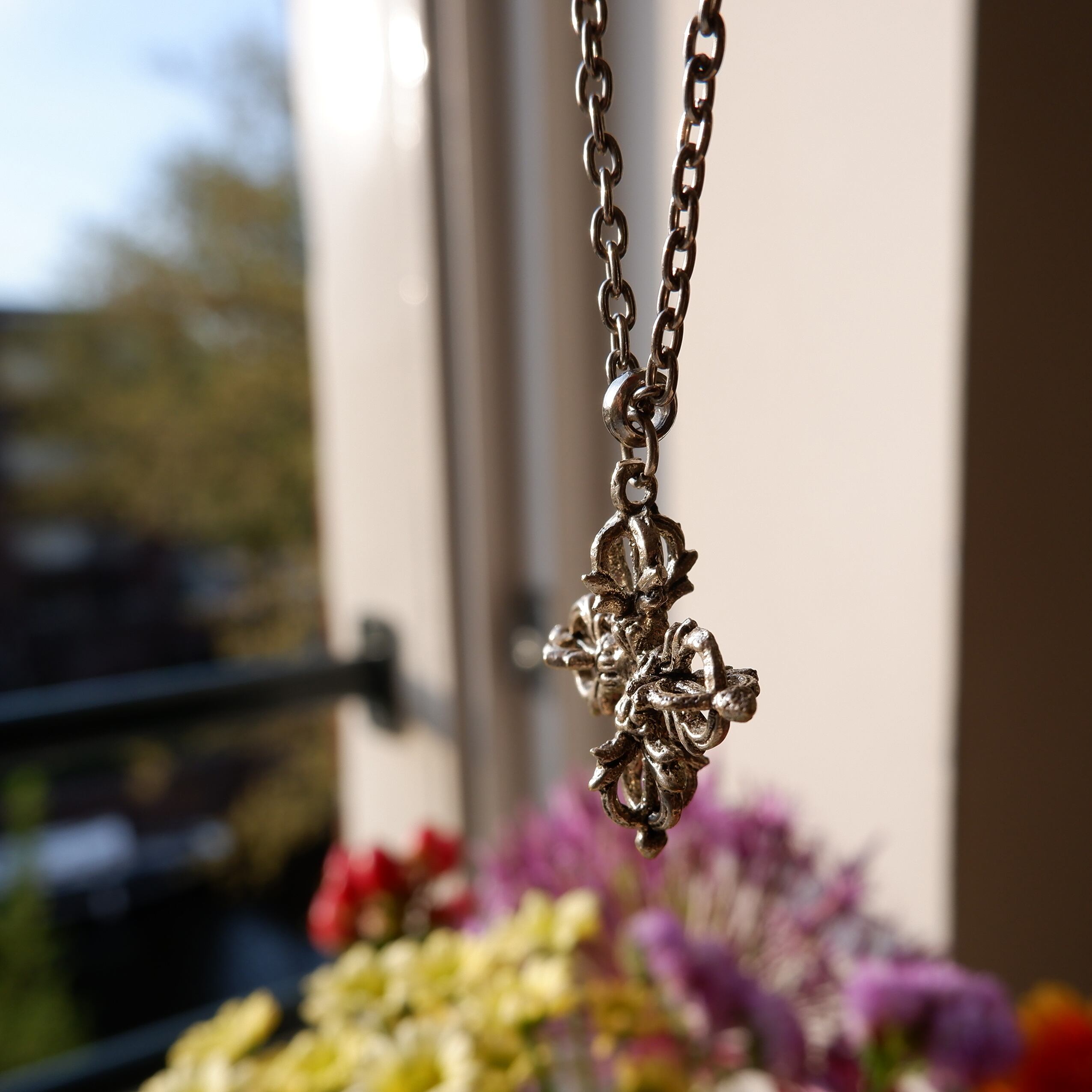 細かな彫金が美しい十字架モチーフがペンダントとなっています。