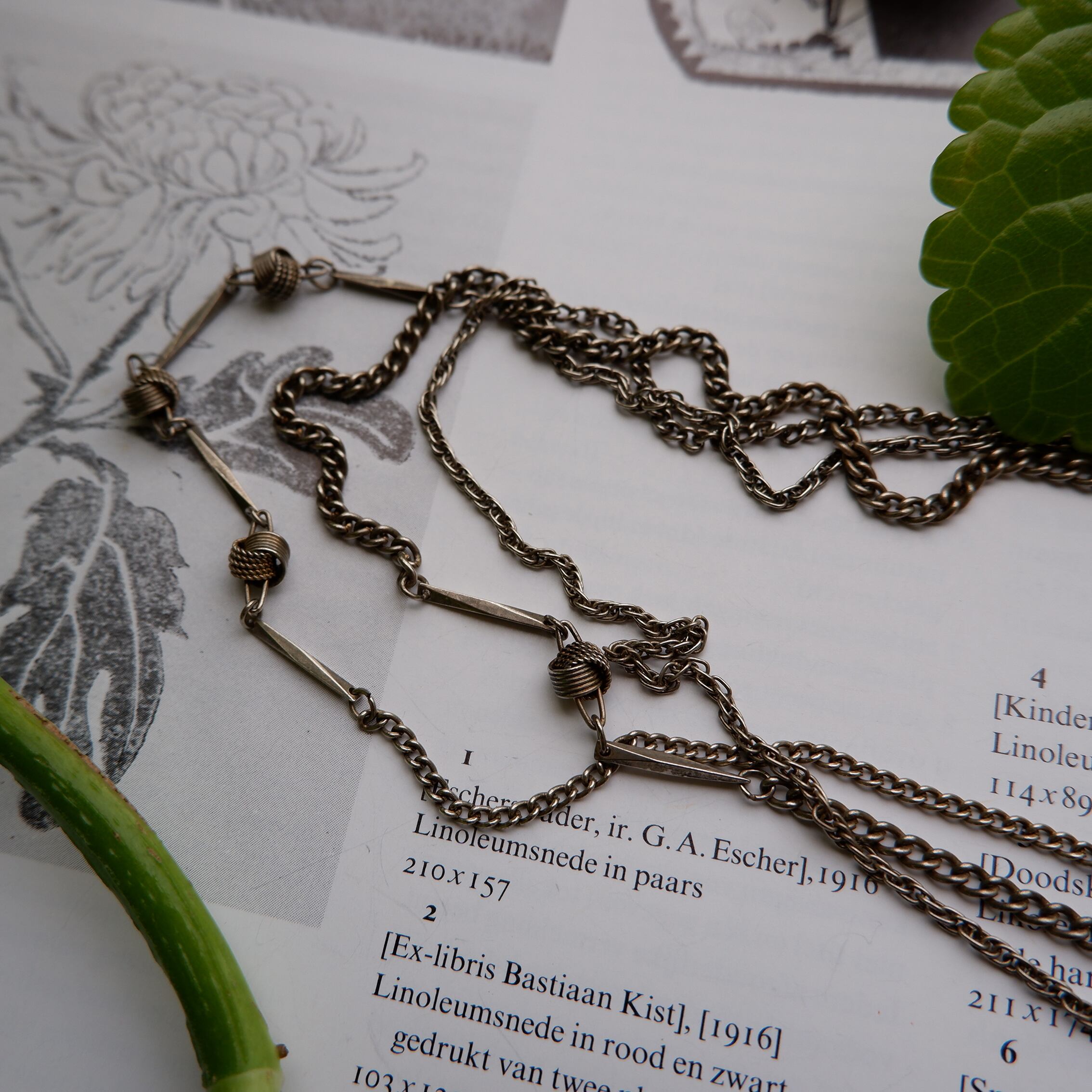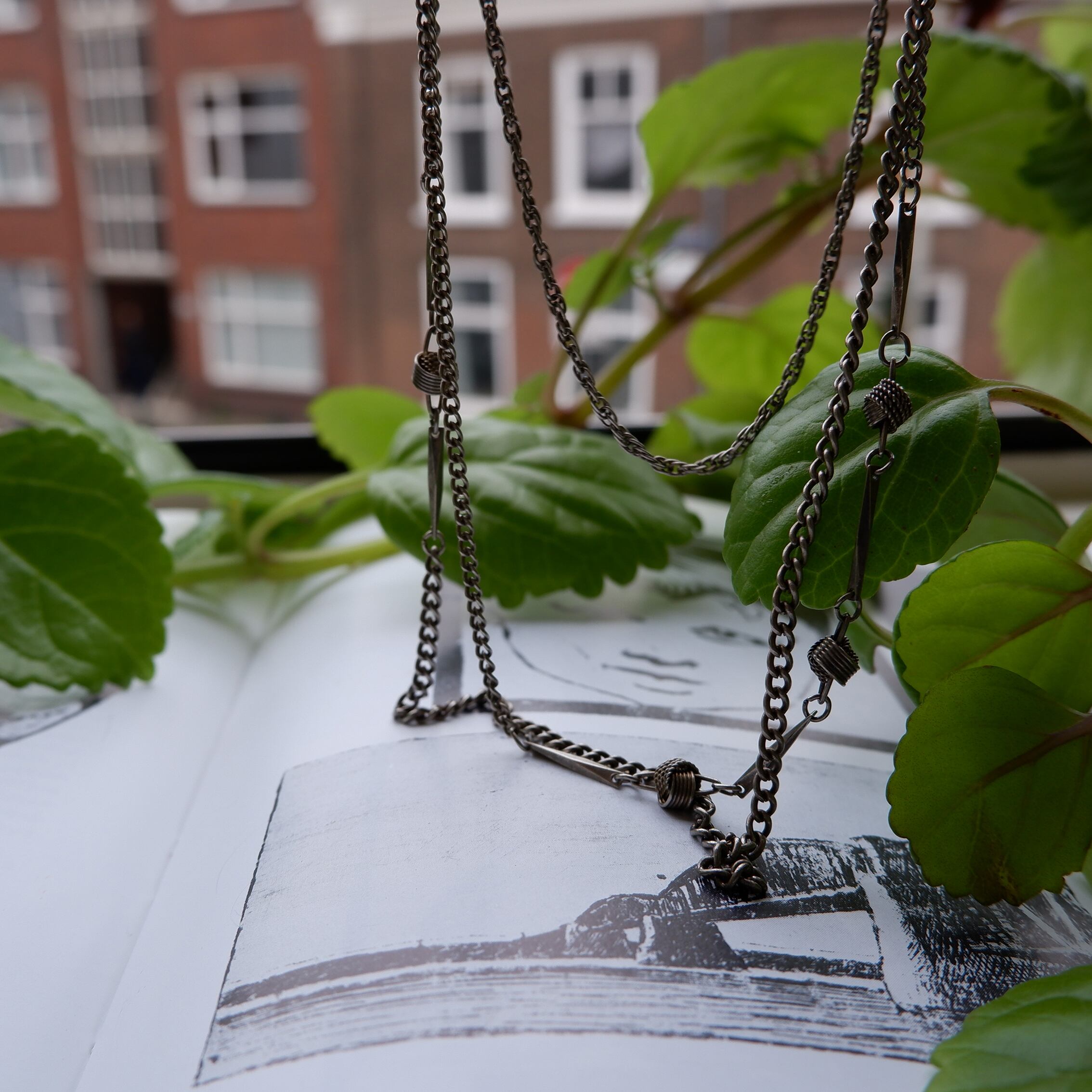 ノットモチーフがあてがわれていたり、変形チェーンが混ざっていたり、3本それぞれが違ったデザインで構成されていたり、、素敵なポイントがいくつも詰まった可愛いデザインの一品です。